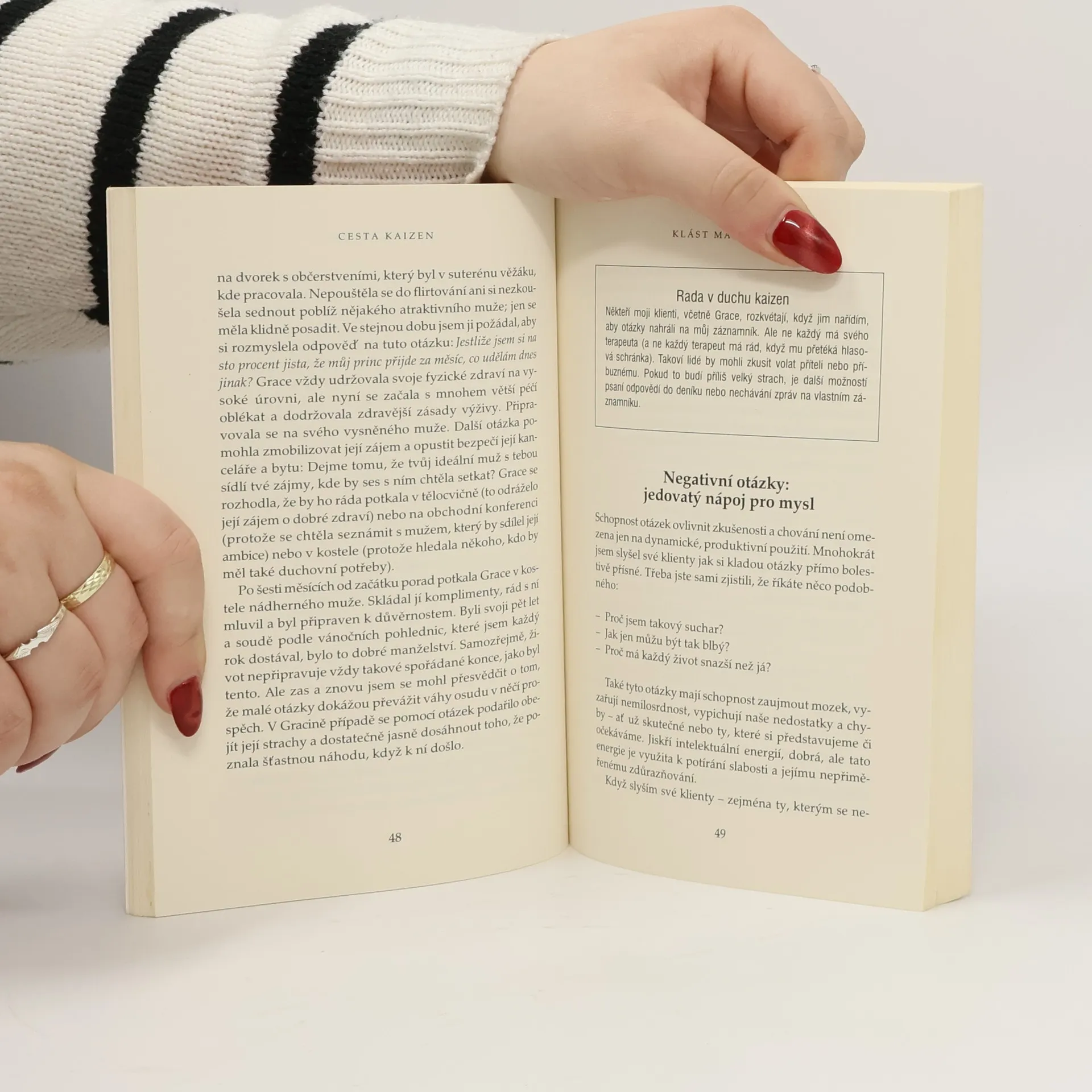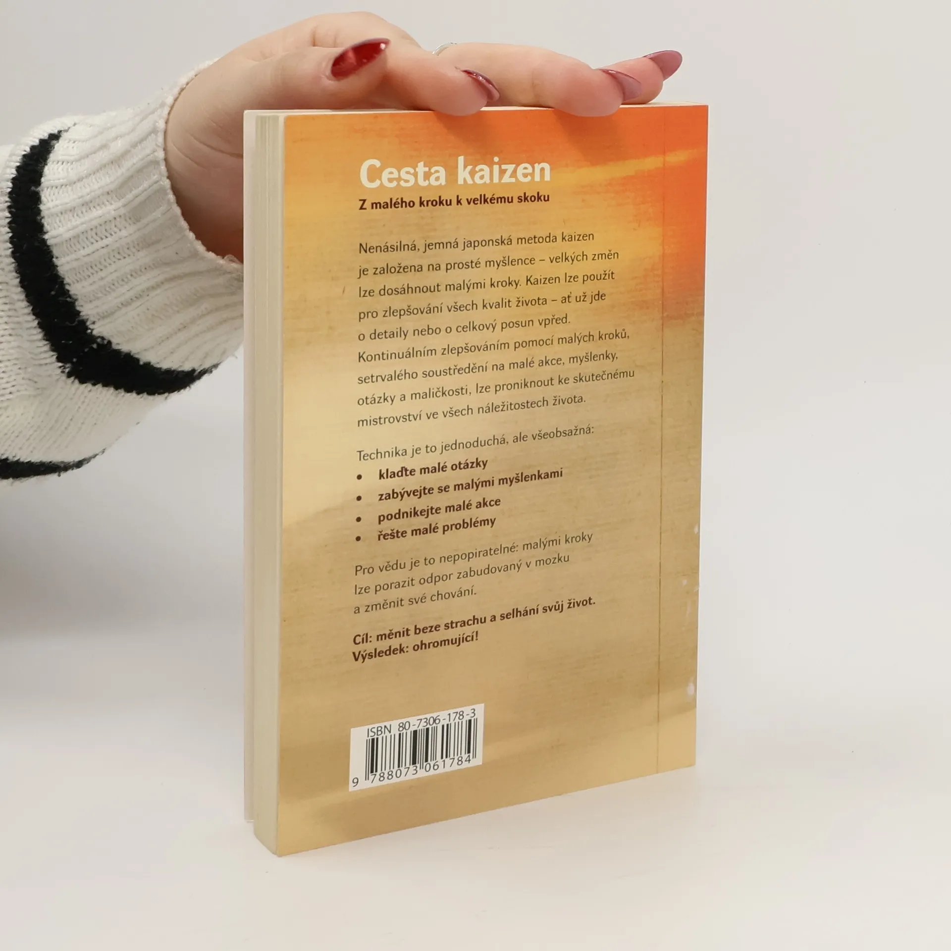 Z malého kroku k velkému skoku Nenásilná, jemná japonská metoda kaizen je založena na prosté myšlence - velkých změn lze dosáhnout malými kroky. Kaizen lze použít pro zlepšování kvalit života - ať už jde o detaily nebo o celkový posun vpřed. Kontinuálním zlepšováním pomocí malých kroků a setrvalého soustředění na malé akce, myšlenky, otázky a maličkosti, lze proniknout ke skutečnému mistrovství ve všech náležitostech života. Technika je jednoduchá a spočívá v těchto bodech: - klaďte malé otázy - zabývejte se malými myšlenkami - podnikejte malé akce - řešte malé problémy Cílem je měnit beze strachu a selhání svůj život. Výsledek vás překvapí.