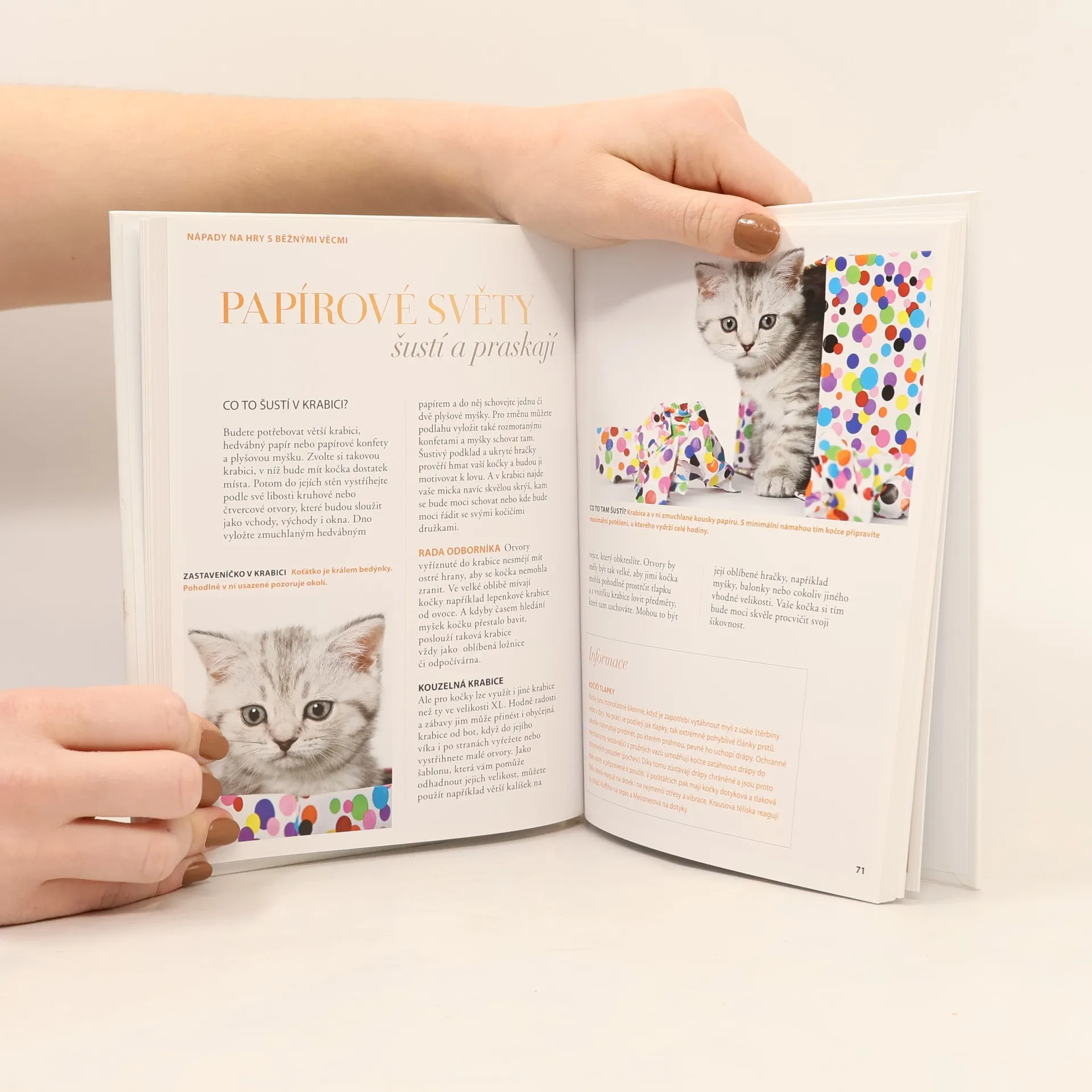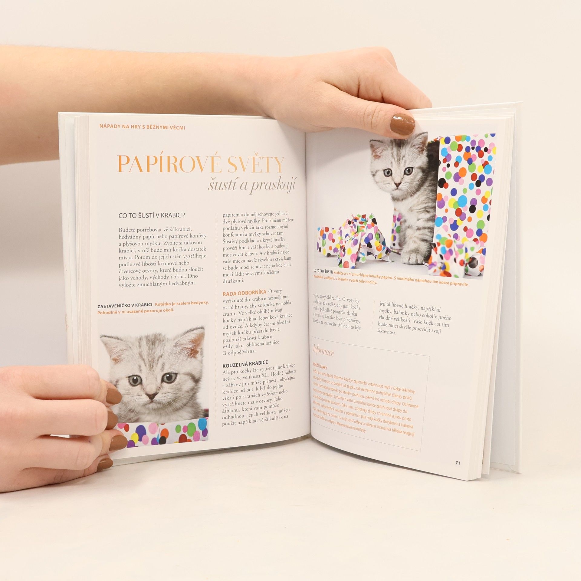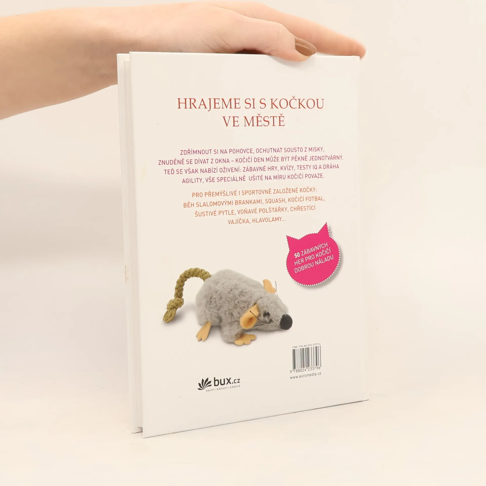 50 zábavných her pro kočky, které žijí ve městě: běh slalomovými brankami, squash, fotbal, šustivé pytle, voňavé polštářky, chřestící vajíčka, hlavolamy... Dozvíte se, jak kočkou hrou rozvíjet a jak ji zabavit především v městském bytě, kde často nemá dostatek podnětů.