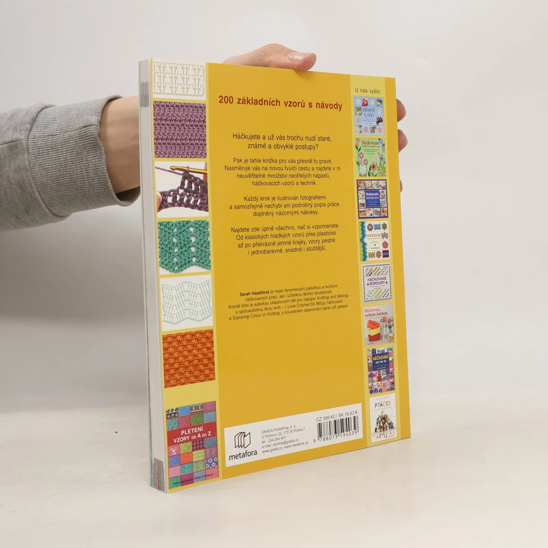 200 základních vzorů s návody Postupy, vzory, nové nápadité techniky - encyklopedie háčkování pro začátečníky i pokročilé. Háčkujete, a už vás trochu nudí staré, známé a obvyklé postupy? Pak je tahle knížka pro vás přesně to pravé. Nasměruje vás na novou tvůrčí cestu a najdete v ní neuvěřitelné množství neotřelých nápadů, háčkovacích vzorů a technik. Každý krok je ilustrován fotografiemi a samozřejmě nechybí ani podrobný popis práce doplněný názornými nákresy. Najdete zde úplně všechno, nač si vzpomenete. Od klasických hladkých vzorů přes plastické až po překrásné jemné krajky, vzory pestré i jednobarevné, snadné i složitější. Sarah Hazellová je nejen fenomenální pletařkou a tvůrkyní háčkovaných prací, ale i učitelkou těchto dovedností.