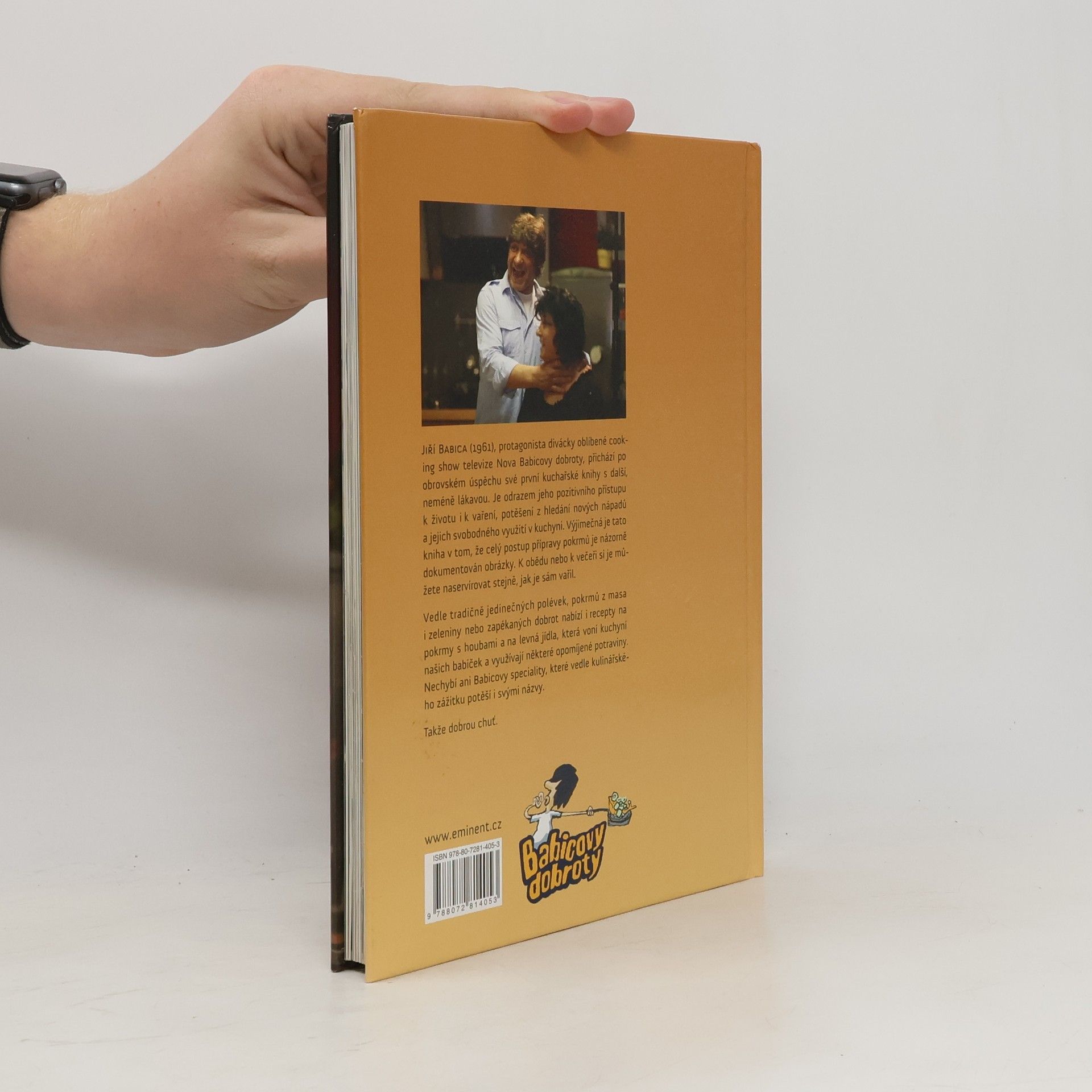 Jiří Babica (1961), protagonista oblíbené cooking show Babicovy dobroty televize Nova, přichází po obrovském úspěchu první se svojí další kuchařskou knihou. Je naplněna jeho pozitivním přístupem k životu i k vaření, potěšením z hledání nových nápadů a jejich svobodným využitím v kuchyni. Výjimečná je v tom, že přináší názorné postupy, které dokumentují celou přípravu jídel. K obědu nebo k večeři si je můžete naservírovat stejně, jak je sám vařil. Vedle tradičně jedinečných polévek, pokrmů z masa i zeleniny nebo zapékaných dobrot nabízí i recepty na pokrmy s houbami a levná jídla, která voní kuchyní našich babiček a využívají některé opomíjené potraviny. Nechybí ani Babicovy speciality, které vedle kulinářského zážitku potěší i svými názvy. Takže dobrou chuť.