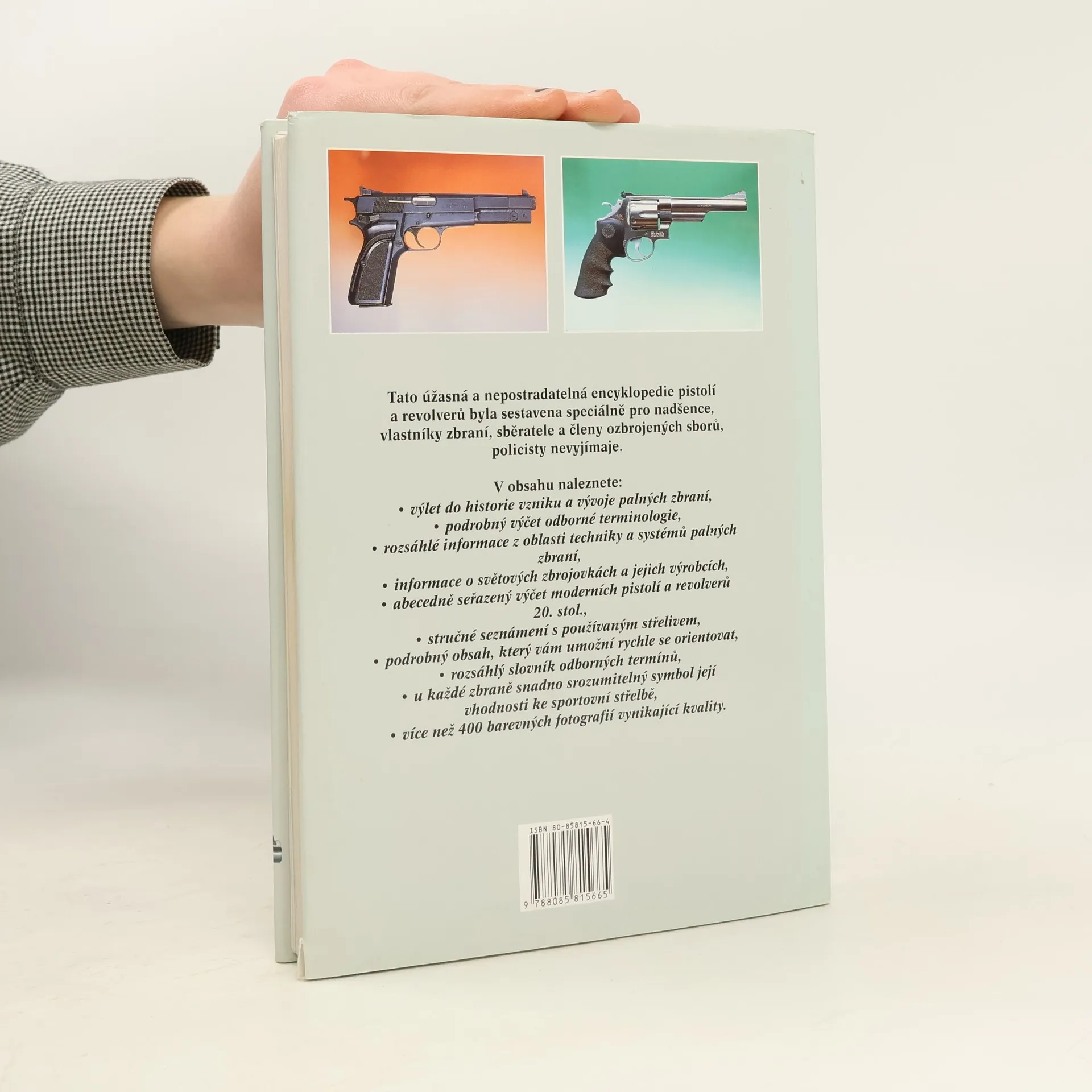 Tato úžasná a nepostradatelná ecyklopedie pistolí a revorverů byla sestavena speciálně pro nadšence, vlastníky zbraní, sběratele a členy ozbrojených sborů, policisty nevyjímaje. V prvních kapitolách je stručné uveden vývoj palných zbraní. Kniha se detailně zabývá současnou terminologií zbraní a také bezpečností jejich užívání. Největší část knihy je věnována technickým údajům současných, ve světě vyráběných pistolí a revorverů, rozdělených podle typu a modelu. Je doplněna více než 400 barevných fotografiemi vysoké kvality. Profesionál v oboru zbraní se bez této knihy neobejde. Neměla by chybět ani na žádném oddělení policie.
