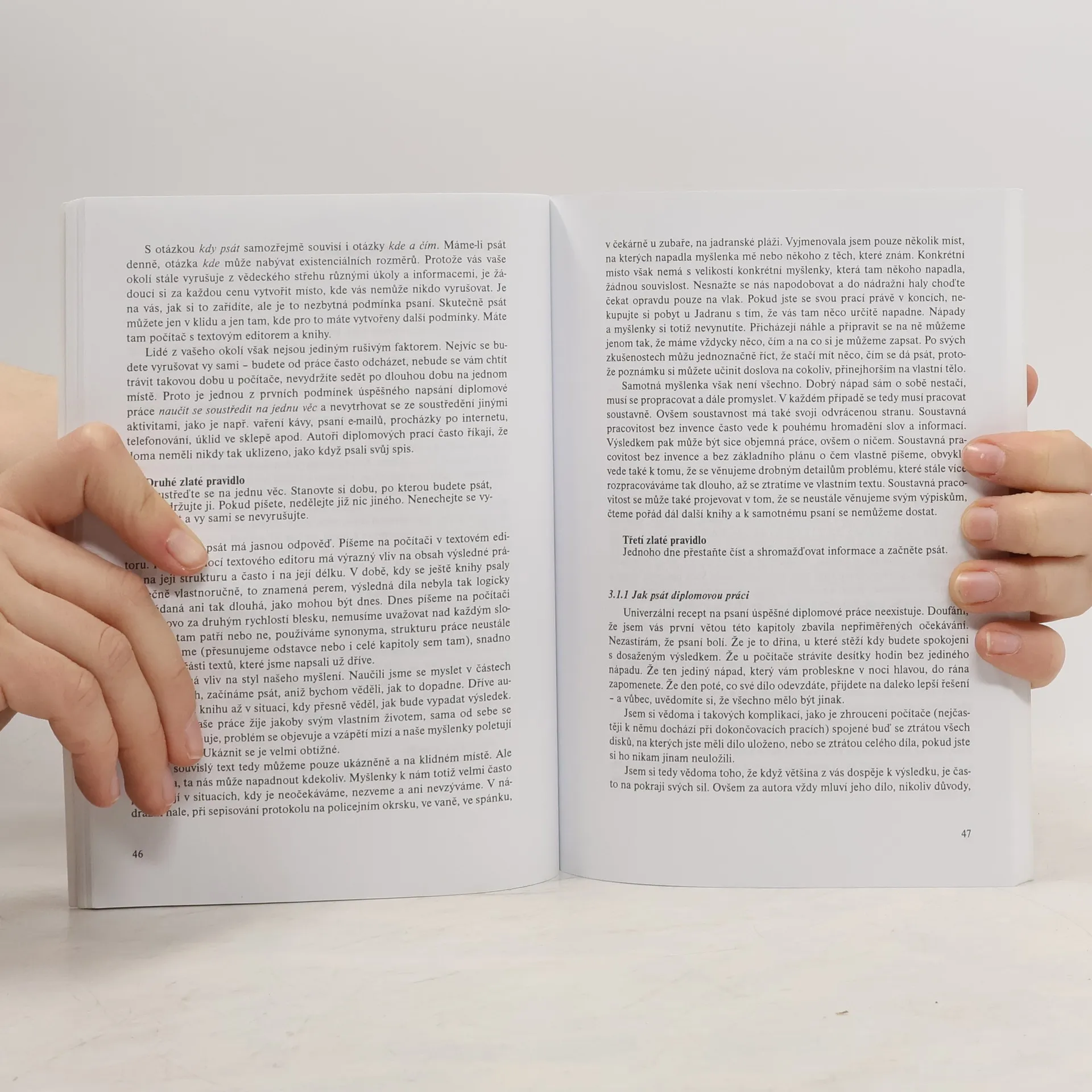 Tato rukověť, tedy praktická příručka, je určena studentům společenskovědních a humanitních oborů, kteří se chtějí a potřebují naučit napsat odborný text. V rukověti jsou uvedeny příklady psaní různých forem odborných textů. V první kapitole věnované autorům a odborným textům se dozvíte, proč studenti, učitelé a vědci píšou odborné texty. Druhá kapitola se věnuje volbě problému diplomové práce. Třetí kapitola pojednává o zásadách týkajících se obsahové stránky diplomové práce, čtvrtá se věnuje zásadám formální úpravy diplomové práce. Pátá kapitola je věnována dokončovacím pracím na diplomové práci, tedy její kompletaci.