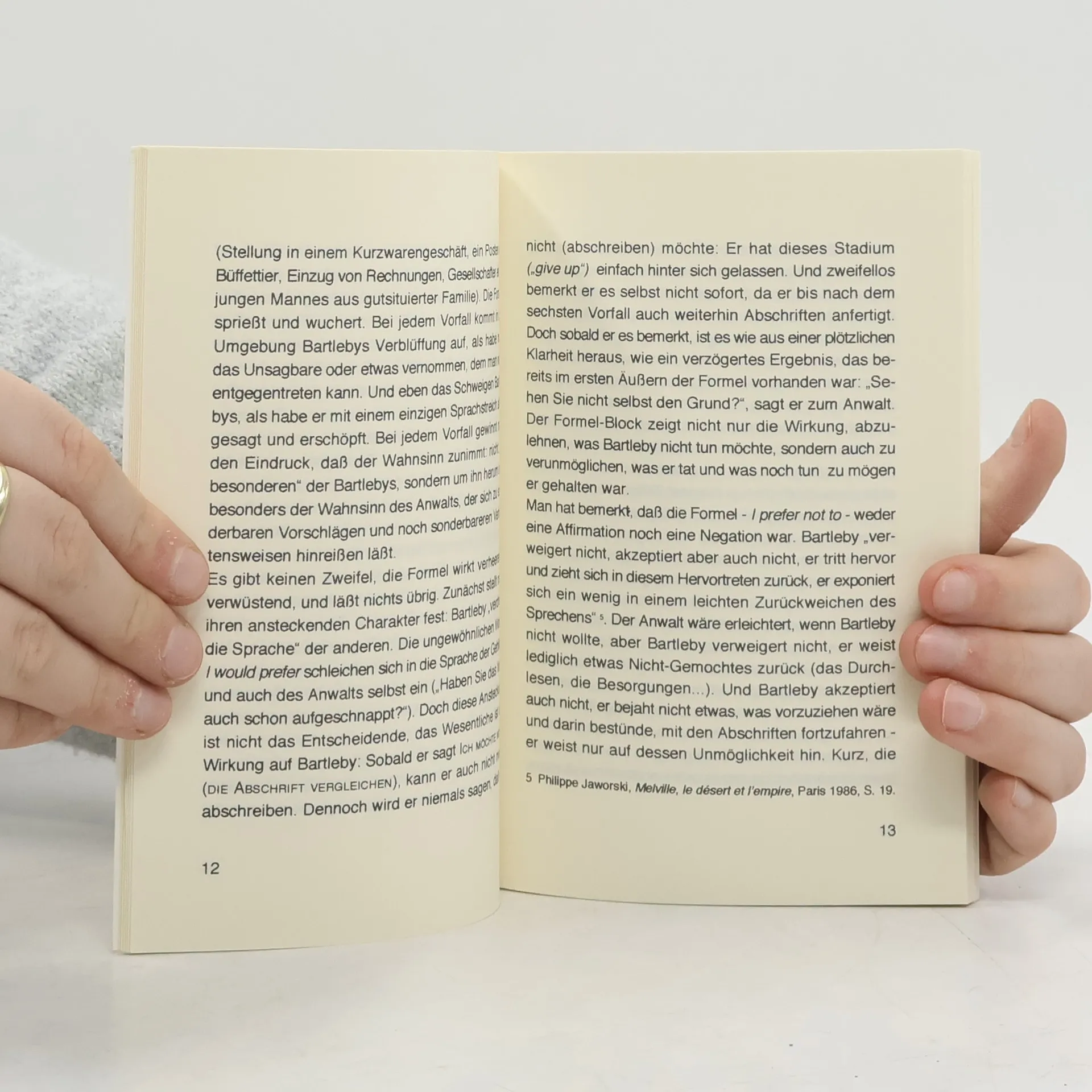 „Deleuze ist der Anwalt Bartlebys, weil er sich bereits im ersten Satz seines Plädoyers von den Gedankenlosigkeiten distanziert, Bartleby als eine ‚Metapher des Schriftstellers’ oder als ‚Symbol von irgend etwas’ zu vereinnahmen. Es ist die Bilanz einer unangestrengt literaturimmanenten, gleichsam handwerklich belesenen Beweisführung …“(Hermann Wallmann, SZ)