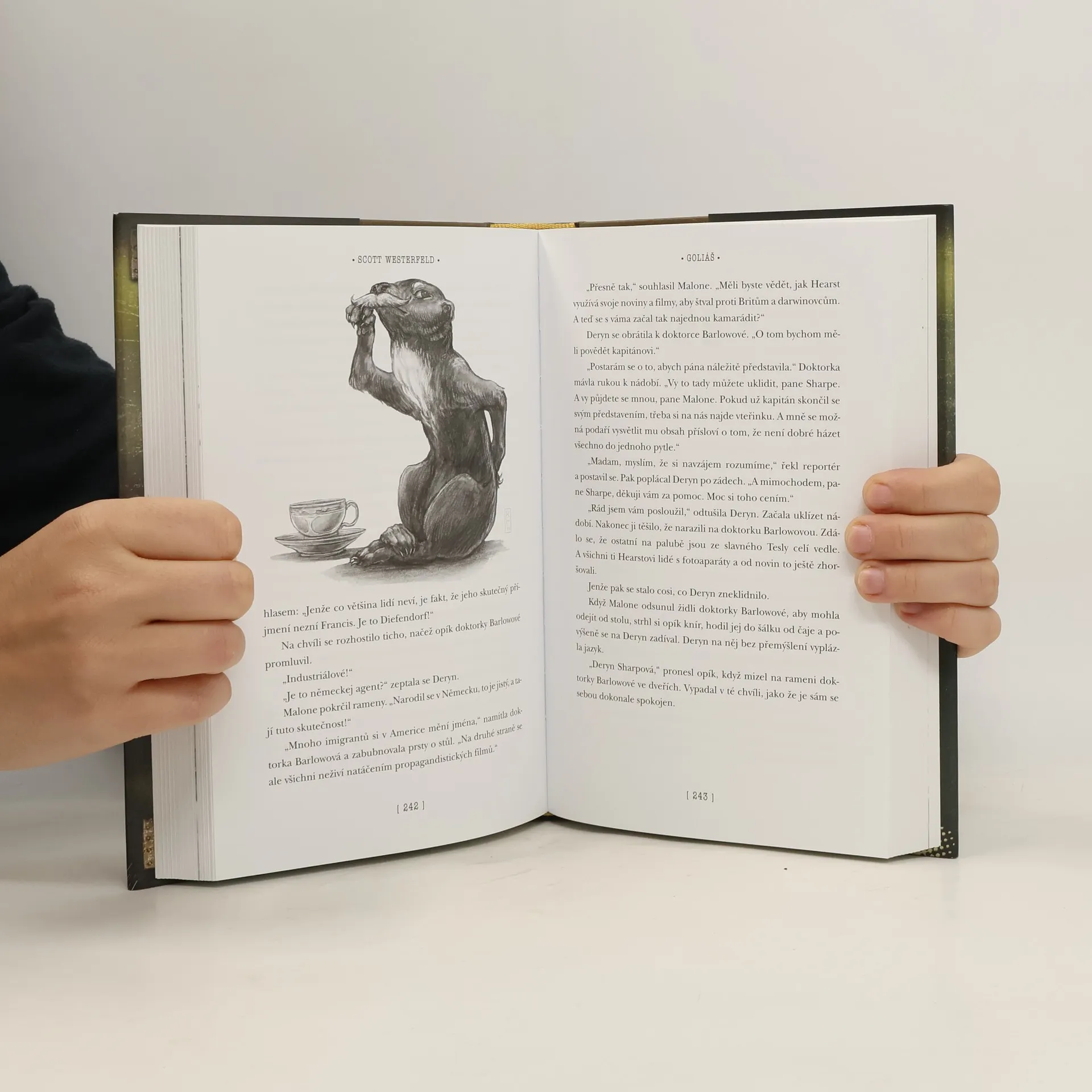 Třetí, závěrečný díl trilogie o dobrodružstvích statečné skotské dívky Deryn Sharpové, které v převlečení za chlapce čelí na palubě vzducholodi Leviatan nejen úkladům nepřátel, ale i úkladům tajné lásky k Alekovi, mladičkému dědici habsburského trůnu. Alek a Deryn se znovu ocitli na palubě Leviatanu. Vzducholoď dostala rozkaz vzít na palubu pozoruhodného cestujícího. Geniální, ale zároveň napůl šílený vynálezce tvrdí, že sestrojil mocnou zbraň jménem Goliáš, která dokáže v jediném okamžiku ukončit válku. Na čí straně však objevitel ve skutečnosti stojí? Během této přísně tajné mise Alek konečně odhalí skutečnou totožnost Deryn. Není to však její jediné tajemství. Deryn totiž chová k dědici habsburského trůnu něžné city. Alek se musí odhodlat k dalšímu kroku, na němž závisí všechno - jeho trůn, naplněná láska k prosté, ale statečné dívce i zničení velkého evropského města.