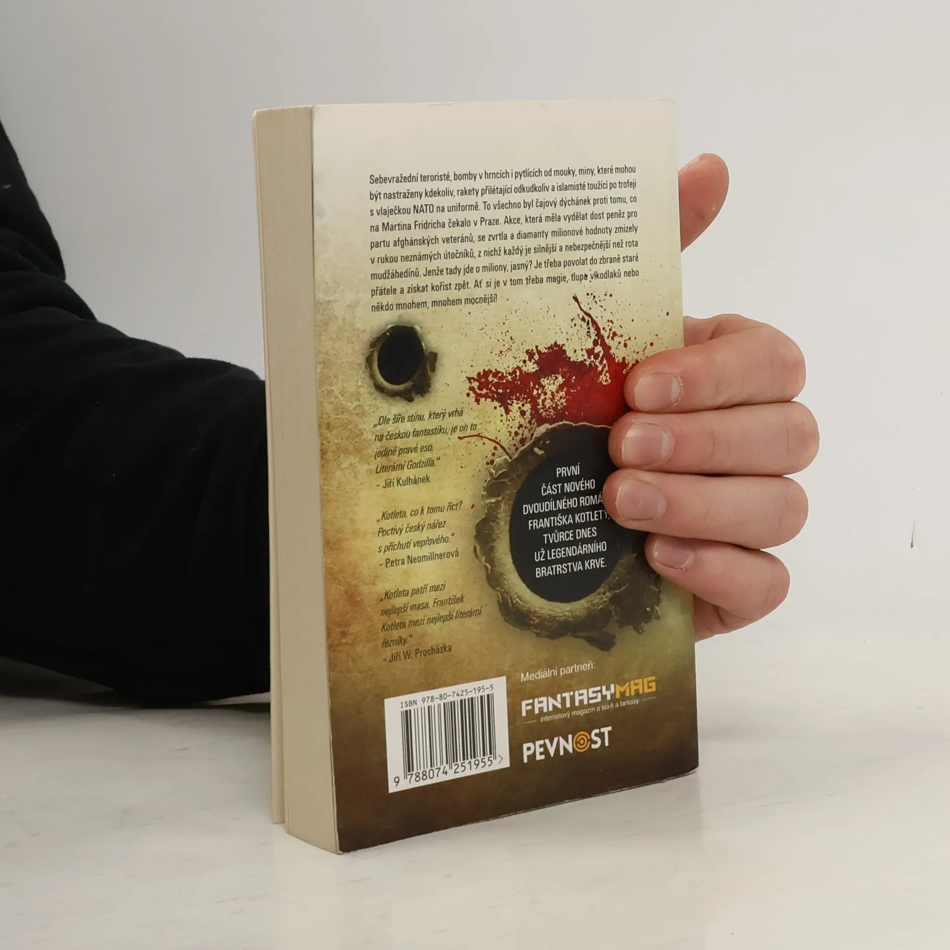 První část nového dvoudílného románu Františka Kotlety, v němž nechybí typické ingredience pro nejkontroverznějšího autora současné tuzemské fantastiky: brutalita, sex a nadsázka. Sebevražední teroristé, bomby v hrncích i pytlících od mouky, miny, které mohou být nastraženy kdekoliv, rakety přilétající odkudkoliv a islamisté toužící po trofeji s vlaječkou NATO na uniformě. To všechno byl čajový dýchánek proti tomu, co na Martina Fridricha čeká v Praze. Akce, která měla vydělat dost peněz pro partu afghánských veteránů, se zvrtne a diamanty milionové hodnoty mizí v rukou neznámých útočníků, z nichž každý je silnější a nebezpečnější než rota mudžáhedínů. Jenže tady jde o miliony, jasný? Je třeba povolat do zbraně staré přátele a získat kořist zpět. Ať si je v tom třeba magie, tlupa vlkodlaků nebo někdo mnohem, mnohem mocnější. První vydání. -- zdroj: www.legie.info --