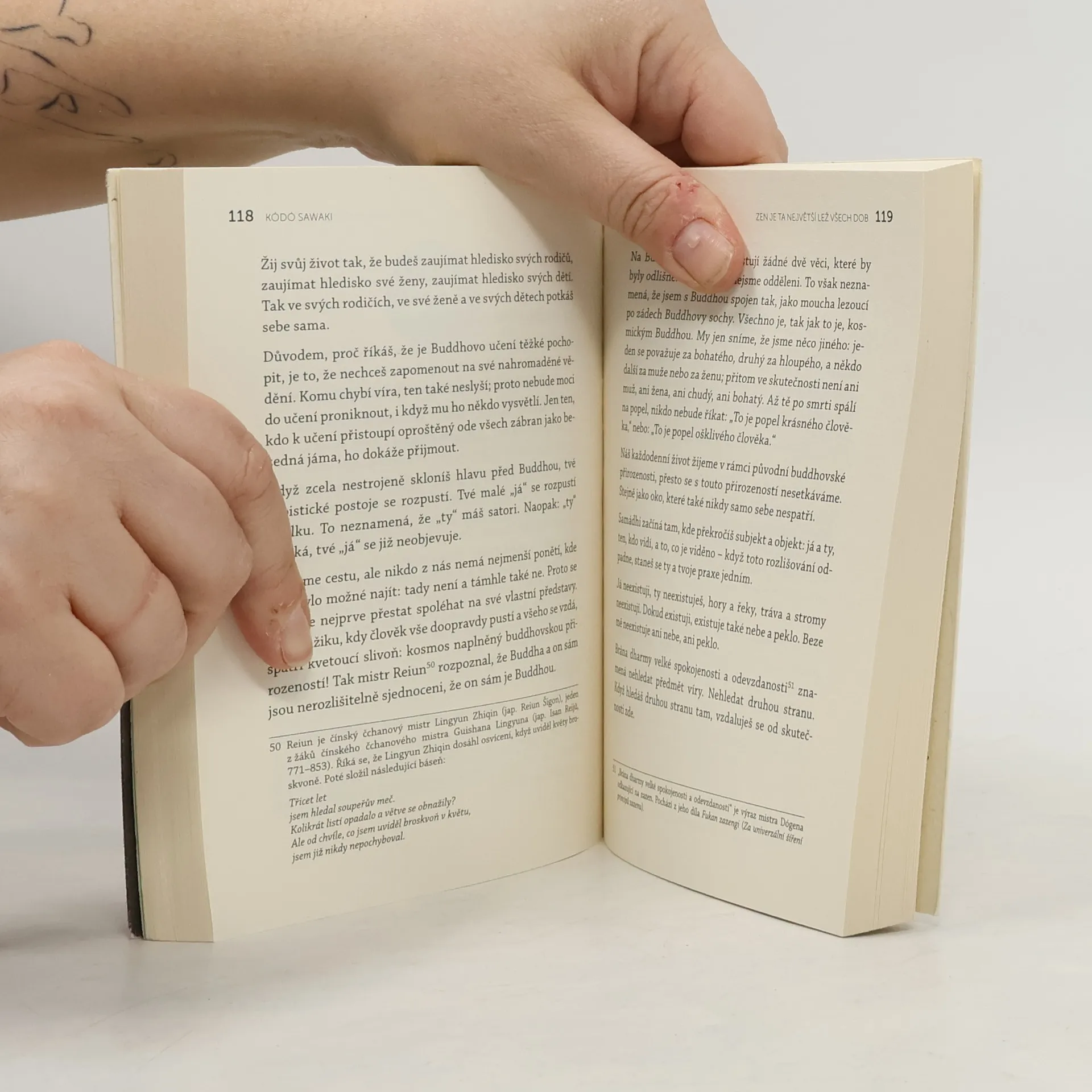 Chcete vědět, co je zen? Přečtěte si tuto vzácnou knihu. Pokud po jejím přečtení nic nepochopíte, zkuste ji znovu. Možná vás inspiruje k tomu, abyste se posadili a v klidu dýchali. V 60. letech dorazila na Západ vlna zenového buddhismu, především díky překladům autorů jako D. T. Suzuki. Zen se stal populárním a jeho estetika pronikla do designu a interiérů. Od té doby uplynulo 60 let a módní vlny orientální duchovnosti se měnily. Sawakiho kniha nám připomíná, co je na zenu přitažlivé: je přímočarý a jde „rovnou na věc“, což západní člověk, přetížený myšlenkami, hledá. Sawaki, významný zenový učitel linie Sótó, žil mezi lety 1880 a 1965 a byl známý nejen zasvěcencům, ale i široké veřejnosti díky svému charismatu a šíření zazenu. Důraz kladl na intenzivní praxi prostého sezení, což vedlo k zavedení týdenních „seššinů“ v jeho klášteře Antaidži, kde se denně konalo čtrnáct padesátiminutových zazenů. Jeho promluvy k žákům byly zapisovány a daly vzniknout japonskému originálu této knihy. Kvalitní literatura o zen-buddhismu je vzácná, zejména v češtině. Věříme, že vás živý a osobitý text Kódó Sawakiho zaujme a inspiruje.