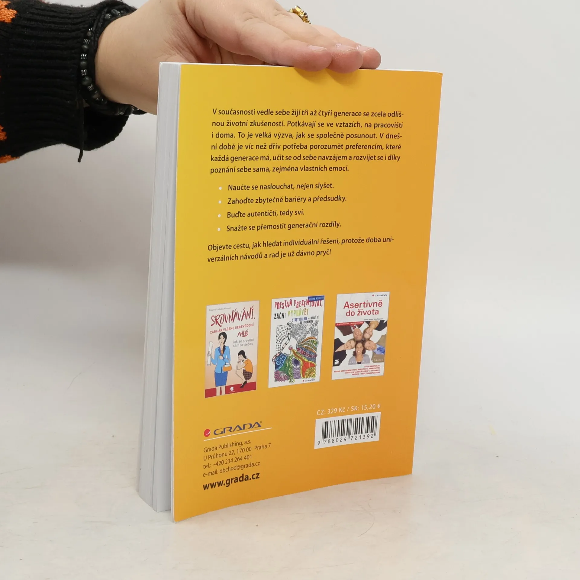 současné době vedle sebe žijí tři až čtyři generace se zcela odlišnou životní zkušeností. Potkávají se ve vztazích, na pracovišti i doma. To je velká výzva, jak se společně posunout. Je potřeba porozumět preferencím, které každá generace má, učit se od sebe navzájem a rozvíjet se i díky poznání sebe sama, zejména vlastních emocí. • Naučte se naslouchat, nejen slyšet. • Zahoďte zbytečné bariéry a předsudky. • Buďte autentičtí, tedy sví. • Snažte se přemostit generační rozdíly. Objevte cestu, jak hledat individuální řešení, protože doba univerzálních návodů a rad je už dávno pryč!