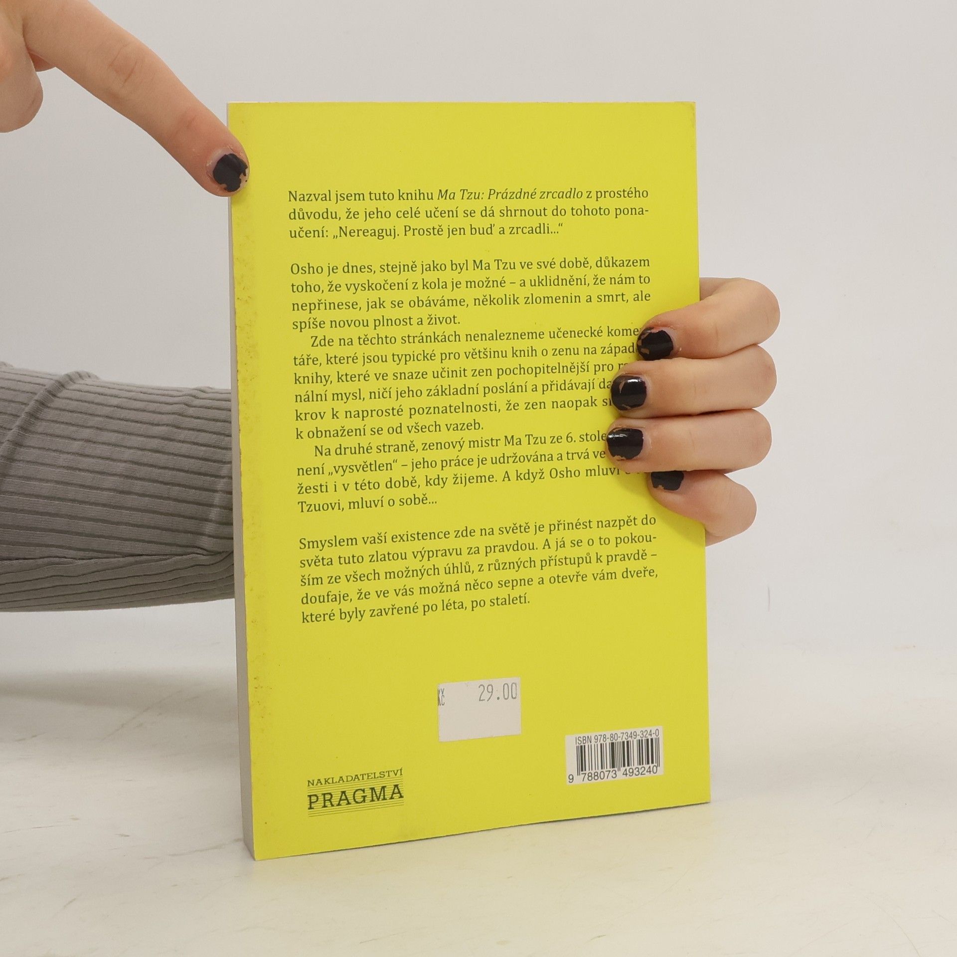 Osho je celosvětově známý a uznávaný osvícený duchovní mistr. Jeho poselstvím je láska. Ve své knize Ma Tzu: Prázdné zrcadlo přibližuje čtenářům učení zenového mistra Ma Tzua ze šestého stolení našeho letopočtu prostřednictvím přenášek a rozhovorů - komentovaných příběhů o Ma Tzuovi. A když Osho mluví o Ma Tzuovi, mluví o sobě... Osho je dnes, stejně jako byl Ma Tzu ve své době, důkazem toho, že vyskočit z kola je možné - a uklidnění, že nám to nepřinese, jak se obáváme, několik zlomenin a smrt, ale spíše novou plnost a život.