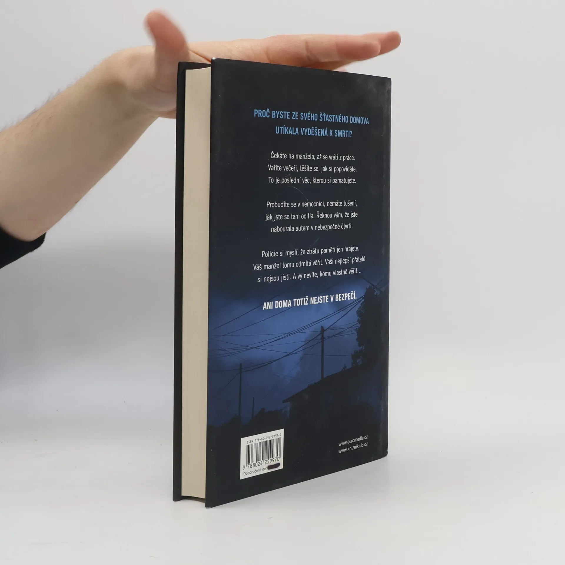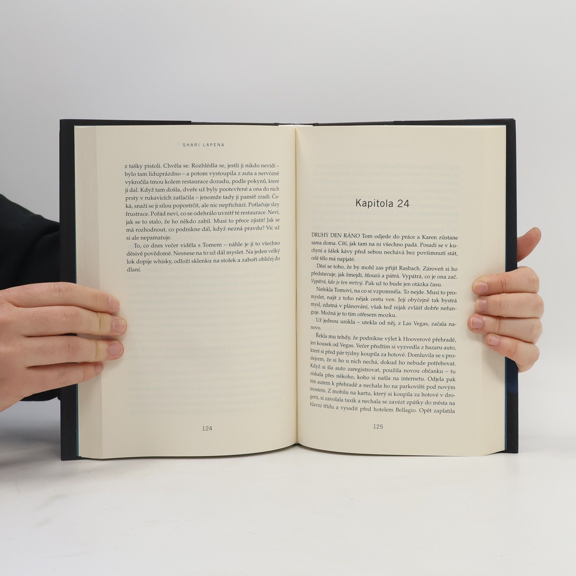 V téhle útulné čtvrti spokojených domovů zůstávají nebezpečné lži uzavřeny za dveřmi… Shari Lapena, autorka thrilleru roku 2017 Manželé odvedle, přichází s dalším rodinným dramatem plným tajemství a nečekaných zvratů, které nikdy nepřestanou překvapovat. Karen a Tom Kruppovi jsou šťastní – vzali se teprve nedávno a vlastní nádherný dům poblíž New Yorku. Jednoho dne se Tom vrátí domů a zjistí, že Karen zmizela – její auto je pryč a zdá se, že odjela ve spěchu. Nevzala si dokonce ani kabelku, telefon, doklady. Krátce nato se Tom dozví, že Karen měla nehodu a leží v nemocnici s otřesem mozku a ztrátou paměti. Po čase se Karen, odhodlaná vyléčit se a zapomenout, vrací s Tomem domů. Ale zdá se, že se tam něco změnilo. Něco není v pořádku. Někdo tam byl. Někdo cizí. Jenže v tomhle domě je každý cizí. Každý má něco, co by podle něj mělo zůstat skryto. Něco, kvůli čemu by raději vraždil, jen aby si to mohl nechat pro sebe...