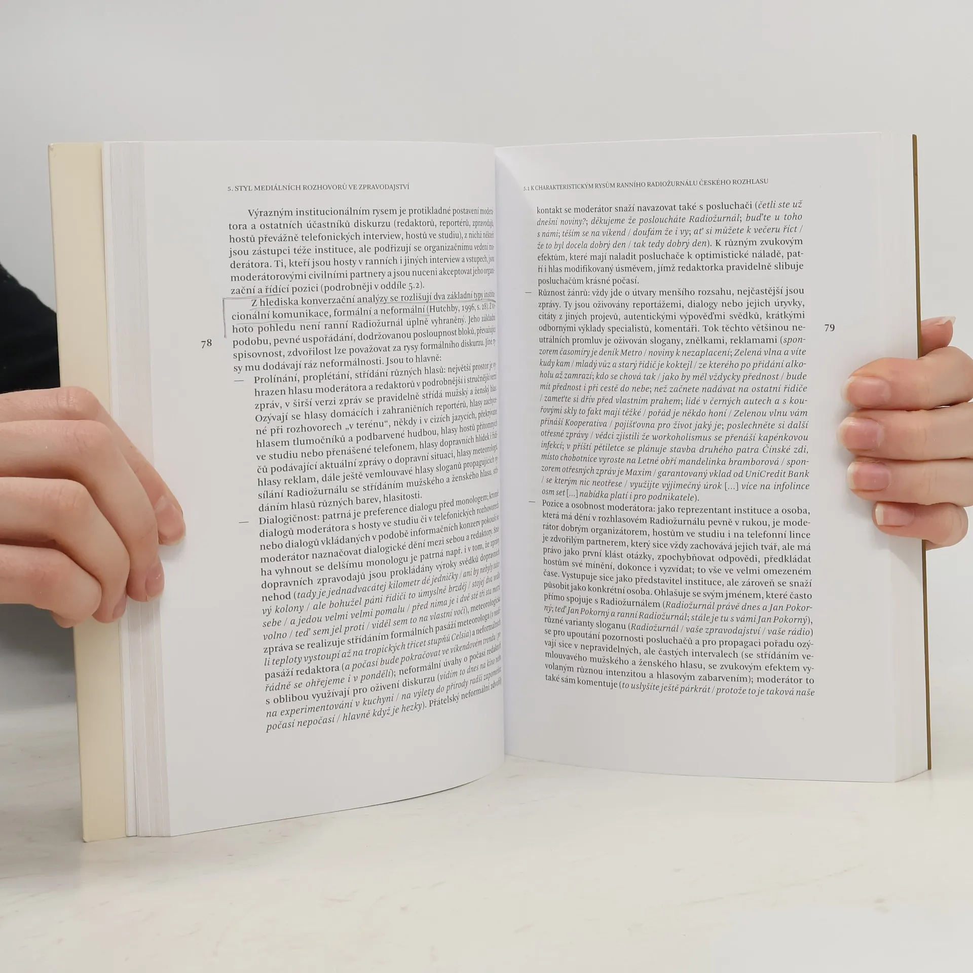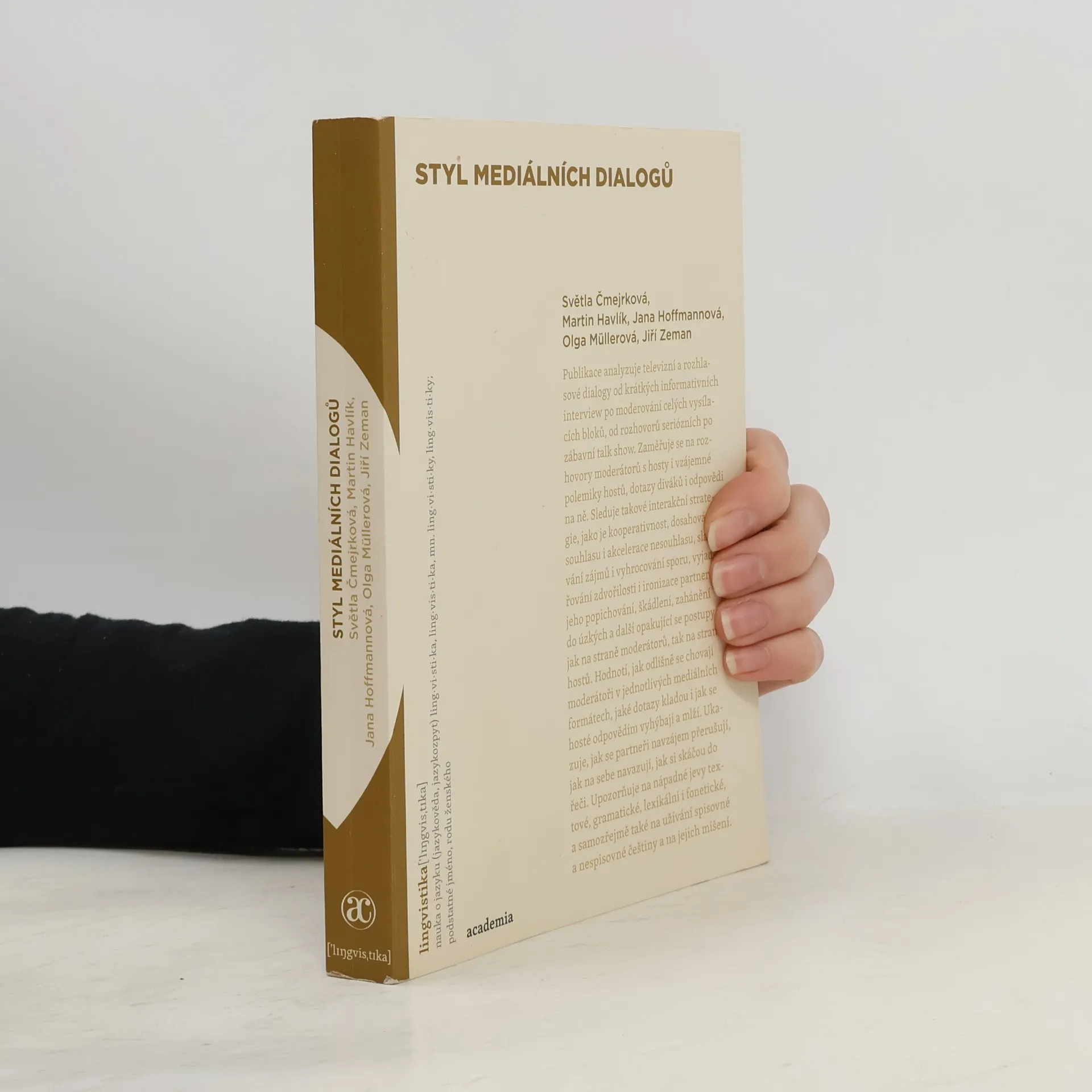 Publikace Styl mediálních dialogů analyzuje televizní a rozhlasové dialogy od krátkých informativních interview po moderování celých vysílacích bloků, od rozhovorů seriózních po zábavné talk show. Zaměřuje se na rozhovory moderátorů s hosty i vzájemné polemiky hostů, dotazy diváků i odpovědi na ně. Sleduje takové interakční strategie, jako je kooperativnost, dosahování souhlasu i akcelerace nesouhlasu, slaďování zájmů i vyhrocování sporu, vyjadřování zdvořilosti i ironizace partnera, jeho popichování, škádlení, zahánění do úzkých a další opakující se postupy jak na straně moderátorů, tak na straně hostů. Hodnotí, jak odlišně se chovají moderátoři v jednotlivých mediálních formátech, jaké dotazy kladou, i jak se hosté odpovědím vyhýbají a mlží. Ukazuje, jak se partneři navzájem přerušují, jak na sebe navazují, jak si skáčou do řeči. Upozorňuje na nápadné jevy textové, gramatické, lexikální i fonetické, a samozřejmě také na užívání spisovné a nespisovné češtiny a na jejich míšení.