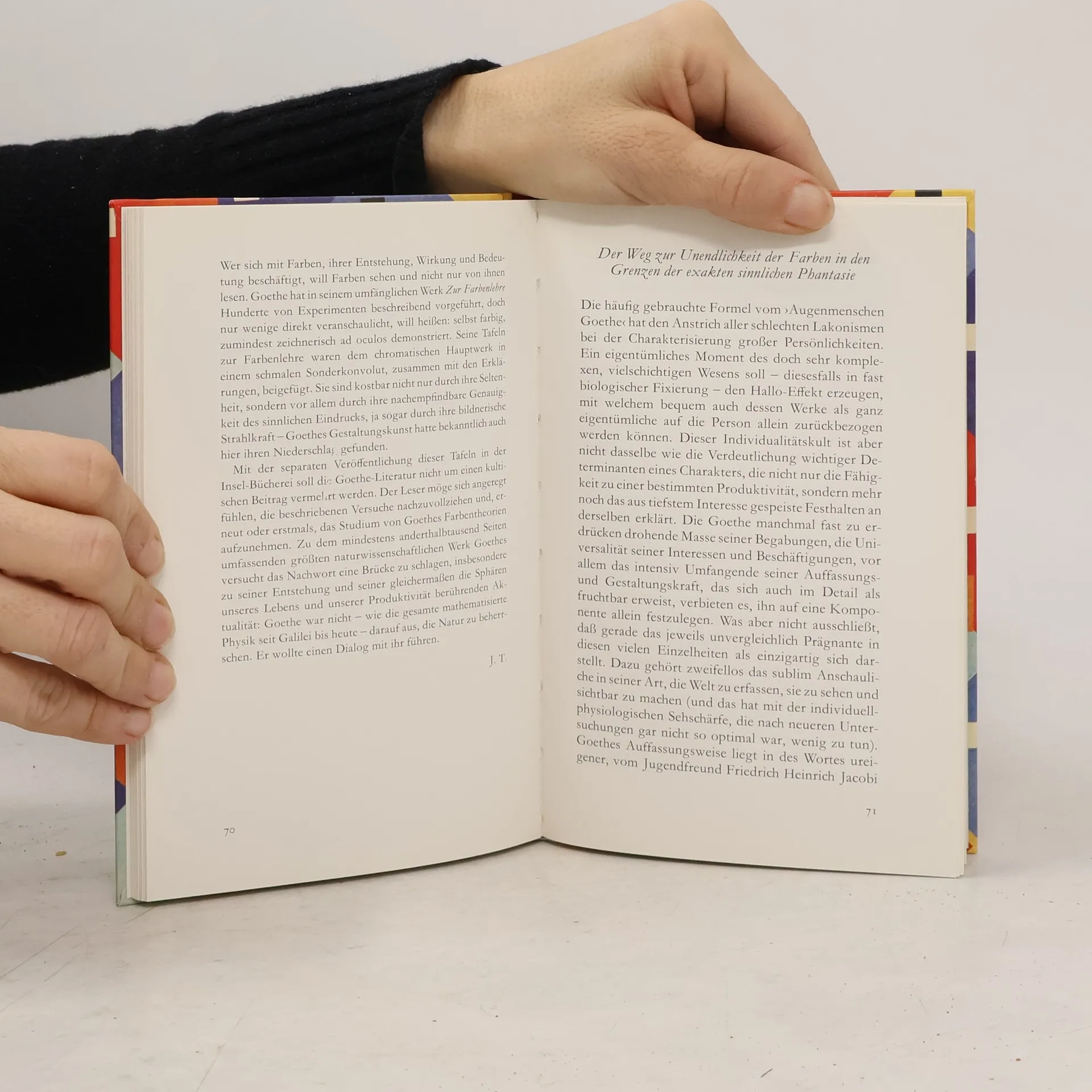 Wer sich mit Farben, ihrer Entstehung, Wirkung und Bedeutung beschäftigt, will Farben sehen und nicht nur von ihnen lesen. Goethe hat in seinem umfänglichen Werk »Zur Farbenlehre« Hunderte von Experimenten beschreibend vorgeführt, doch nur wenige direkt veranschaulicht. Seine siebzehn Tafeln zur Farbenlehre und deren Erklärungen waren 1810 dem eigentlichen Hauptwerk als Sonderkonvolut beigegeben. Sie sind kostbar nicht nur durch ihre Seltenheit, sondern auch durch die Genauigkeit des sinnlichen Eindrucks, ja sogar durch ihre bildnerische Strahlkraft. Goethes Gestaltungskunst hatte bekanntlich auch hier ihren Niederschlag gefunden.
