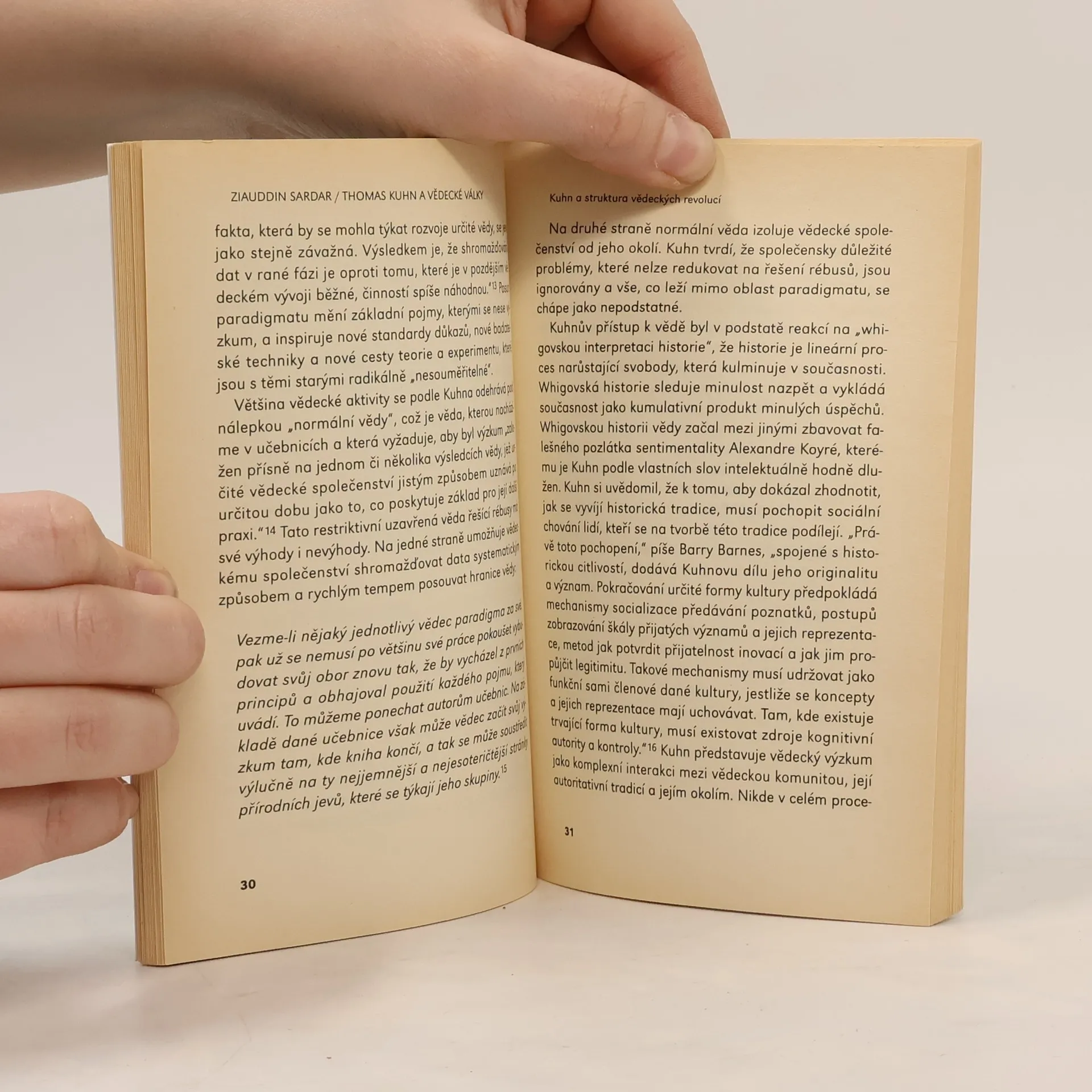 Autor v krátkosti shrnuje základní postuláty Kuhnovy knihy "Struktura vědeckých revolucí", která se stala přelomem v pohledu na fenomén vědy. Pozitivistický přístup, který vědu chápal jako objektivní, nehodnotový způsob poznávání, se náhle mění a dochází ke snaze zařadit vědu a vědecké prostředí do kontextu konrétní společenské struktury.