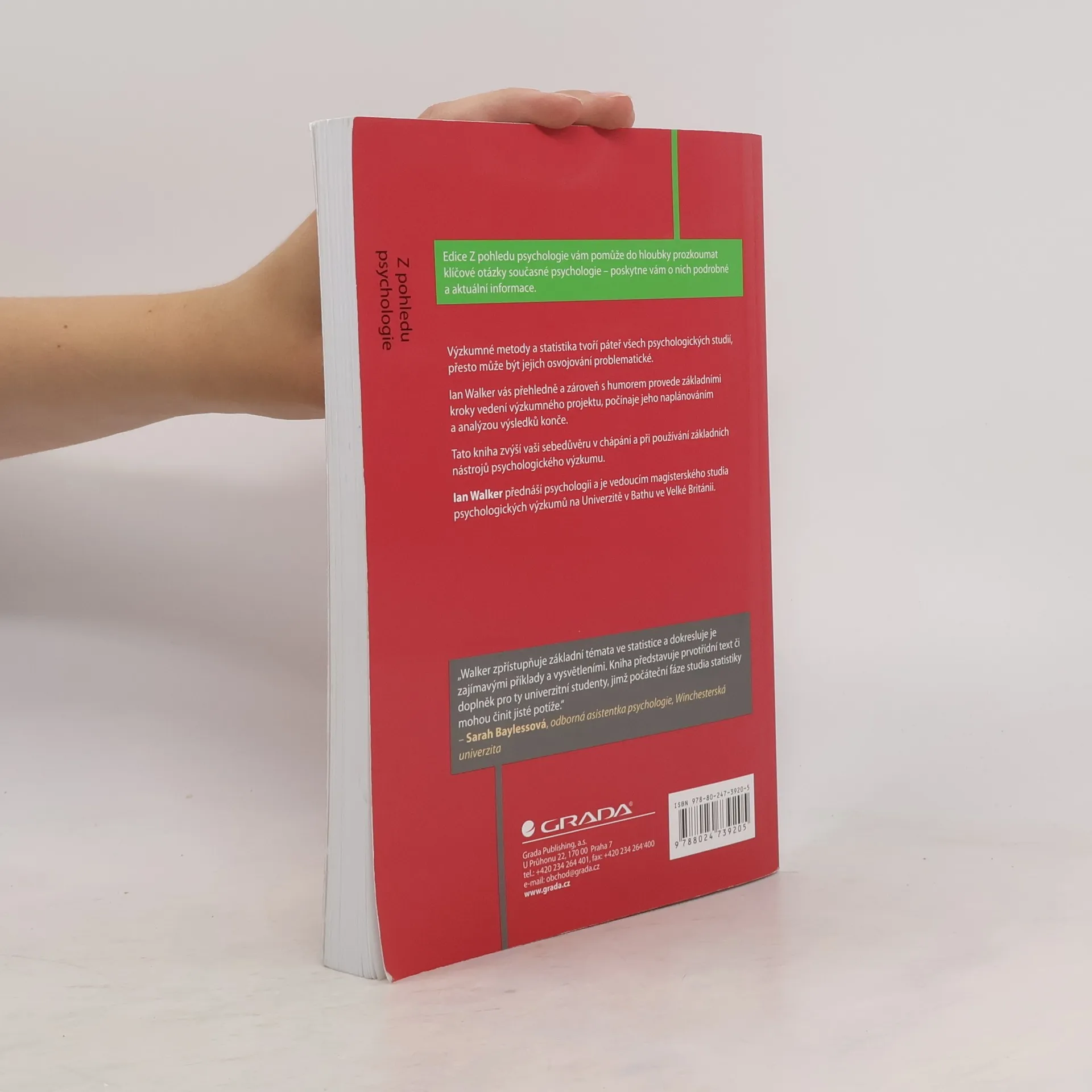 Výzkumné metody a statistika tvoří páteř všech psychologických studií, přesto může být jejich osvojování problematické. Ian Walker, který přednáší psychologii na Univerzitě v Bathu ve Velké Británii, vás přehledně a zároveň s humorem provede základními kroky vedení výzkumného projektu, počínaje jeho naplánováním a analýzou výsledků konče. Kniha zpřístupňuje základní témata ve statistice a dokresluje je zajímavými příklady a vysvětleními. Představuje proto prvotřídní text pro počáteční fáze studia statistiky. Zvýší vaši sebedůvěru v chápání a při používání základních nástrojů psychologického výzkumu.