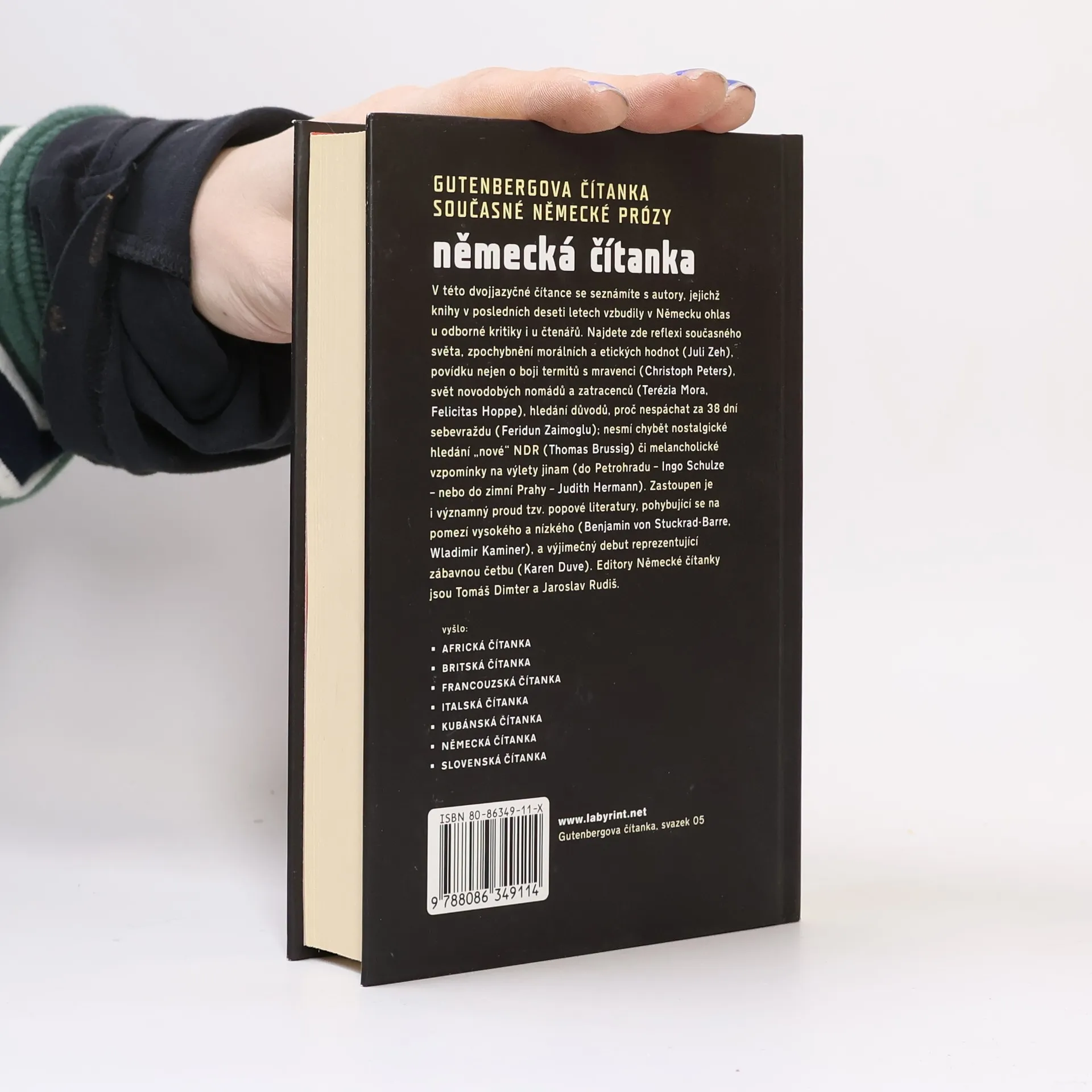 Gutenbergova čítanka současné německé prózy. V této dvojjazyčné čítance se seznámíte s autory, jejichž knihy v posledních deseti letech vzbudily v Německu ohlas u odborné kritiky i u čtenářů. Najdete zde reflexi současného světa, zpochybnění morálních a etických hodnot (Juli Zeh), povídku nejen o boji termitů s mravenci (Christoph Peters), svět novodobých nomádů a zatracenců (Terézia Mora, Felicitas Hoppe), hledání důvodů, proč nespáchat za 38 dní sebevraždu (Feridun Zaimoglu); nesmí chybět nostalgické hledání "nové" NDR (Thomas Brussig) či melancholické vzpomínky na výlety jinam (do Petrohradu - Ingo Schulze - nebo do zimní Prahy - Judith Hermann). Zastoupen je i významný proud tzv. popové literatury, pohybující se na pomezí vysokého a nízkého (Benjamin von Stuckrad-Barre, Wladimir Kaminer), a výjimečný debut reprezentující zábavnou četbu (Karen Duve). 1. vyd.