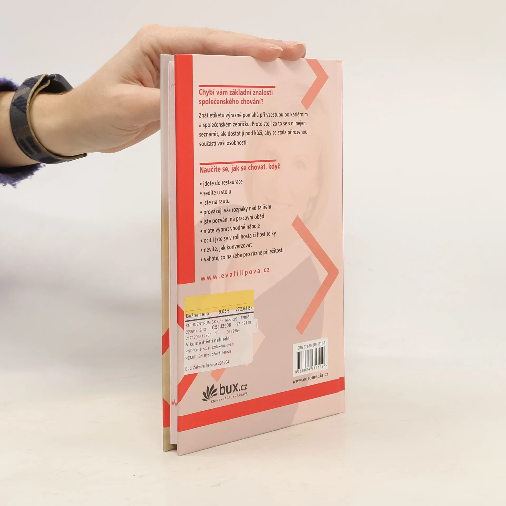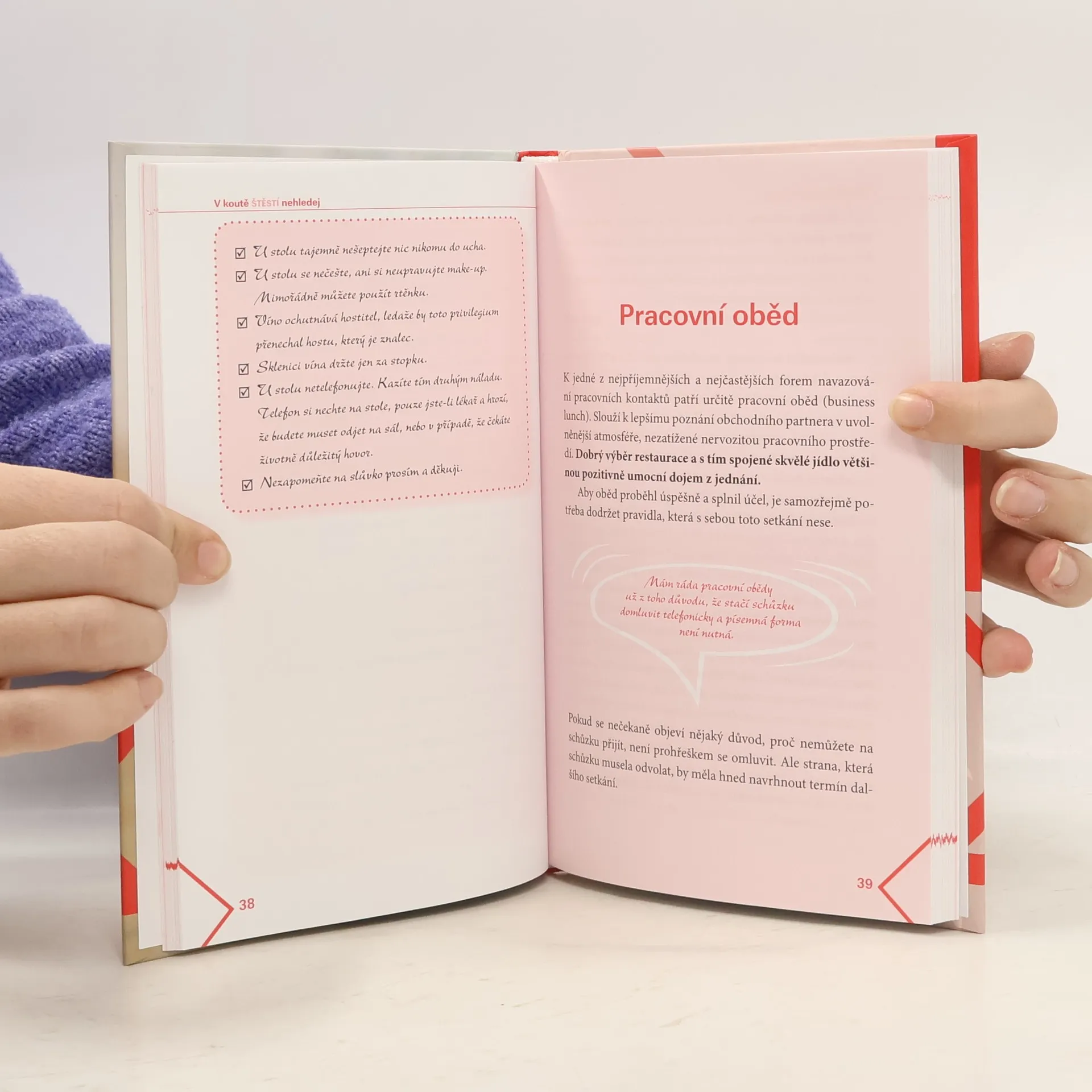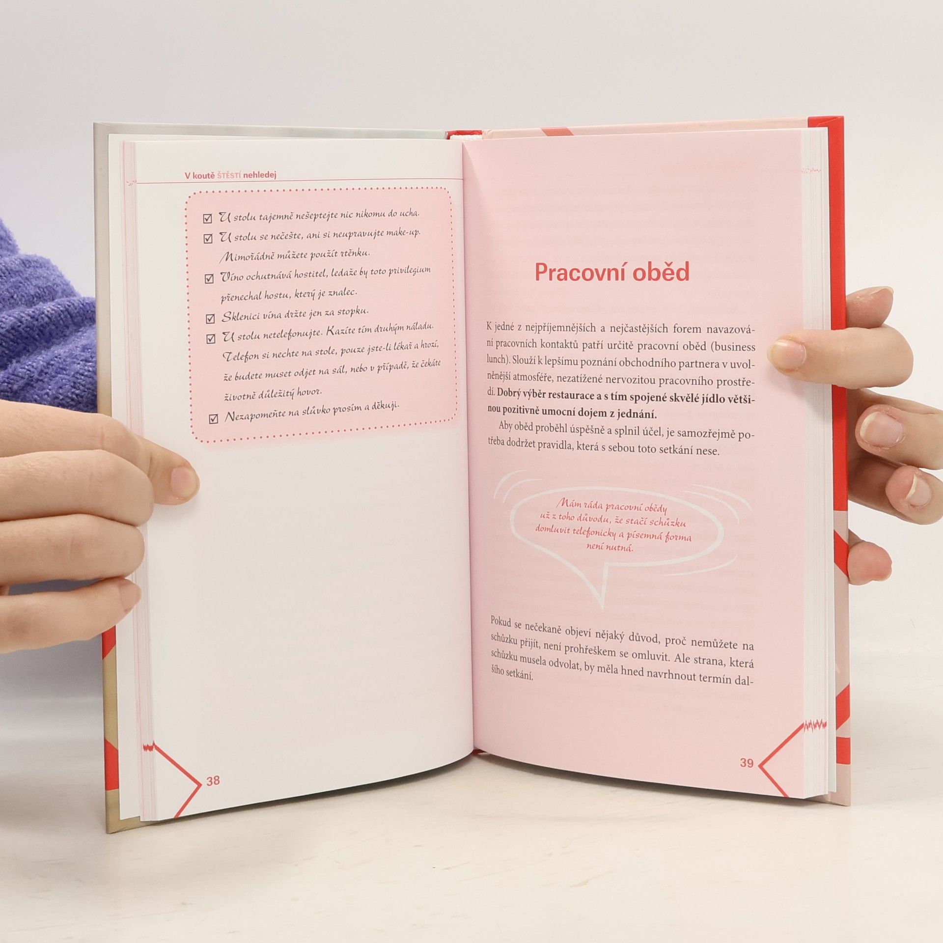 Proč se některým lidem nedaří vybočit z řady? Myslíte, že nemají štěstí? Pravděpodobně jim chybí základní znalost etikety, jež výrazně pomáhá při vzestupu po pracovním a společenském žebříčku. Proto stojí za to se s pravidly společenského chování nejen seznámit, ale dostat je pod kůži, aby se stala přirozenou součástí naší osobnosti... Hlavně neztrácejte rozum a takt. A nezapomínejte na úsměv. Dělá zázraky.