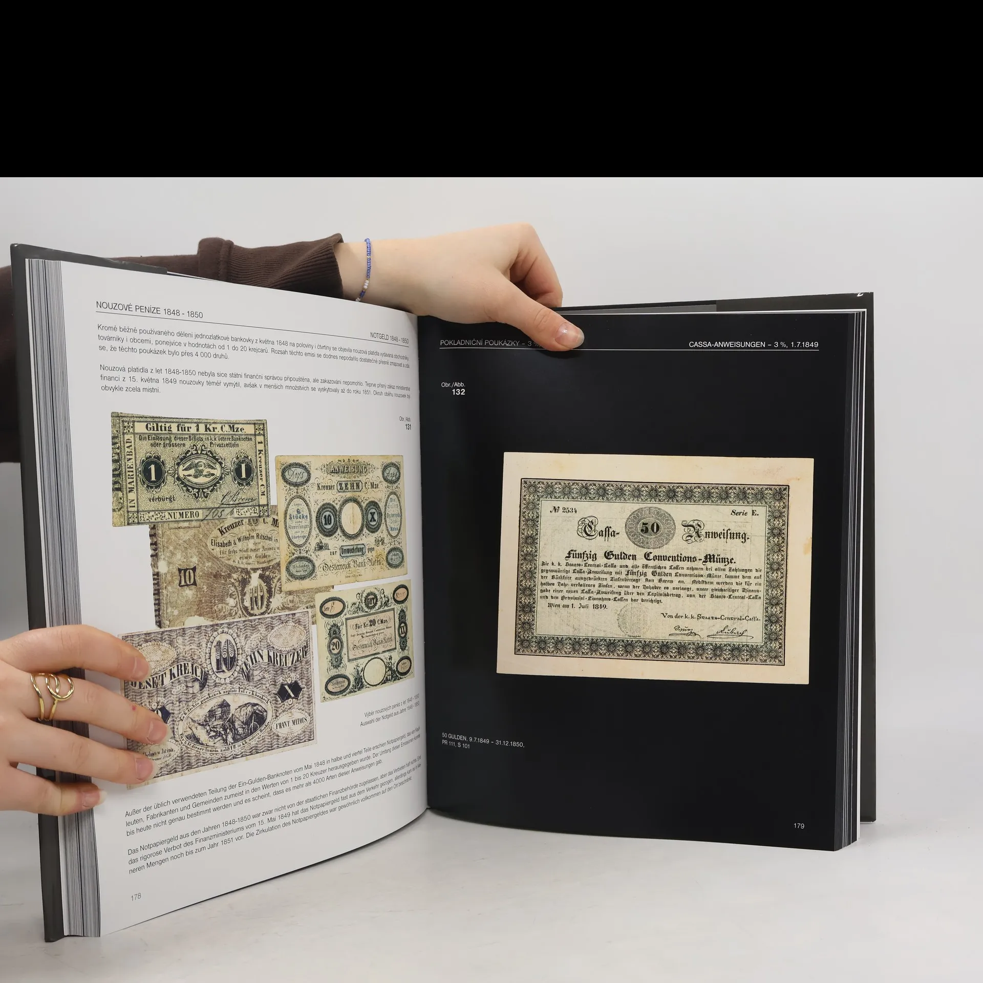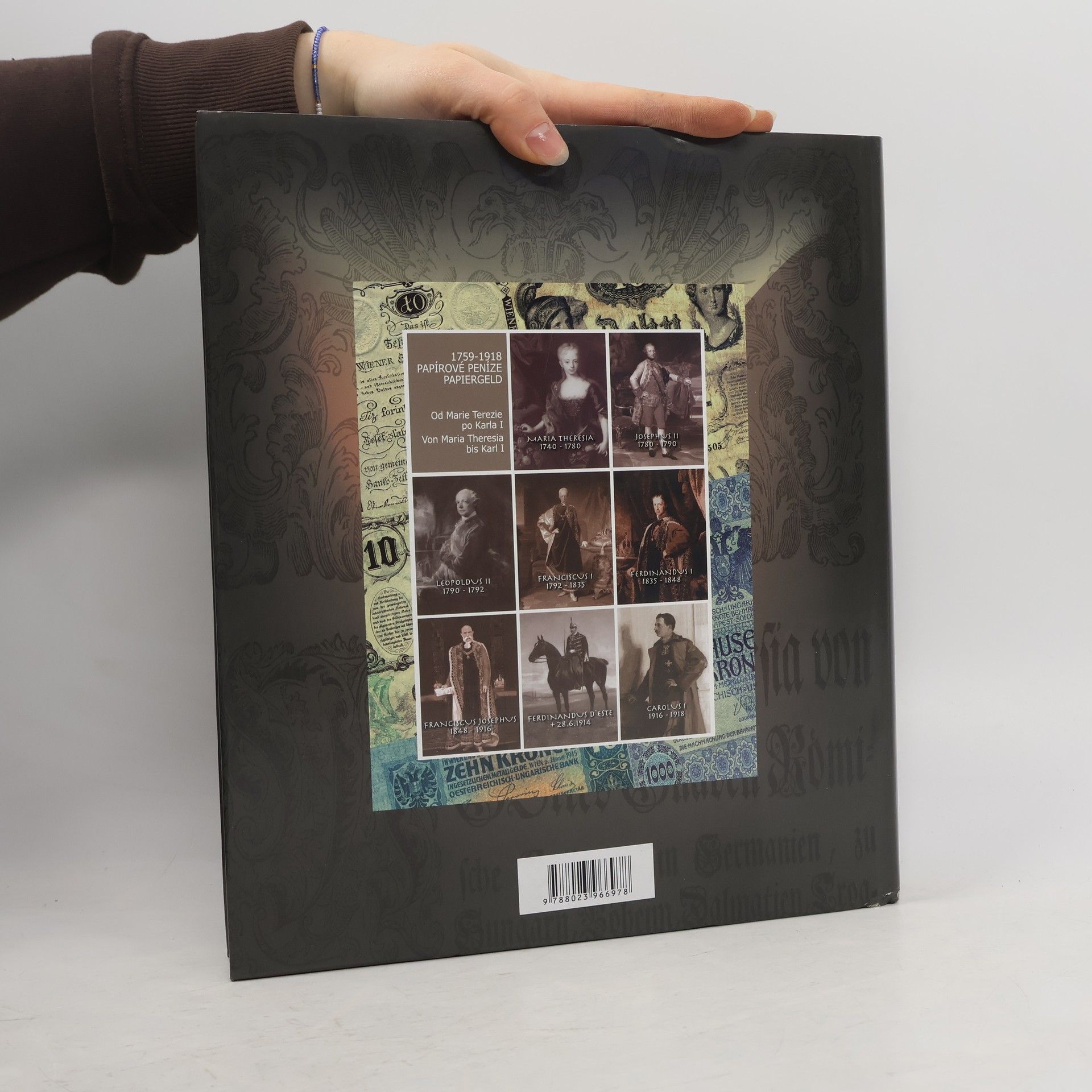 Ojedinělá publikace v luxusním provedení (320 stran, křídový papír, stránky 255x300 mm) obsahuje barevná vyobrazení ve skutečné velikosti veškerých státních edicí papírových peněz platných na našem území až do roku 1918. Mnoho ukázek nouzových peněz, padělků, obléhacích peněz, vojenských emisí apod. Doprovodný text ilustruje hospodářské poměry a zasazuje měnu do historického kontextu včetně cen a mezd. Vyobrazený materiál byl čerpán z Rakouska, ČR a Maďarska, zejména z archivů Kunsthistorisches Museum Wien a Rakouské národní banky. Texty v českém a německém jazyce. Anglický souhrn.
