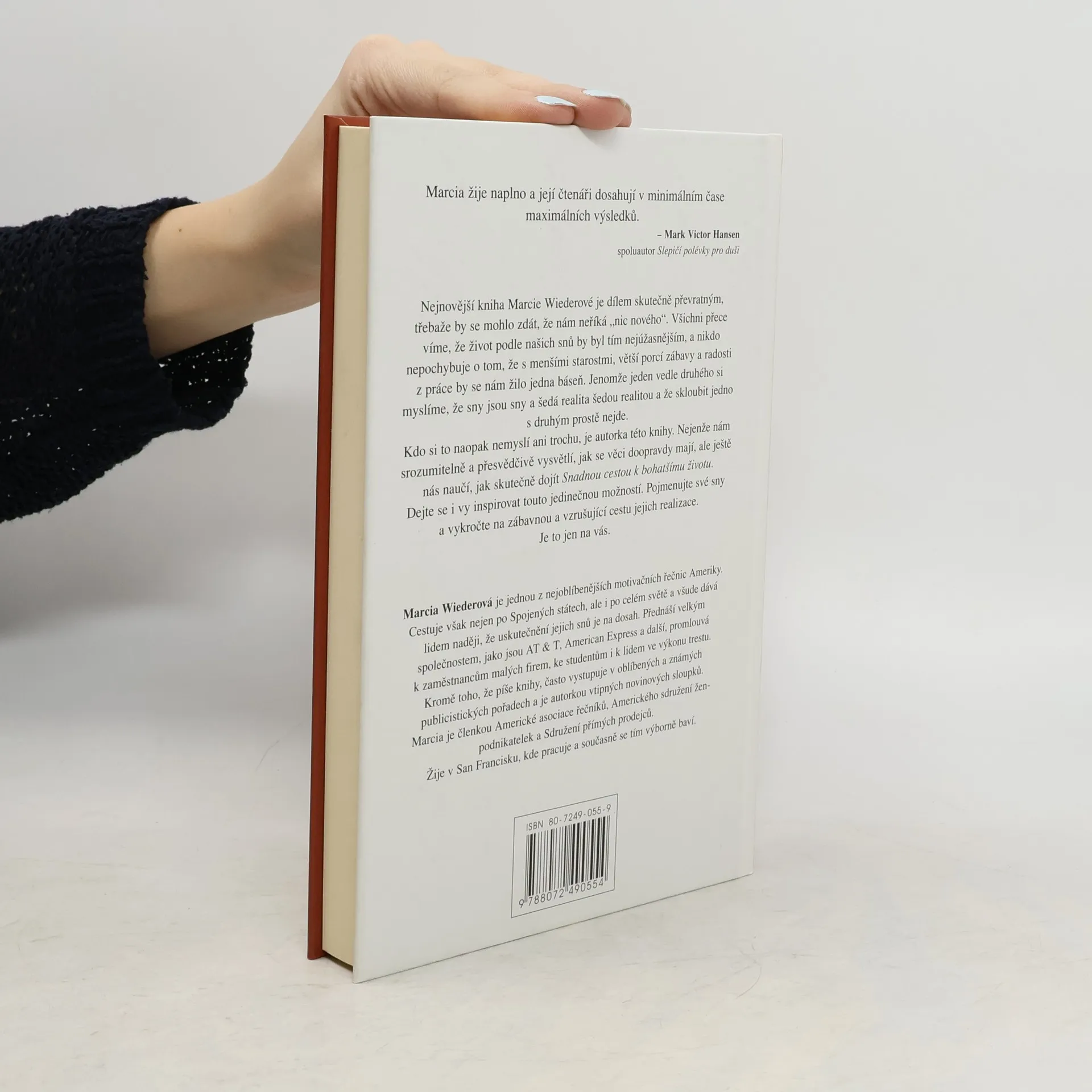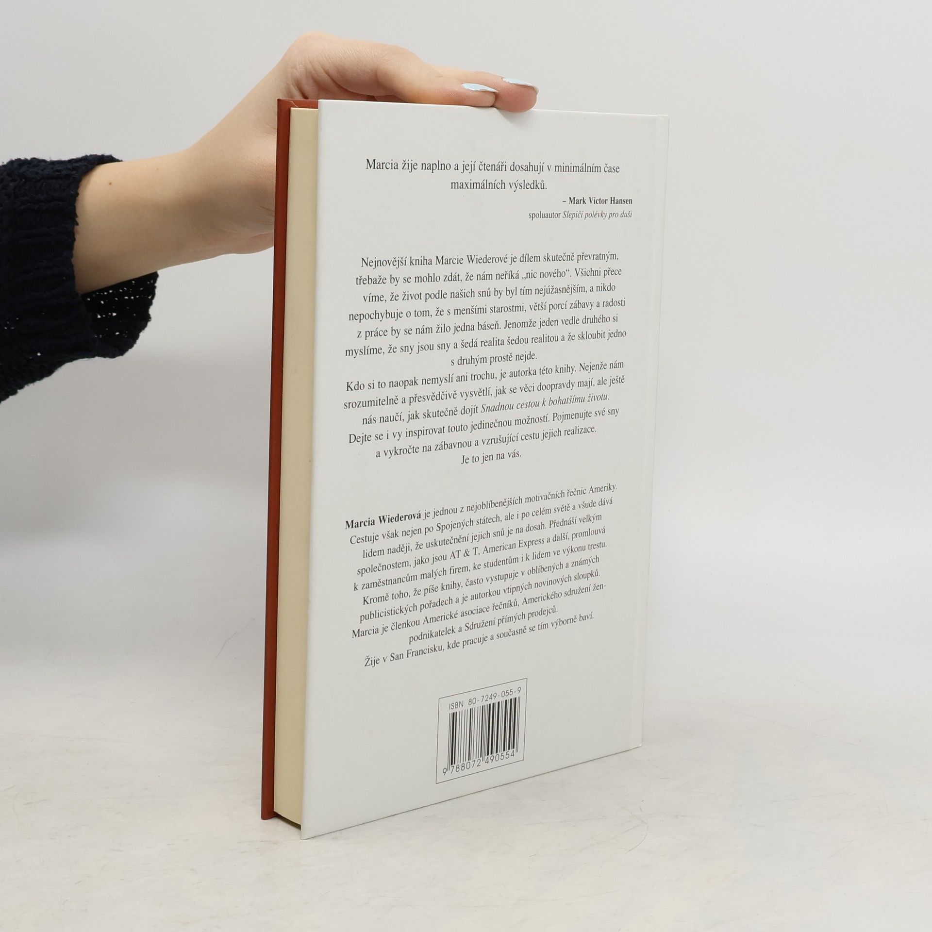 Nejnovější kniha Marcie Wiederové je dílem skutečně převratným, třebaže by se mohlo zdát, že nám neříká "nic nového". Všichni přece víme, že život podle našich snů by byl tím nejúžasnějším, a nikdo nepochybuje o tom, že s menšími starostmi, větší porcí zábavy a radosti z práce by se nám žilo jedna báseň. Jenomže jeden vedle druhého si myslíme, že sny jsou sny a šedá realita šedou realitou a že skloubit jedno s druhým prostě nejde. Kdo si to naopak nemyslí ani trochu, je autorka této knihy. Nejenže nám srozumitelně a přesvědčivé vysvětlí, jak se věci doopravdy mají, ale ještě nás naučí, jak skutečně dojít Snadnou cestou k bohatšímu životu. Dejte se i vy inspirovat touto jedinečnou možností. Pojmenujte své sny a vykročte na zábavnou a vzrušující cestu jejich realizace. Je to jen na vás. Marcia Wiederová je jednou z nejoblíbenějších motivačních řečnic Ameriky. Cestuje však nejen po Spojených státech, ale i po celém světě a všude dává lidem naději, že uskutečnění jejich snů je na dosah. Přednáší velkým společnostem, jako jsou AT & T, Američan Express a další, promlouvá k zaměstnancům malých firem, ke studentům i k lidem ve výkonu trestu. Kromě toho, že píše knihy, často vystupuje v oblíbených a známých publicistických pořadech a je autorkou vtipných novinových sloupků.