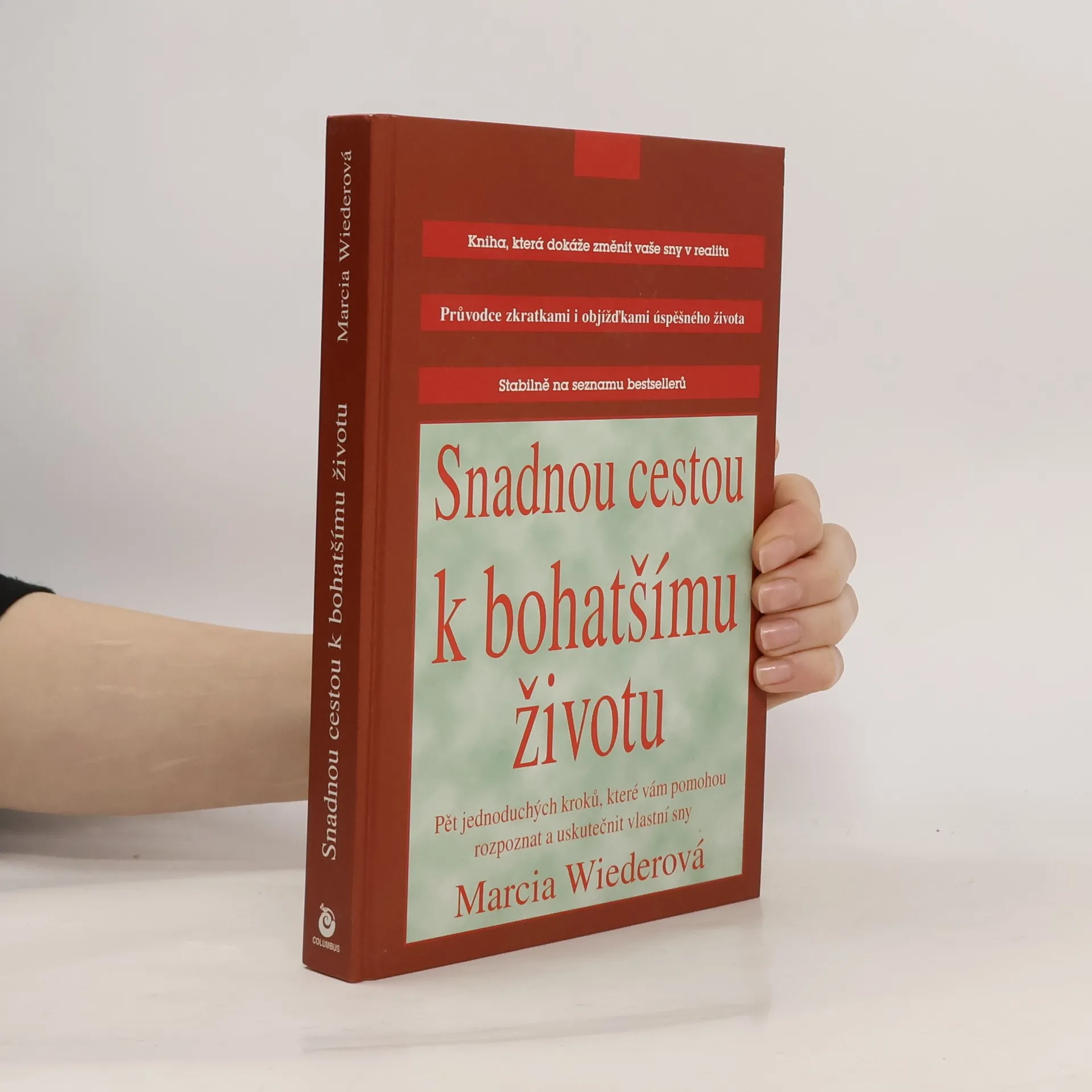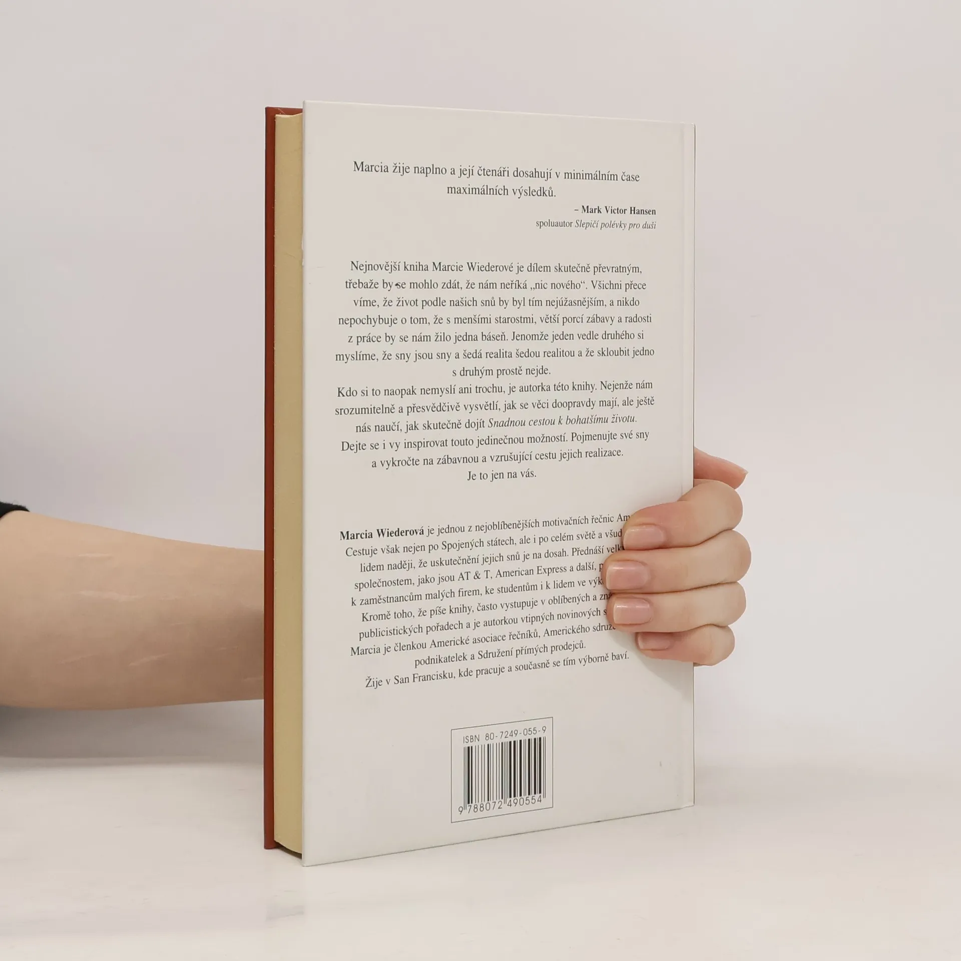Nejnovější kniha Marcie Wiederové je dílem skutečně převratným, třebaže by se mohlo zdát, že nám neříká "nic nového". Všichni přece víme, že život podle našich snů by byl tím nejúžasnějším, a nikdo nepochybuje o tom, že s menšími starostmi, větší porcí zábavy a radosti z práce by se nám žilo jedna báseň. Jenomže jeden vedle druhého si myslíme, že sny jsou sny a šedá realita šedou realitou a že skloubit jedno s druhým prostě nejde. Kdo si to naopak nemyslí ani trochu, je autorka této knihy. Nejenže nám srozumitelně a přesvědčivé vysvětlí, jak se věci doopravdy mají, ale ještě nás naučí, jak skutečně dojít Snadnou cestou k bohatšímu životu. Dejte se i vy inspirovat touto jedinečnou možností. Pojmenujte své sny a vykročte na zábavnou a vzrušující cestu jejich realizace. Je to jen na vás. Marcia Wiederová je jednou z nejoblíbenějších motivačních řečnic Ameriky. Cestuje však nejen po Spojených státech, ale i po celém světě a všude dává lidem naději, že uskutečnění jejich snů je na dosah. Přednáší velkým společnostem, jako jsou AT & T, Američan Express a další, promlouvá k zaměstnancům malých firem, ke studentům i k lidem ve výkonu trestu. Kromě toho, že píše knihy, často vystupuje v oblíbených a známých publicistických pořadech a je autorkou vtipných novinových sloupků.