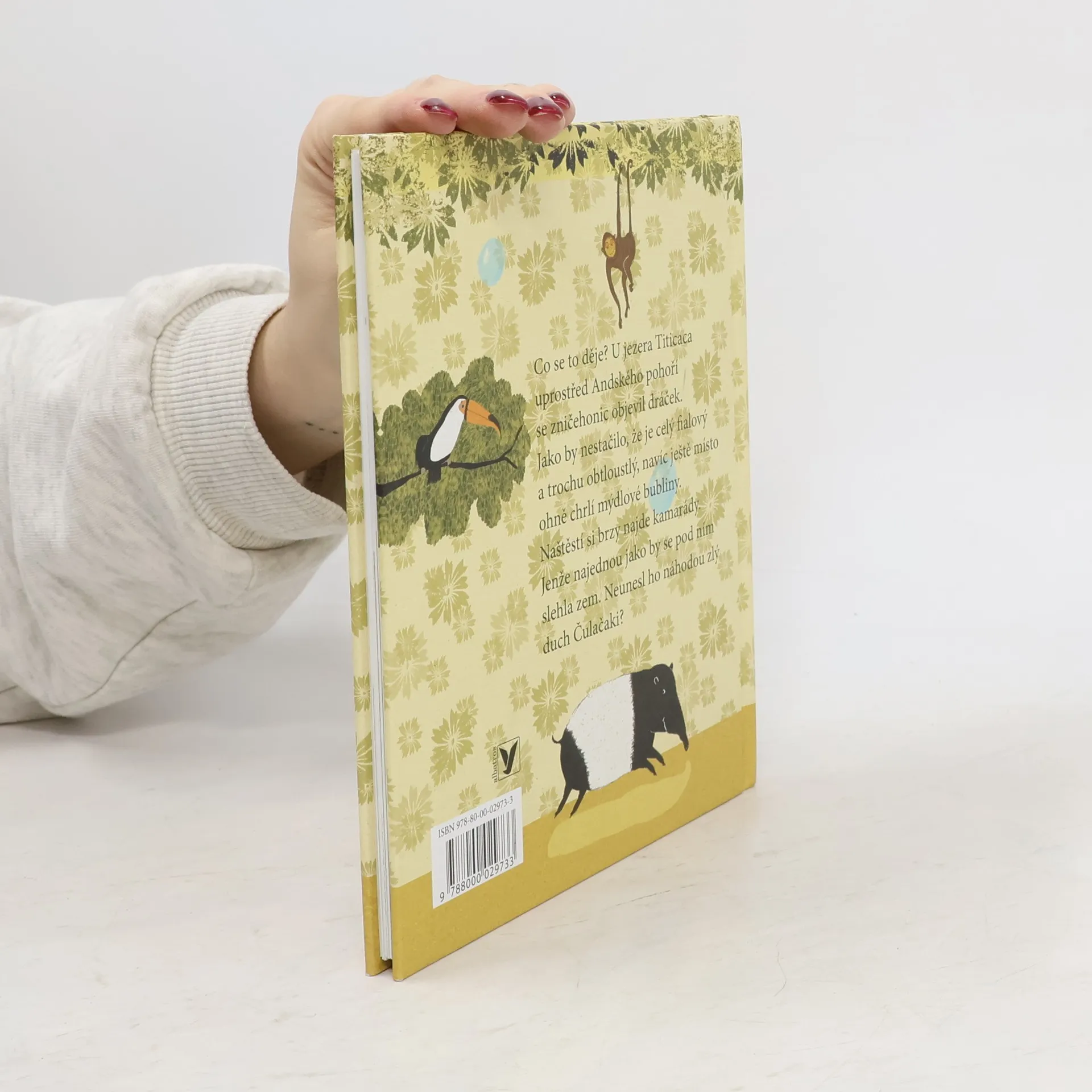 Co se to děje? U jezera Titicaca uprostřed Andského pohoří se zničehonic objevil dráček. Jako by nestačilo, že je celý fialový a trochu obtloustlý, navíc ještě místo ohně chrlí mýdlové bubliny. Však se mu za to ostatní zvířátka pěkně smějí. Jednoho dne k jezeru dorazí krásná dračice Marina a zanedlouho se s ní dráček John-John ztratí stejně náhle, jako se objevil. Jeho přátelé, sova Jačamajo, puma Pukara a jaguár Pukaňavi, se kterými si dřív po večerech vyprávěl tajemné příběhy, o něj dostanou strach a vydají se ho hledat. Co když ho unesl zlý duch Čulačaki? Knížka pro nejmenší čtenáře plná roztomilých ilustrací, exotických zvířat a tajemství, která může ukrývat jen hustý amazonský prales.