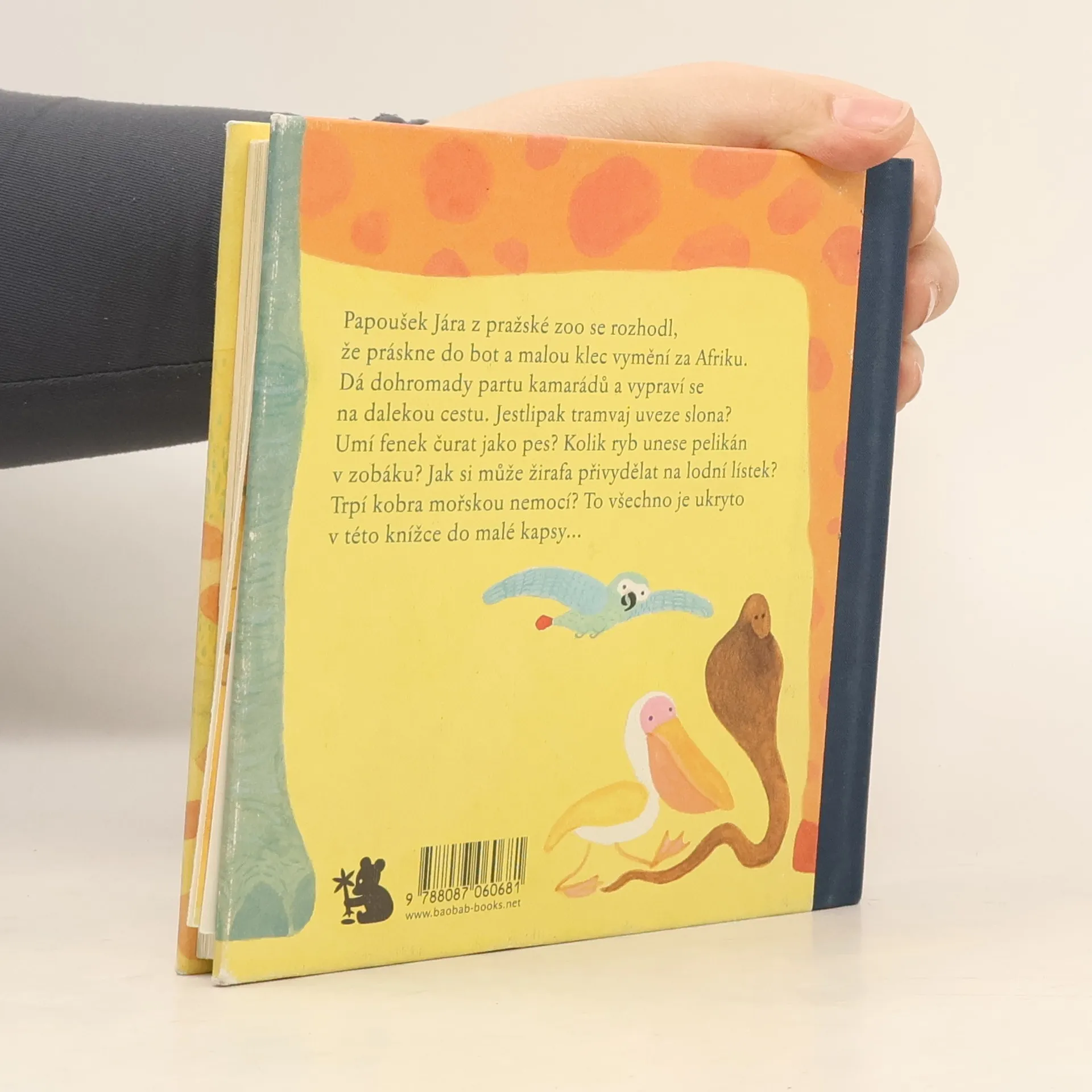 Papoušek Jára z pražské zoo se rozhodl, že práskne do bot a malou klec vymění za Afriku. Dá dohromady partu kamarádů a vypráví se na dalekou cestu. Jestlipak tramvaj uveze slona? Umí fenek čurat jako pes? Kolik ryb unese pelikán v zobáku? Jak si může žirafa přivydělat na lodní lístek? Trpí kobra mořskou nemocí? To všechno je ukryto v této knížce do malé kapsy... Kniha s vloženou mapou.
