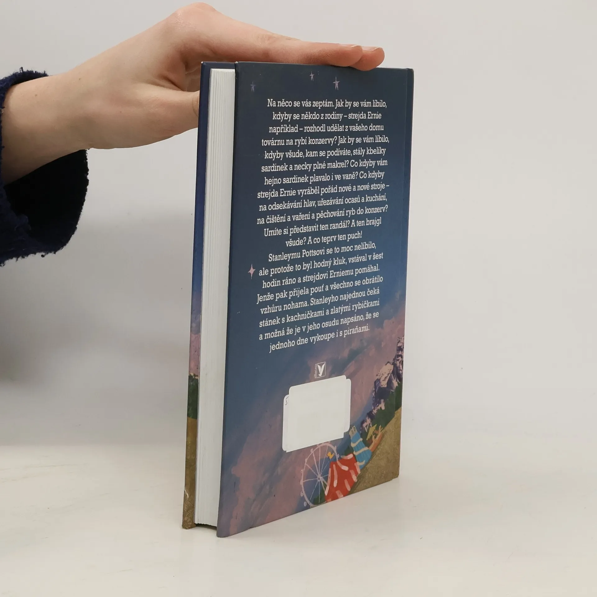 Poetický a laskavě bláznivý příběh o překonání vlastního strachu Na něco se vás zeptám. Jak by se vám líbilo, kdyby se někdo z rodiny – strejda Ernie například – rozhodl udělat z vašeho domu továrnu na rybí konzervy? Jak by se vám líbilo, kdyby všude, kam se podíváte, stály kbelíky sardinek a necky plné makrel? Co kdyby vám hejno sardinek plavalo i ve vane? Co kdyby strejda Ernie vyráběl pořád nové a nové stroje – na odsekávání hlav, uřezávání ocasu a kuchání, na čištění a vaření a pechování ryb do konzerv? Umíte si představit ten randál? A ten brajgl všude? A co teprv ten puch! Stanleymu Pottsovi se to moc nelíbilo, ale protože to byl hodný kluk, vstával v šest hodin ráno a strejdovi Erniemu pomáhal.