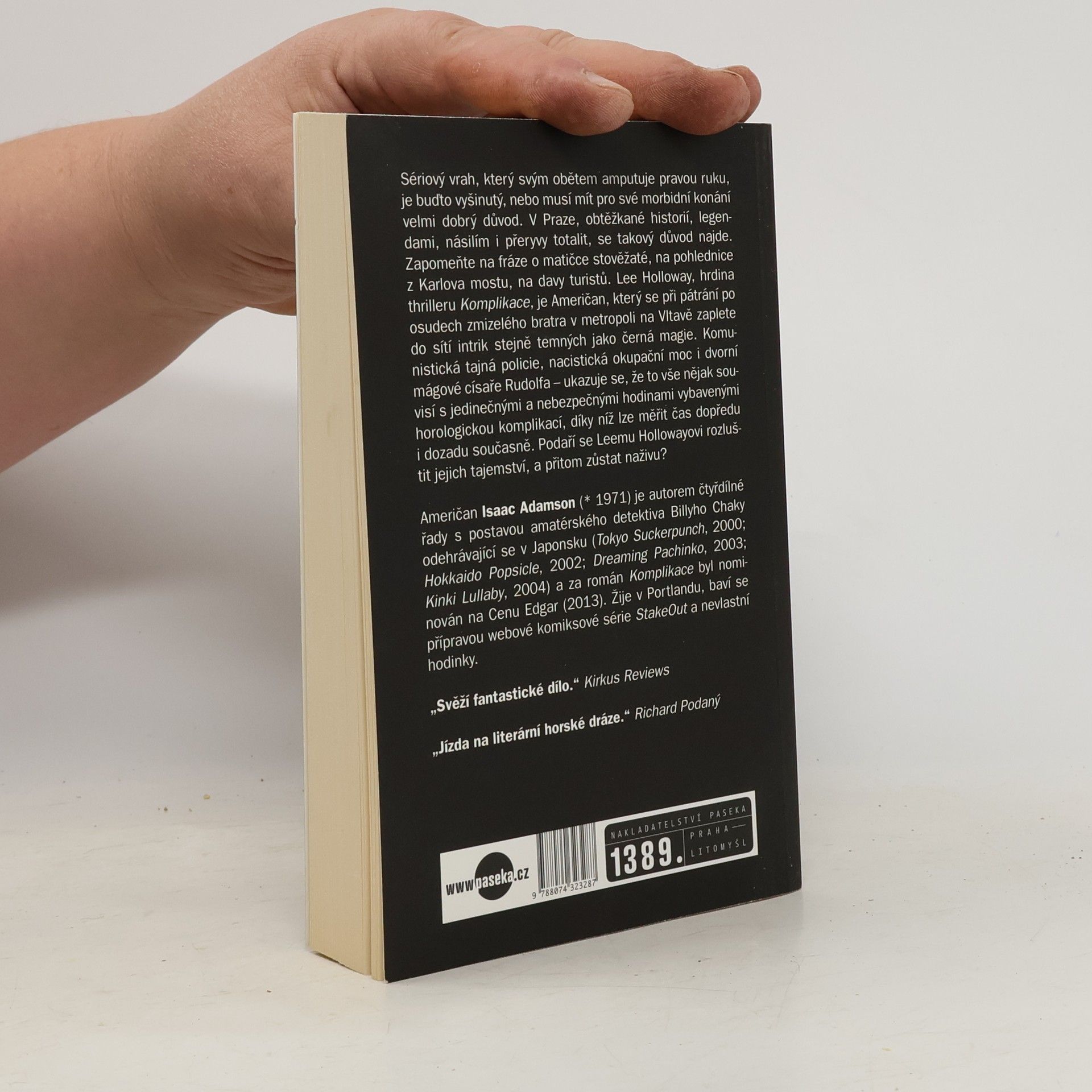 Sériový vrah, který svým obětem amputuje pravou ruku, je buďto vyšinutý, nebo musí mít pro své morbidní konání velmi dobrý důvod. V Praze, obtěžkané historií, legendami, násilím i přeryvy totalit, se takový důvod najde. Zapomeňte na fráze o matičce stověžaté, na pohlednice z Karlova mostu, na davy turistů. Lee Holloway, hrdina thrilleru Komplikace, je Američan, který se při pátrání po osudech zmizelého bratra v metropoli na Vltavě zaplete do sítí intrik stejně temných jako černá magie. Komunistická tajná policie, nacistická okupační moc i dvorní mágové císaře Rudolfa – ukazuje se, že to vše nějak souvisí s jedinečnými a nebezpečnými hodinami vybavenými horologickou komplikací, díky níž lze měřit čas dopředu i dozadu současně. Isaac Adamson (1971) je autorem čtyřdílné řady s postavou novináře a amatérského detektiva Billyho Chaky odehrávající se v Japonsku (2002–2004) a za román Komplikace byl nominován na Cenu Edgar (2013). Žije v Portlandu, baví se přípravou webové komiksové série StakeOut a nevlastní hodinky.