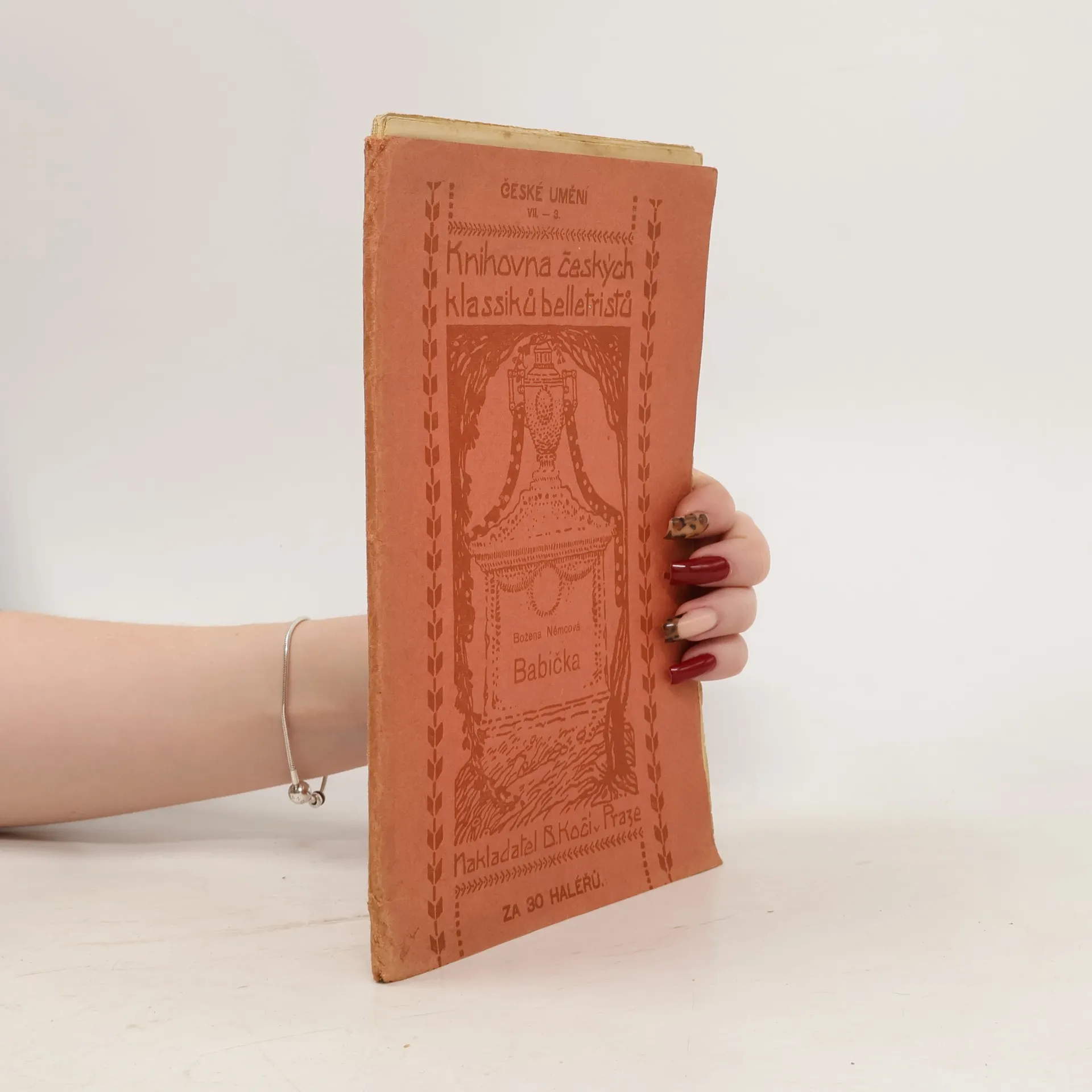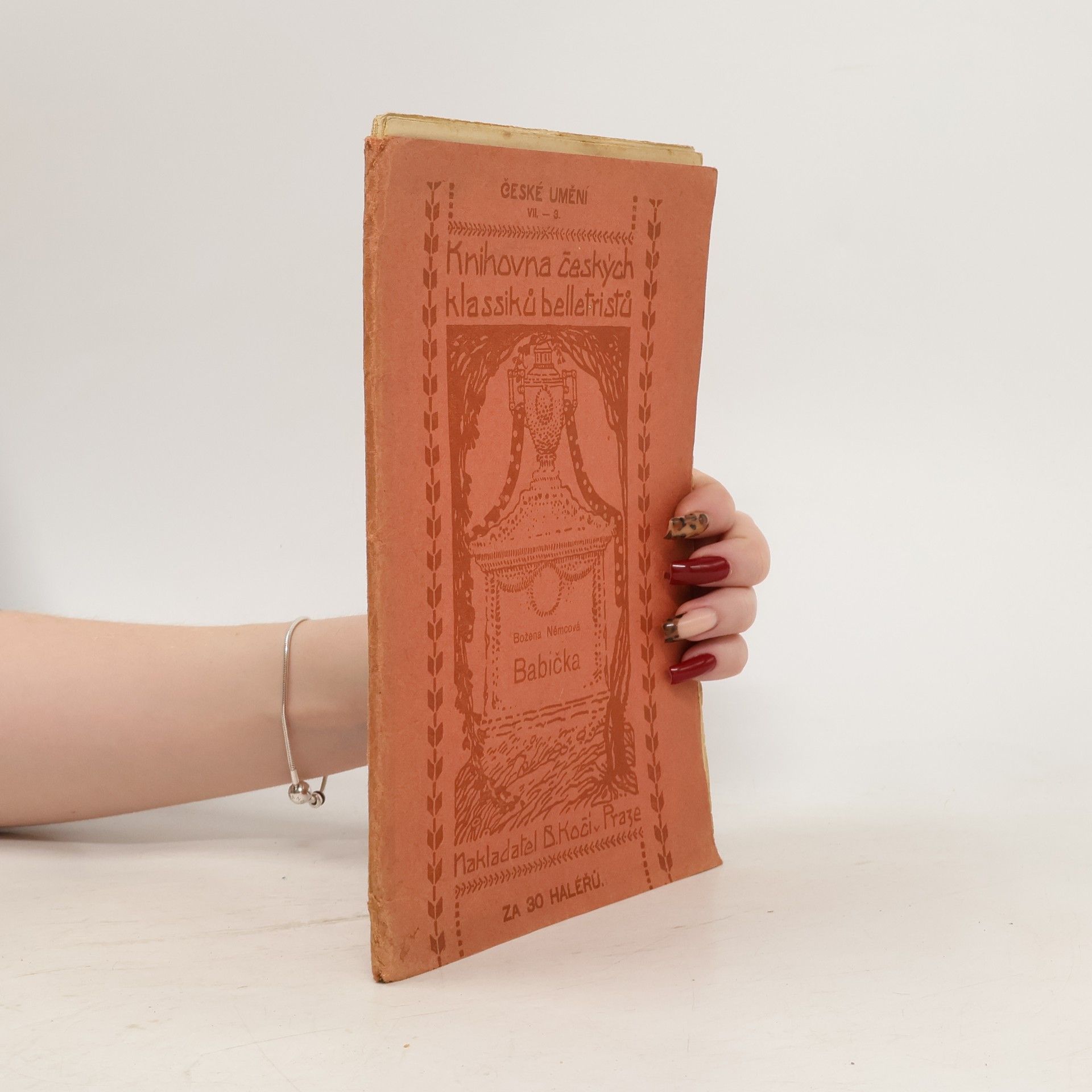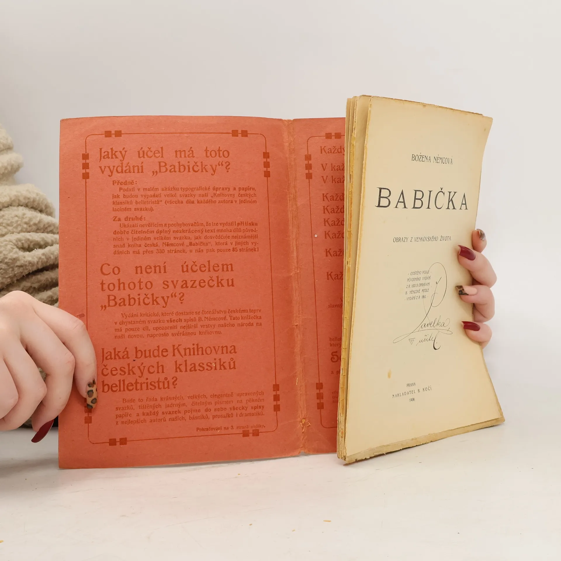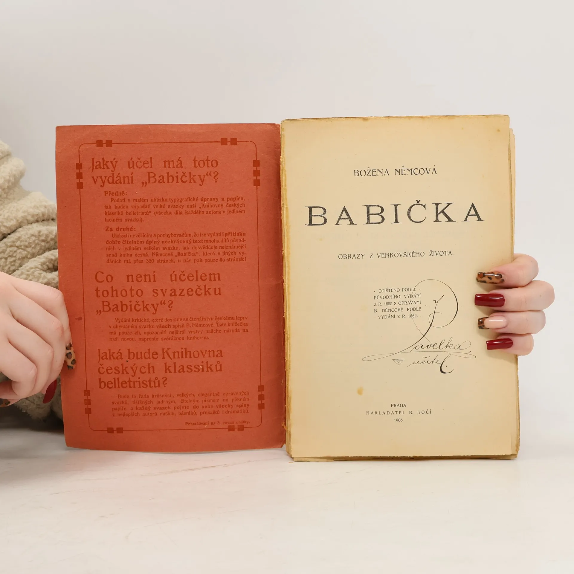 Božena Němcová: Babička - obrazy z venkovského života. Rok 1906. Formát cca 24 x 16 cm. Edice: Knihovna českých klassiků belletristů. Otištěno podle původního vydání z roku 1855 s opravami B. Němcové podle vydání z roku 1862. Nakladatelství B. Kočího v Praze, Františkovo nábřeží 14.