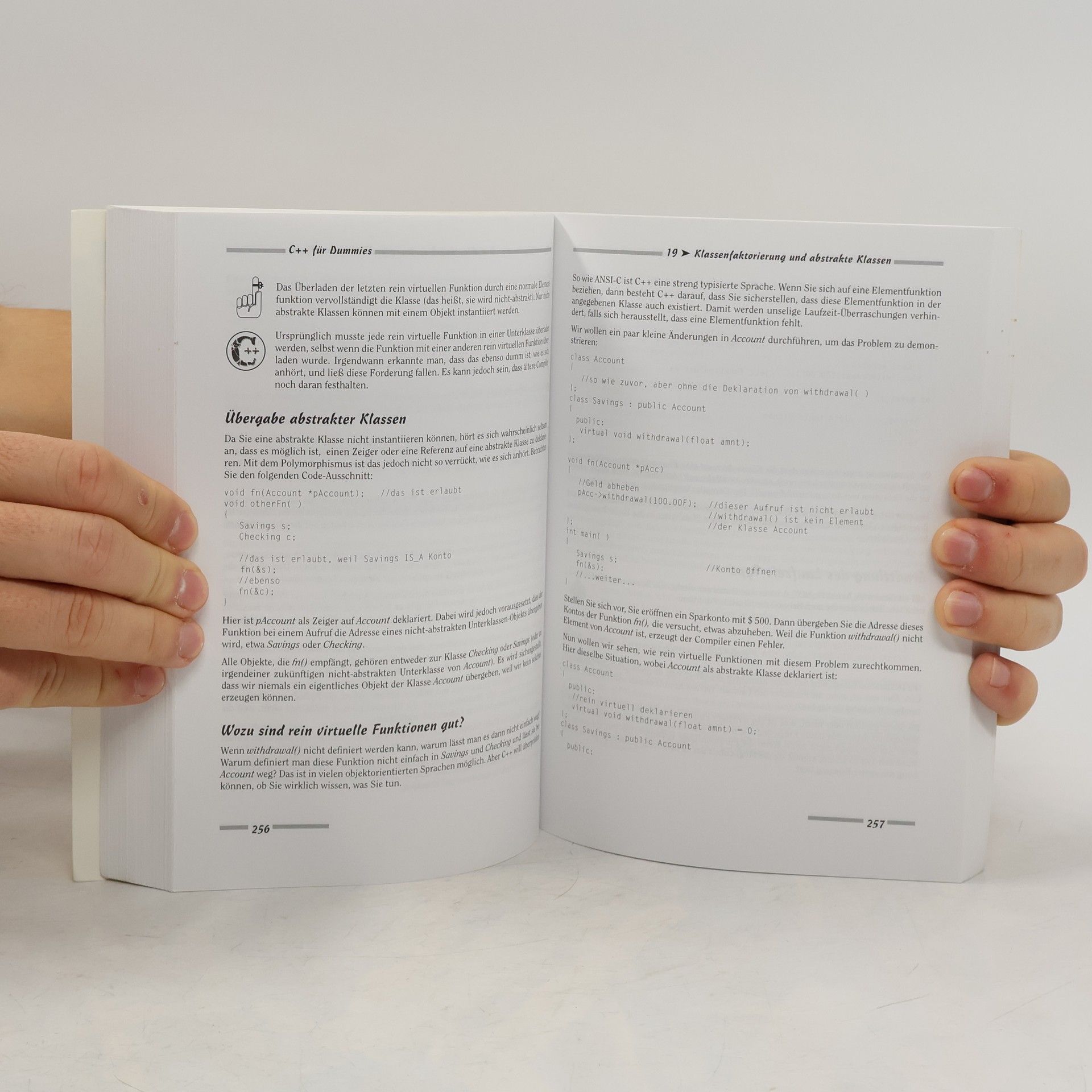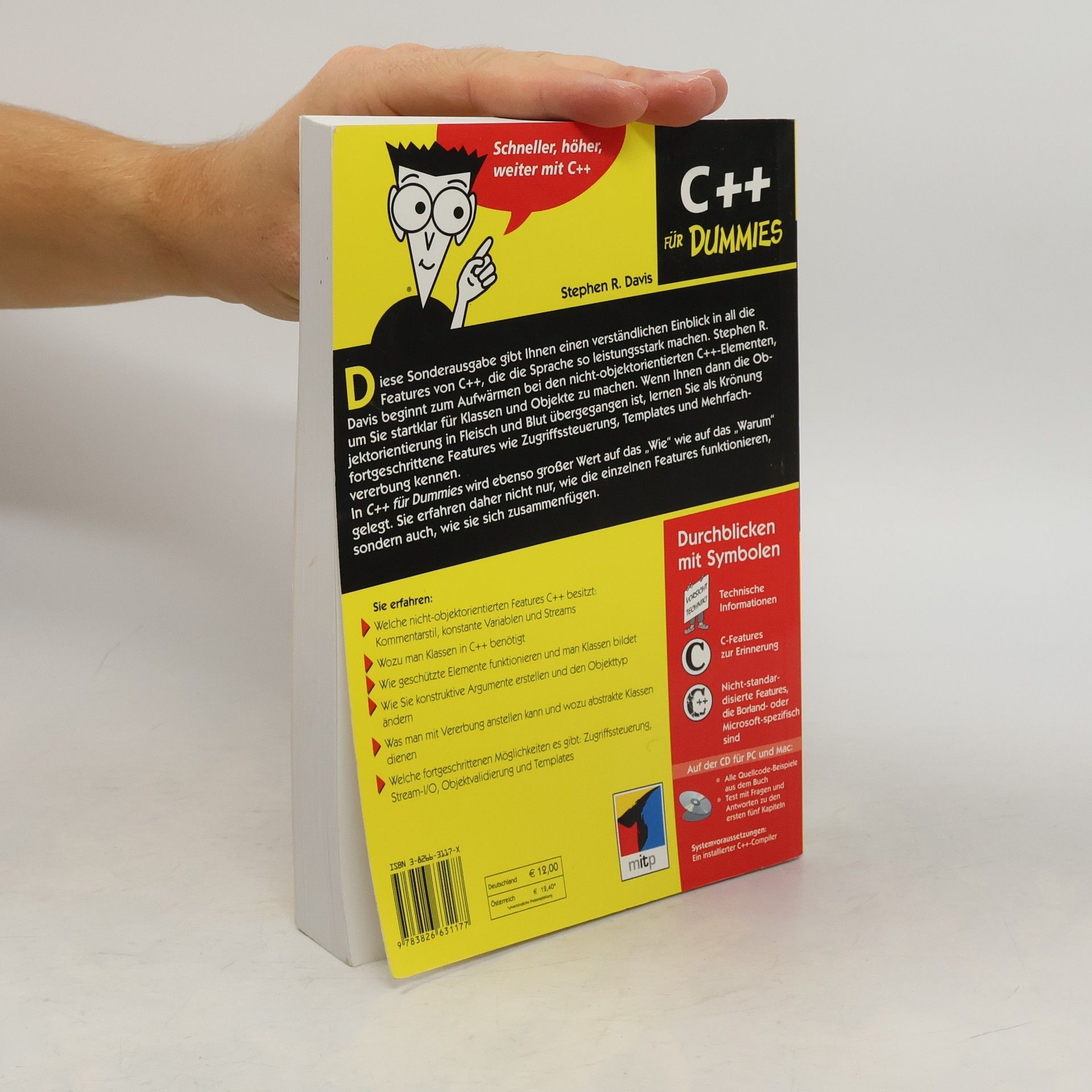 Diese Sonderauflage gibt Ihnen einen verständlichen Einblick in all die Features von C++, die die Sprache so leistungsstark machen. Stephen R. Davis beginnt zum Aufwärmen bei den Nicht-objektorientierten C++-Elementen, um Sie startklar für Klassen und Objekte zu machen. Wenn Ihnen dann die Objektorientierung in Fleisch und Blut übergegangen ist, lernen Sie als Krönung fortgeschrittene Features wie Zugriffssteuerung, Templates und Mehrfachvererbung kennen. In C++ für Dummies wird ebenso großer Wert auf das „Wie“ wie auf das „Warum“ gelegt. Sie erfahren daher nicht nur, wie die einzelnen Features funktionieren, sondern auch, wie sie sich zusammenfügen. Sie erfahren: - Welche nicht-objektorientierten Features C++ besitzt: Kommentarstil, Konstante Varia-blen und Streams - Wozu man Klassen in C++ benötigt - Wie Geschützte Elemente funktionieren und man Klassen bildet - Wie Sie konstruktive Argumente erstellen und den Objekttyp ändern - Was man mit Vererbung anstellen kann und wozu abstrakte Klassen dienen - Welche fortgeschrittenen Möglichkeiten es gibt: Zugriffssteuerung, Stream-I/O, Objektva-lidierung und Templates