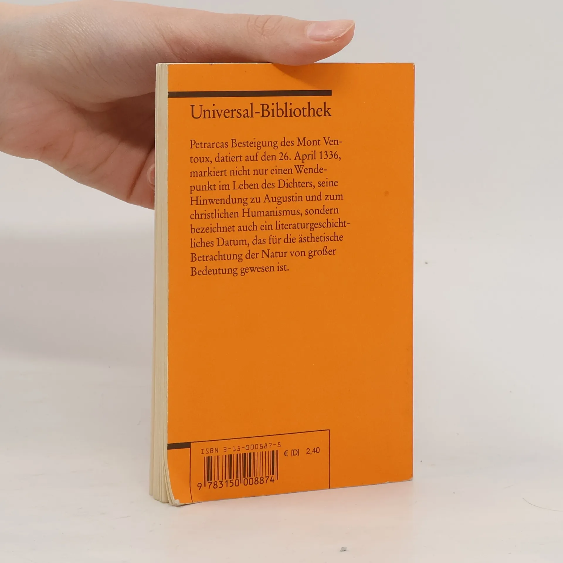 Patrarcas Besteigung des Mont Ventoux, datiert auf den 26. April 1336, markiert nicht nur einen Wendepunkt im Leben des Dichters, seine Hinwendung zu Augustin und zum christlichen Humanismus, sondern bezeichnet auch ein literaturgeschichtliches Datum, das für die ästhetische Betrachtung der Natur von großer Bedeutung gewesen ist. Sprachen: Deutsch, Latein