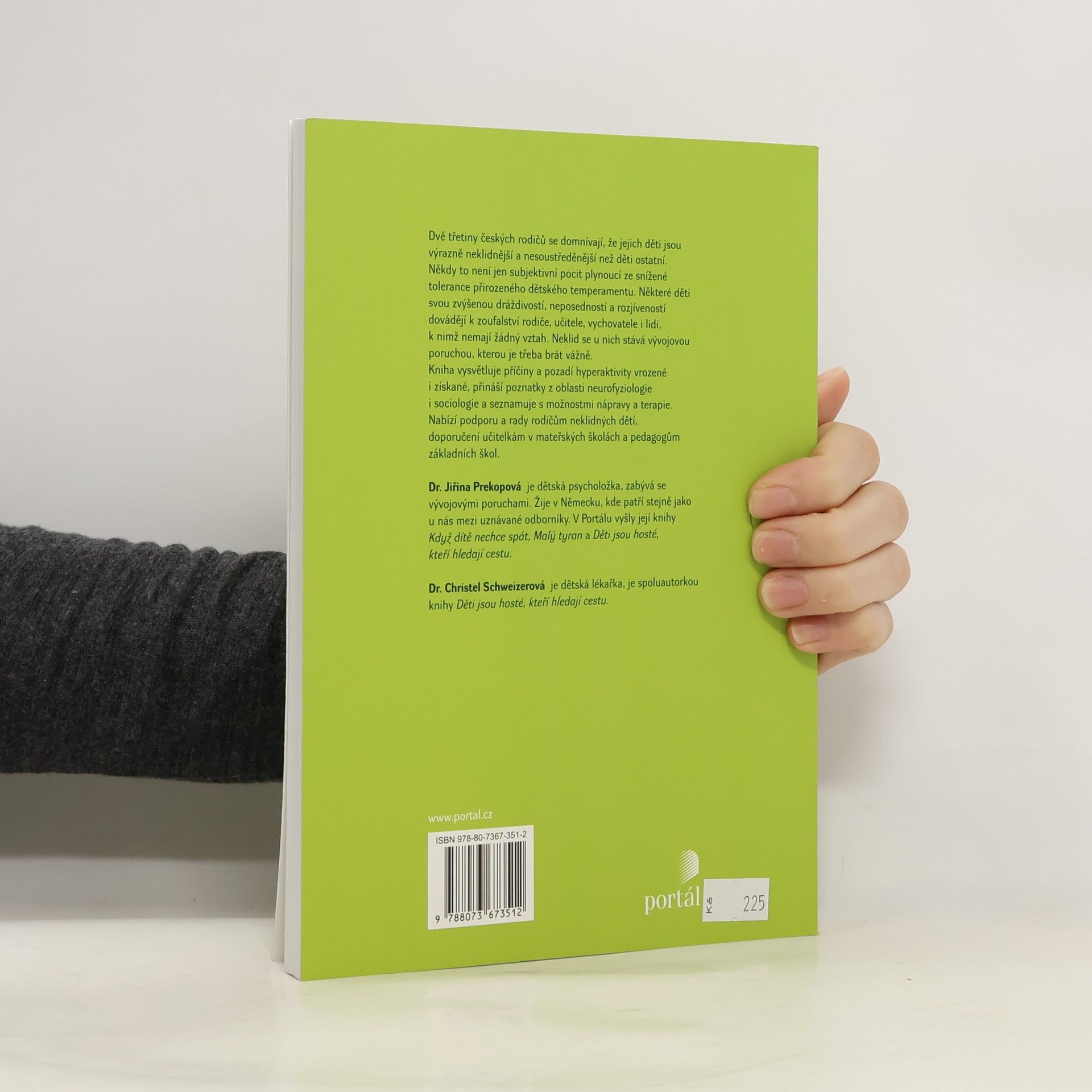 Dvě třetiny českých rodičů se domnívají, že jejich děti jsou výrazně neklidnější a nesoustředěnější než děti ostatní. Někdy to není jen subjektivní pocit plynoucí ze snížené tolerance přirozeného dětského temperamentu. Některé děti svou zvýšenou dráždivostí, neposedností a rozjíveností dovádějí k zoufalství rodiče, učitele, vychovatele i lidi, k nimž nemají žádný vztah. Neklid se u nich stává vývojovou poruchou, kterou je třeba brát vážně. Kniha vysvětluje příčiny hyperaktivity vrozené i získané, přináší poznatky z oblasti neurofyziologie i sociologie a seznamuje s možnostmi nápravy-terapie. Nabízí podporu a rady rodičům neklidných dětí, doporučení učitelkám v mateřských školách a pedagogům ZŠ. Dr. J. Prekopová je uznávaná dětská psycholožka, zabývá se vývojovými poruchami. Žije v Německu. V Portálu vyšly její knihy Když dítě nechce spát, Malý tyran a Děti jsou hosté, kteří hledají cestu. Dr. Ch. Schweizerová je dětská lékařka, spoluautorka knihy Děti jsou hosté, kteří hledají cestu.