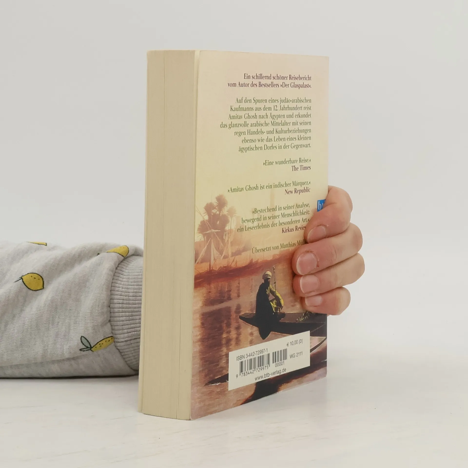 Amitav Ghosh erkundet das glanzvolle arabische Mittelalter. Der große indische Erzähler Amitav Ghosh reist auf den Spuren eines judäo-arabischen Kaufmanns und seines indischen Sklaven in ein oberägyptisches Dorf. Dort will er Ben Yijus Leben erforschen, dessen schriftliche Zeugnisse in einer Kairoer Synagoge entdeckt wurden. Sie zeugen von einer bemerkenswert kosmopolitischen, toleranten Existenz im Mittleren Osten des 12. Jahrhunderts. Der lebensfrohe Jude Ben Yiju steht in regem Briefkontakt mit Moslems in der gesamten orientalischen Welt; er heiratet eine hinduistische Sklavin. Kulturelle, politische und Standesgrenzen scheinen ihm wenig bedeutet zu haben. Zusammen mit der Geschichte der Bewohner des heutigen Dorfes entsteht die Vision einer Weltordnung, die auf kultureller Vielfalt und Toleranz basiert.