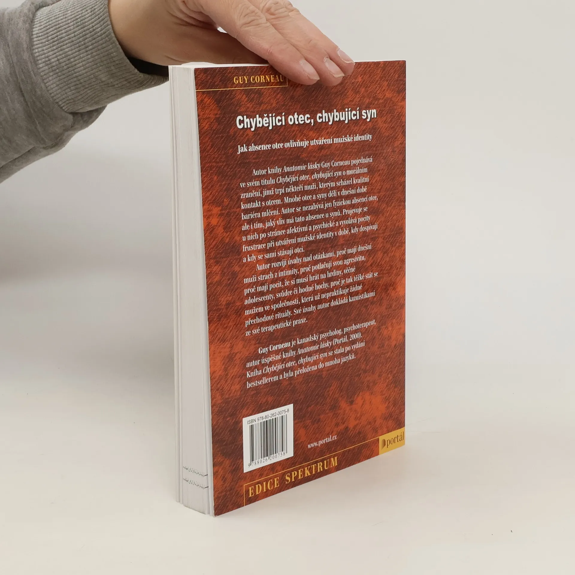 Jak absence otce ovlivňuje utváření mužské identity. Autor úspěšné knihy Anatomie lásky Guy Corneau pojednává v tomto titulu o morálním zranění, jímž trpí někteří muži, kterým scházel kvalitní kontakt s otcem. Fyzická absence otce se u nich projevuje po stránce afektivní a psychické a vyvolává určité nedostatky při utváření mužské identity ještě i v době, když tito synové dospěli, případně se sami stali otci. Autor vychází z vlastního života (zejména ze vztahu s vlastním otcem, resp. bez něj), z portrétů různých mužů a jejich příběhů a z příkladů z vlastní terapeutické praxe. Seznamuje čtenáře s tím, jak se tito muži jeví navenek, a jací doopravdy jsou uvnitř. Ukazuje důsledky, jež se projevily u synů, kteří vyrostli bez otce nebo jakoby bez otce. Ve své knize nabízí možnosti k lepšímu vzájemnému pochopení a souznění mezi mužem a ženou, rodiči a dětmi. V závěrečných kapitolách ukazuje, jak najít východiska a zbavovat se důsledků. Kniha Chybějící otec, chybující syn se stala po vydání bestsellerem, vychází v doplňovaných a revidovaných vydáních ve frankofonních zemích opakovaně a byla přeložena do desítky jazyků. Guy Corneau je kanadský psycholog, psychoterapeut, autor úspěšné knihy Anatomie lásky (Portál, 2000). V Kanadě i ve Francii vydal ještě několik úspěšných knižních titulů, pořádá přednášky, účastní se konferencí, vystupuje ve sdělovacích prostředcích.