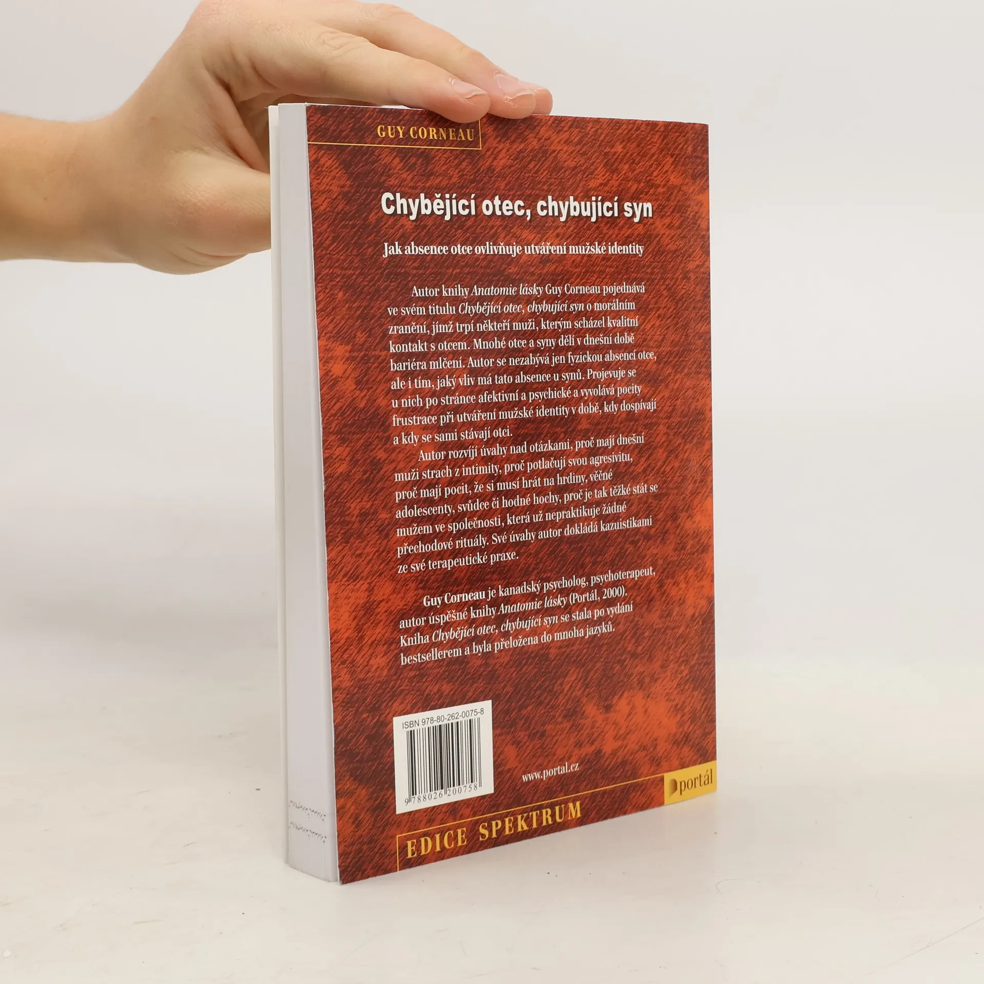 Jak absence otce ovlivňuje utváření mužské identity. Autor úspěšné knihy Anatomie lásky Guy Corneau pojednává v tomto titulu o morálním zranění, jímž trpí někteří muži, kterým scházel kvalitní kontakt s otcem. Fyzická absence otce se u nich projevuje po stránce afektivní a psychické a vyvolává určité nedostatky při utváření mužské identity ještě i v době, když tito synové dospěli, případně se sami stali otci. Autor vychází z vlastního života (zejména ze vztahu s vlastním otcem, resp. bez něj), z portrétů různých mužů a jejich příběhů a z příkladů z vlastní terapeutické praxe. Seznamuje čtenáře s tím, jak se tito muži jeví navenek, a jací doopravdy jsou uvnitř. Ukazuje důsledky, jež se projevily u synů, kteří vyrostli bez otce nebo jakoby bez otce. Ve své knize nabízí možnosti k lepšímu vzájemnému pochopení a souznění mezi mužem a ženou, rodiči a dětmi. V závěrečných kapitolách ukazuje, jak najít východiska a zbavovat se důsledků. Kniha Chybějící otec, chybující syn se stala po vydání bestsellerem, vychází v doplňovaných a revidovaných vydáních ve frankofonních zemích opakovaně a byla přeložena do desítky jazyků. Guy Corneau je kanadský psycholog, psychoterapeut, autor úspěšné knihy Anatomie lásky (Portál, 2000). V Kanadě i ve Francii vydal ještě několik úspěšných knižních titulů, pořádá přednášky, účastní se konferencí, vystupuje ve sdělovacích prostředcích.