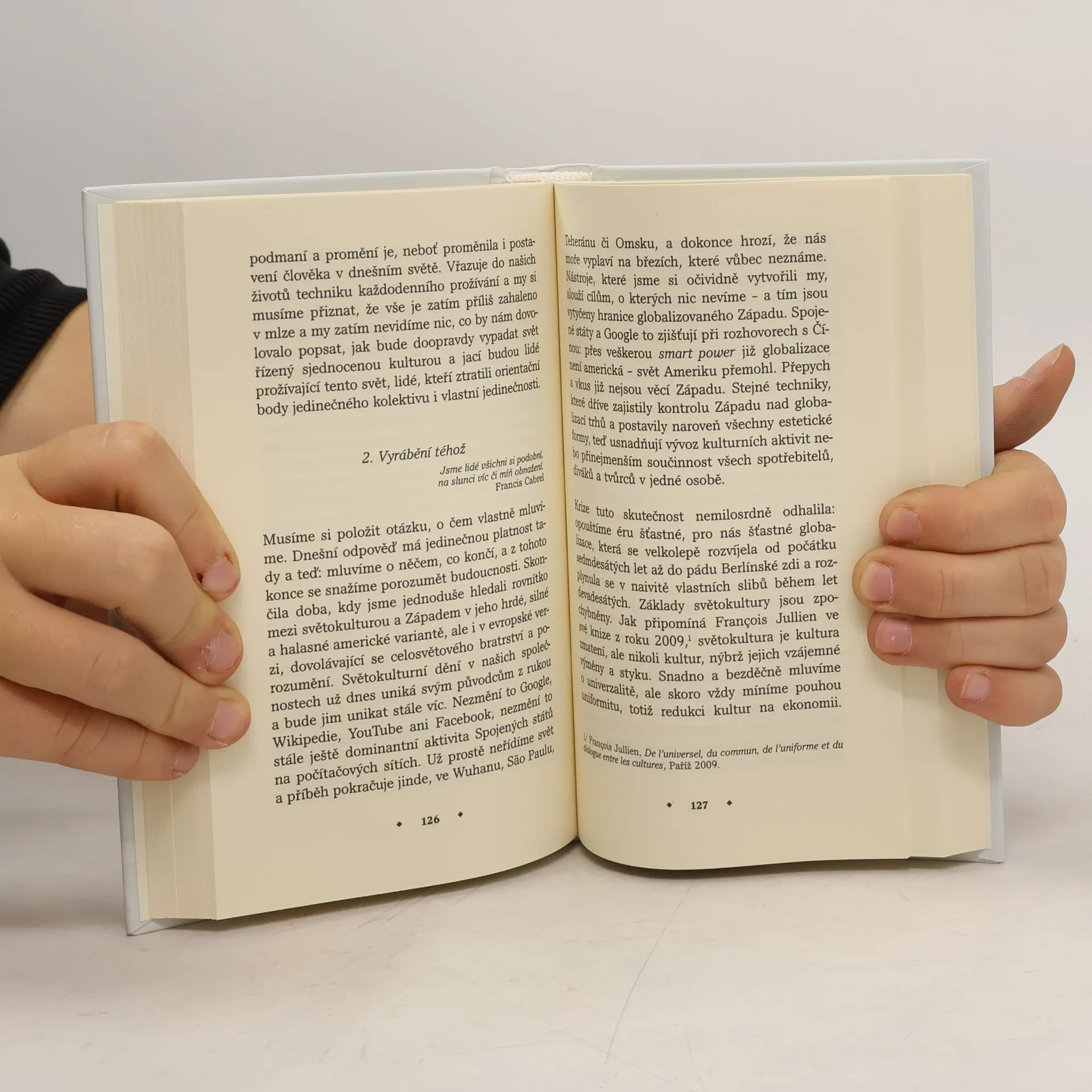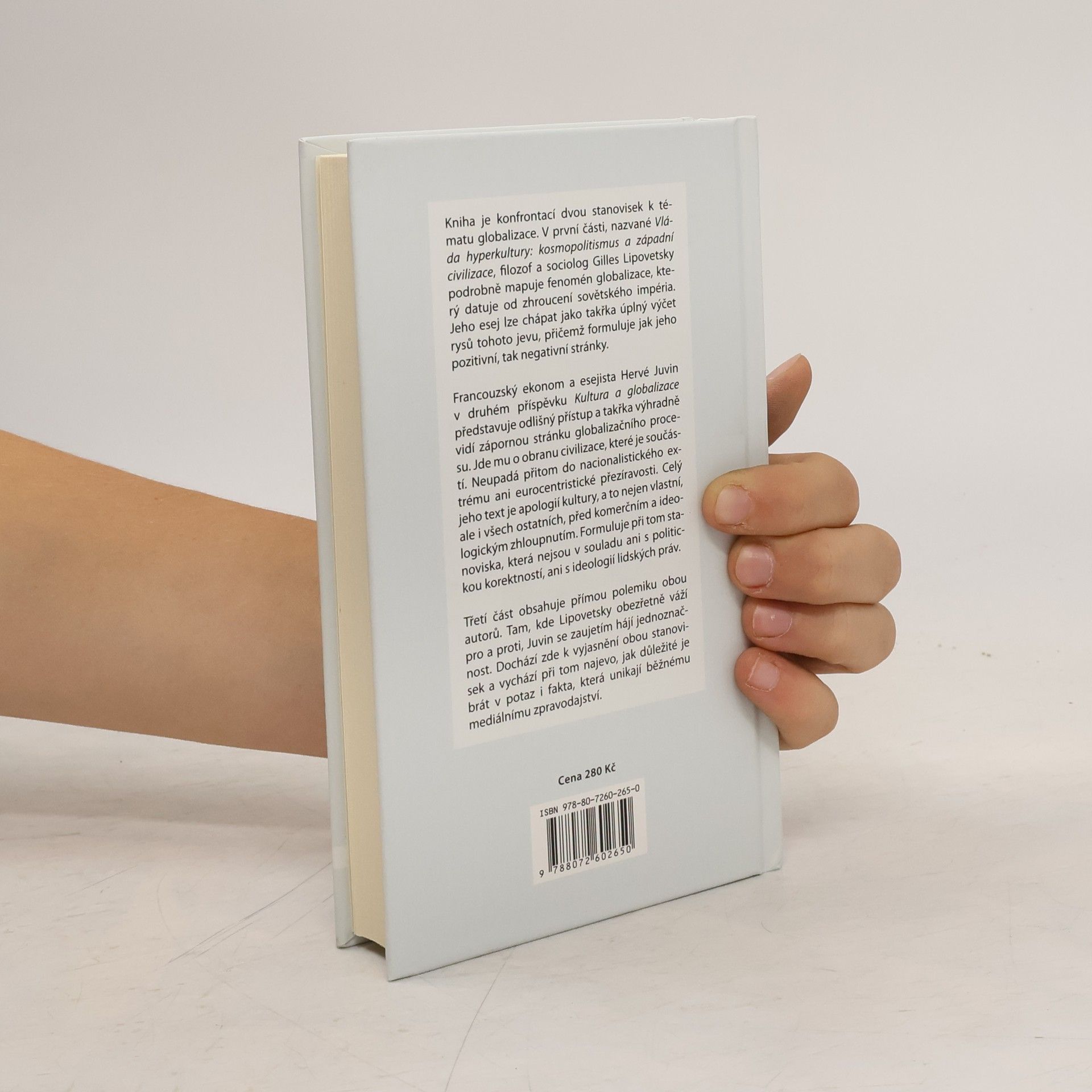Kniha je konfrontací dvou stanovisek k tématu globalizace. V první části, nazvané Vláda hyperkultury: kosmopolitismus a západní civilizace, filozof a sociolog Gilles Lipovetsky podrobně mapuje fenomén globalizace, který datuje od zhroucení sovětského impéria. Jeho esej lze chápat jako takřka úplný výčet rysů tohoto jevu, přičemž formuluje jak jeho pozitivní, tak negativní stránky. Francouzský ekonom a esejista Hervé Juvin v druhém příspěvku Kultura a globalizace představuje odlišný přístup a takřka výhradně vidí zápornou stránku globalizačního procesu. Jde mu o obranu civilizace, které je součástí. Neupadá přitom do nacionalistického extrému ani eurocentristické přezíravosti. Celý jeho text je apologií kultury, a to nejen vlastní, ale i všech ostatních, před komerčním a ideologickým zhloupnutím. Formuluje při tom stanoviska, která nejsou v souladu ani s politickou korektností, ani s ideologií lidských práv. Třetí část obsahuje přímou polemiku obou autorů. Tam, kde Lipovetsky obezřetně váží pro a proti, Juvin se zaujetím hájí jednoznačnost. Dochází zde k vyjasnění obou stanovisek a vychází při tom najevo, jak důležité je brát v potaz i fakta, která unikají běžnému mediálnímu zpravodajství.