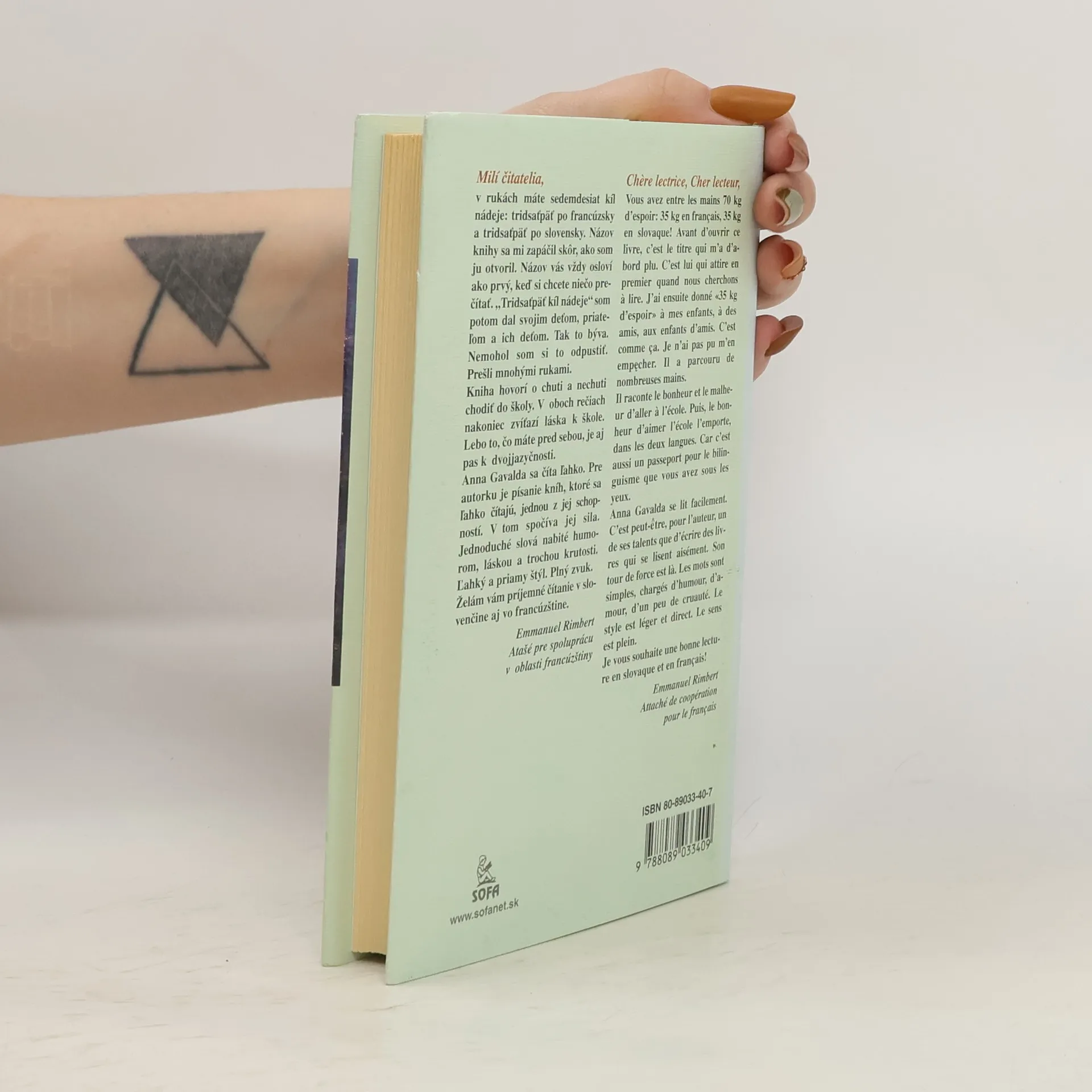 Anna Gavalda sa číta ľahko, pre autorku je písanie jej schopnosťou. V tom spočíva jej sila. Jednoduché slová nabité humorom, láskou a trochou krutosti: Nenávidím školu. Nenávidím ju zo všetkého na svete najviac. A ešte viac ju nenávidím... Ničí mi život... V oboch rečiach, vo francúzštine aj slovenčine, nakoniec však zvíťazí láska ku škole. Kniha je tiež pasom k čitateľovej dvojjazyčnosti.