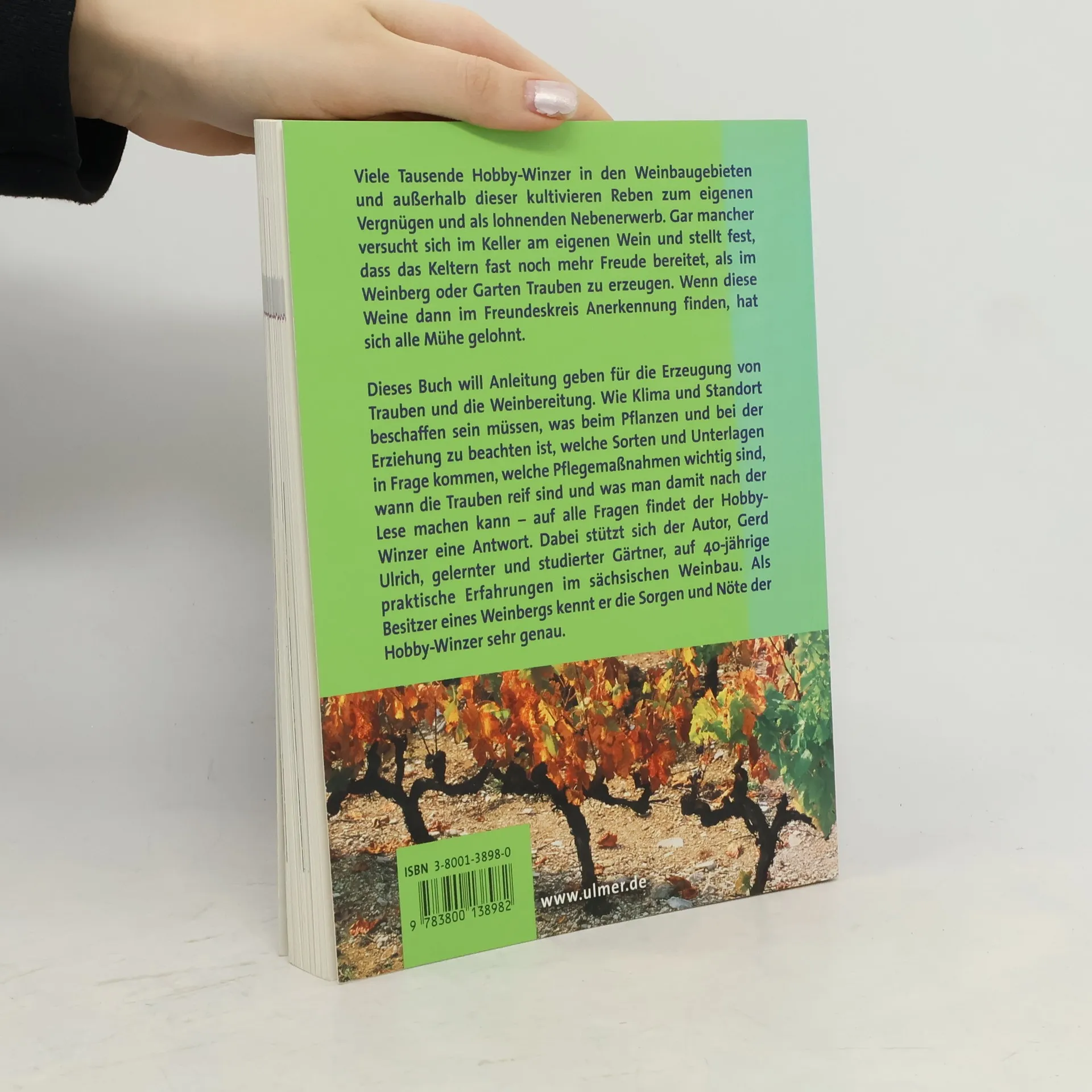 Viele Tausende Hobby-Winzer in den Weinbaugebieten und ausserhalb dieser kultivieren Reben zum eigenen Vergnügen und als lohnenden Nebenerwerb. Gar mancher versucht sich im Keller am eigenen Wein und stellt fest, dass das Keltern fast noch mehr Freude bereitet, als im Weinberg oder Garten Trauben zu erzeugen. Wenn diese Weine dann im Freundeskreis Anerkennung finden, hat sich alle Mühe gelohnt. Dieses Buch will Anleitung geben für die Erzeugung von Trauben und die Weinbereitung. Wie Klima und Standort beschaffen sein müssen, was beim Pflanzen und bei der Erziehung zu beachten ist, welche Sorten und Unterlagen in Frage kommen, welche Pflegemassnahmen wichtig sind, wann die Trauben reif sind und was man damit nach der Lese machen kann - auf alle Fragen findet der Hobby-Winzer eine Antwort. Dabei stützt sich der Autor, Gerd Ulrich, gelernter und studierter Gärtner, auf 40-jährige praktische Erfahrungen im sächsischen Weinbau. Als Besitzer eines Weinbergs kennt er die Sorgen und Nöte der Hobby-Winzer sehr genau.