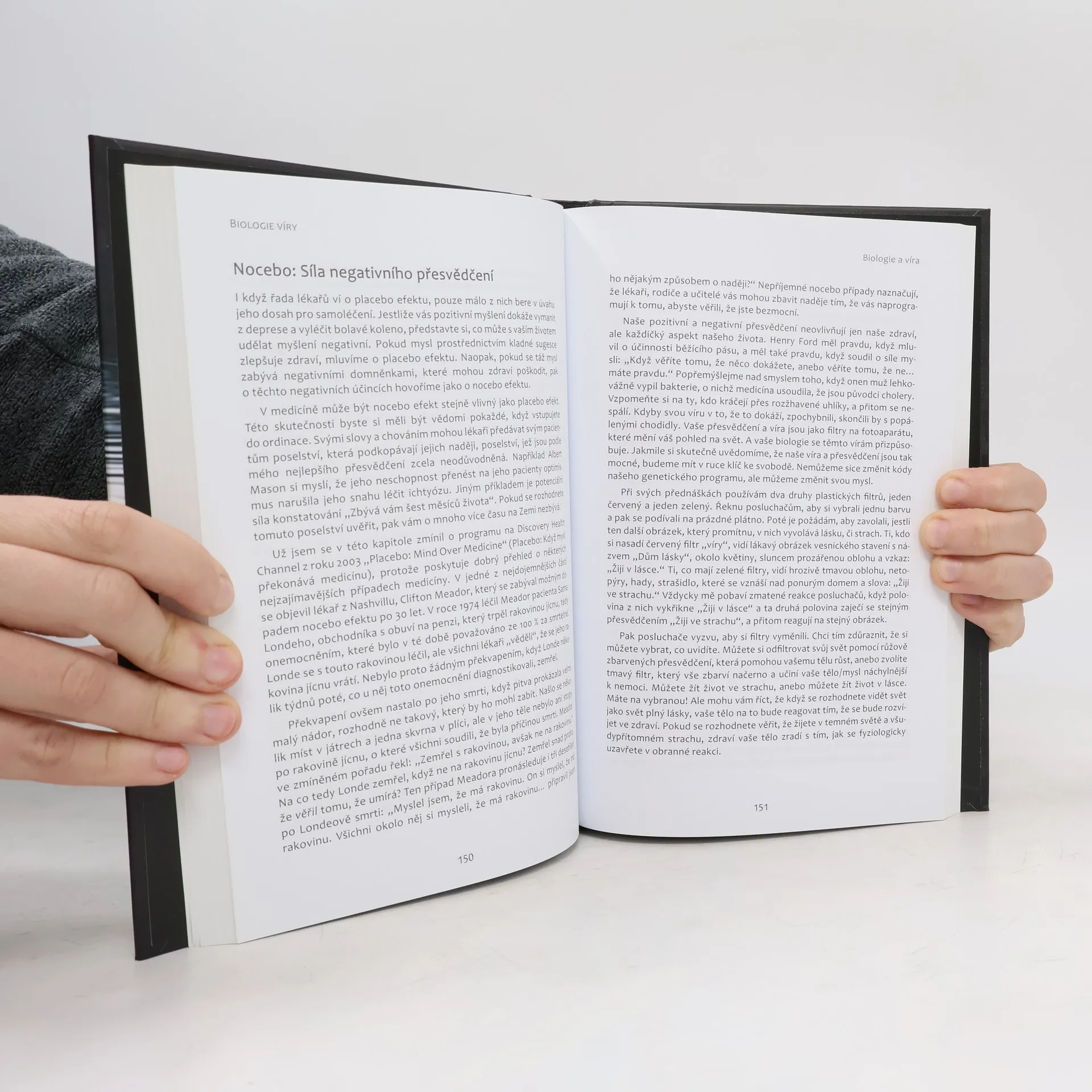 Přestože název knihy mnoho nenapoví, její obsah vás překvapí, či dokonce ohromí. Věřte, že tělo i mysl lze změnit pouhými myšlenkami Autor v knize Biologie víryodhaluje tajemství, ke kterému vědci dospěli teprve nedávno, a sice že můžeme změnit svou biologii – tedy naše tělo i mysl – díky svému uvědomělému chování a myšlenkám. Jak sám ověřil na vlastním životě i na mnoha pokusech, to, co nás zásadním způsobem ovlivňuje, není naše DNA, jak si dosud vědci mysleli, ale buněčná membrána, skrze niž se do buňky dostává vše potřebné, od výživy, léků až po stresové hormony. To je tedy ten „mozek buňky“, který pro nás má tak zásadní význam. Myslete pozitivně – pomůžete tak svému tělu Jsme-li v dobré pohodě, buňky dostávají vše potřebné pro svůj růst. Pokud však žijeme ve strachu a neustálém stresu, buňky chřadnou – jsou totiž v obranné pozici, která jim neumožňuje růst a rozvíjet se. Autor na mnoha zajímavých pokusech a také příkladech ze života přibližuje čtenáři fungování buňky, vliv buněčné membrány a DNA a dokazuje, že život není založen jen na „materiální“ informaci, hmotě, v tomto případě představované DNA, ale že jej ovlivňují a řídí nehmotné, energetické signály z prostředí mimo buňku.