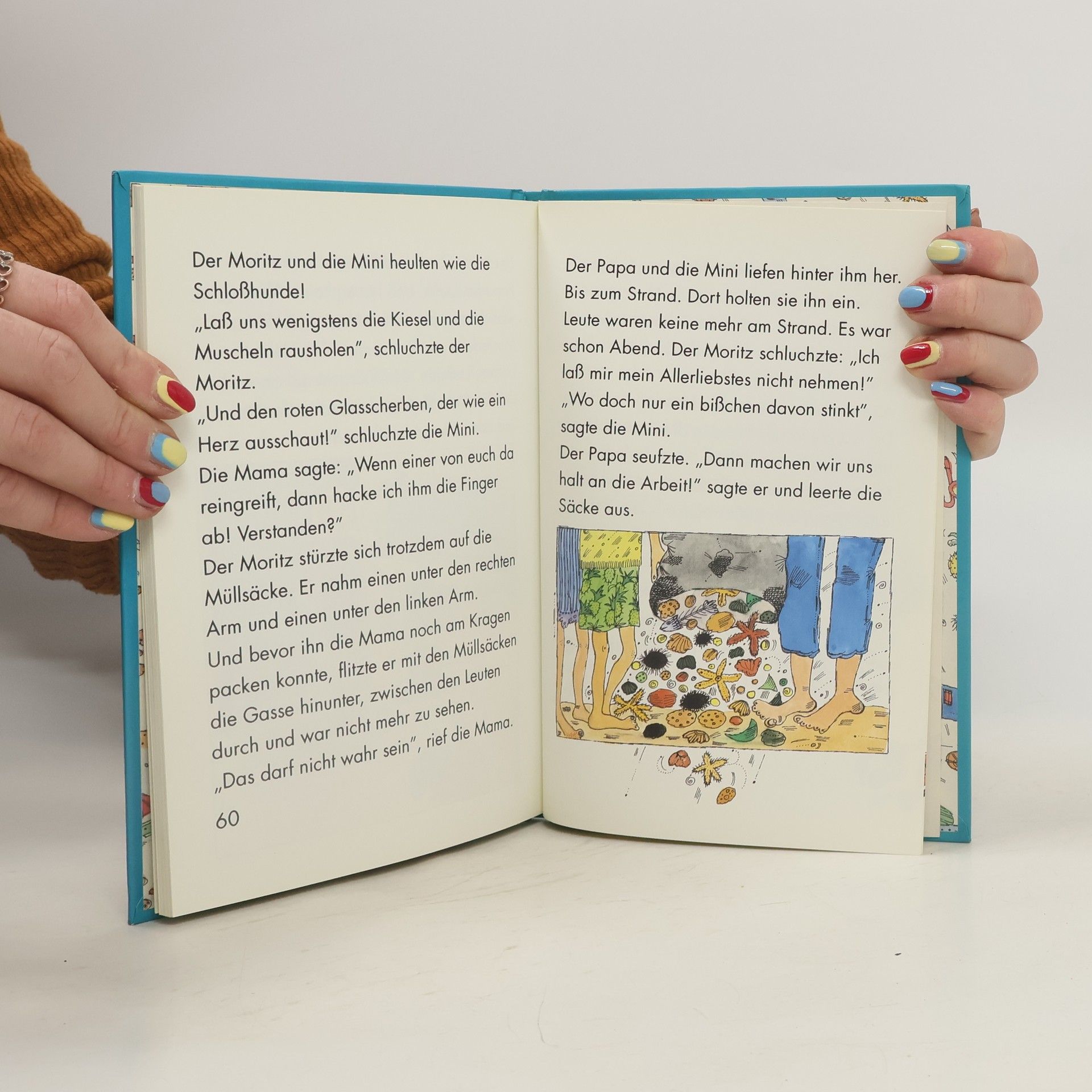 Mini, Moritz, Papa und Mama fahren im Urlaub nach Italien. Mini und Moritz haben vil zuviel Gepäck, die Fahrt ist entsetzlich lang und am Strand gibt es keinen Schatten. Dabei ist Mini so empfindlich gegen Sonne. Was hilft da? Eine tolle Kriegsbemalung.