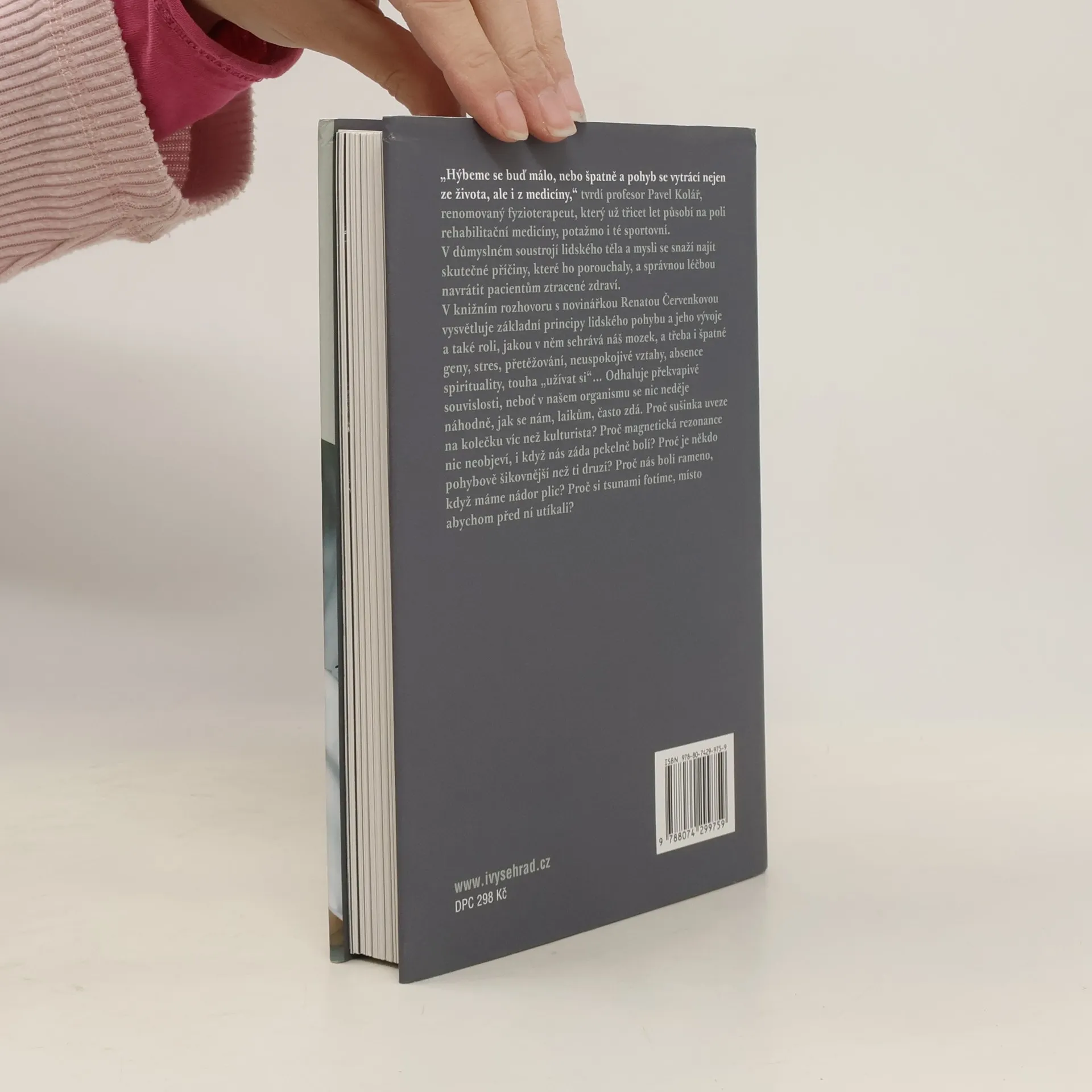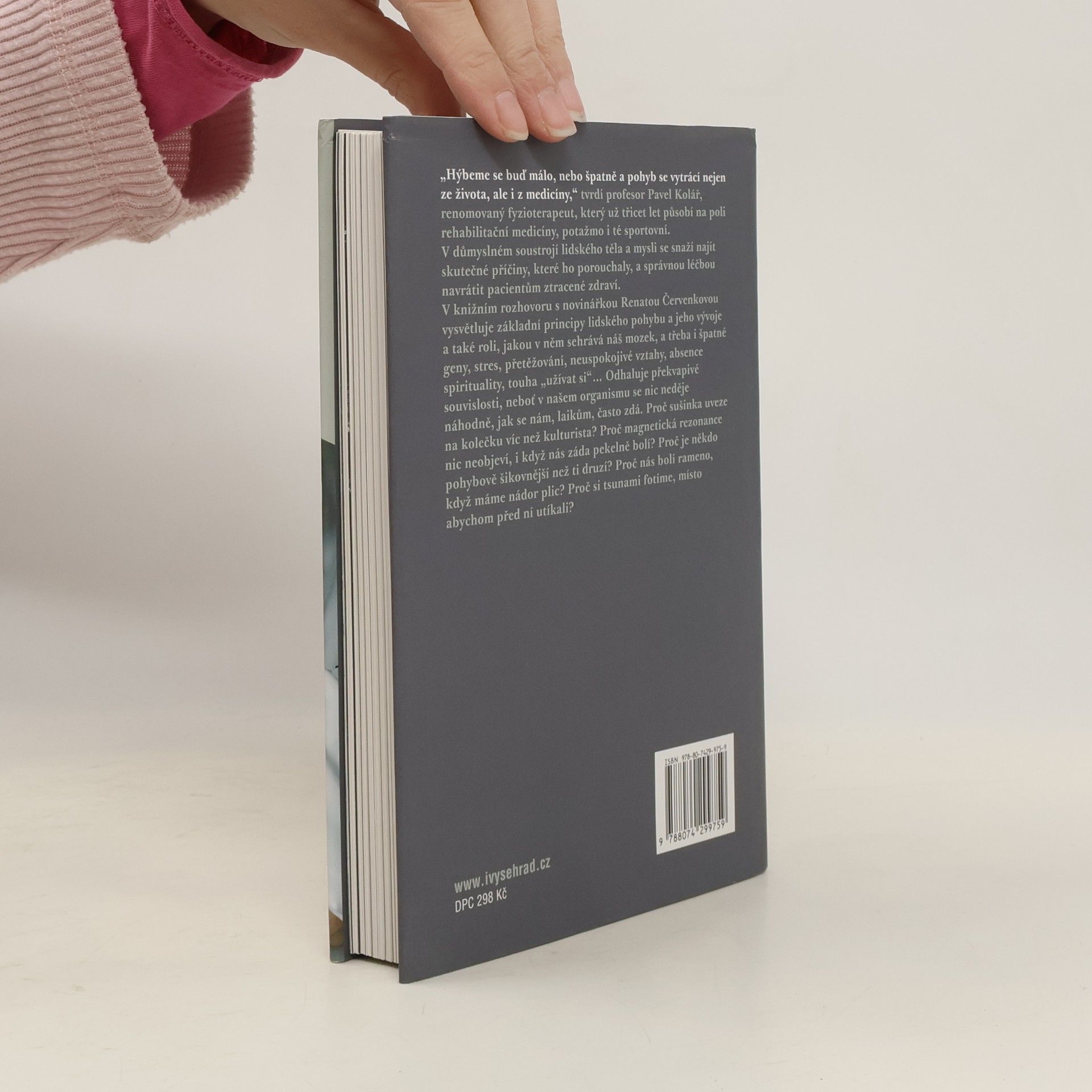Knižní rozhovor s renomovaným fyzioterapeutem prof. Kolářem. „Hýbeme se buď málo, nebo špatně a pohyb se vytrácí nejen ze života, ale i z medicíny,“ tvrdí profesor Pavel Kolář, renomovaný fyzioterapeut, který už třicet let působí na poli rehabilitační medicíny, potažmo i té sportovní. V důmyslném soustrojí lidského těla a mysli se snaží najít skutečné příčiny, které ho porouchaly, a správnou léčbou navrátit pacientům ztracené zdraví. V rozhovorech s novinářkou Renátou Červenkovou vysvětluje základní principy lidského pohybu a jeho vývoje a také roli, jakou v něm sehrává náš mozek a třeba i špatné geny, stres, přetěžování, neuspokojivé vztahy, absence spirituality, touha „užívat si“... Odhaluje překvapivé souvislosti, neboť v našem organismu se nic neděje náhodně, jak se nám, laikům, často zdá. Proč nás bolí rameno, když máme nádor plic? Proč sušinka uveze na kolečku víc než kulturista? Proč magnetická rezonance nic neobjeví, i když nás záda pekelně bolí? Proč je někdo pohybově šikovnější než ti druzí? Proč si tsunami fotíme, místo abychom před ní utíkali?
