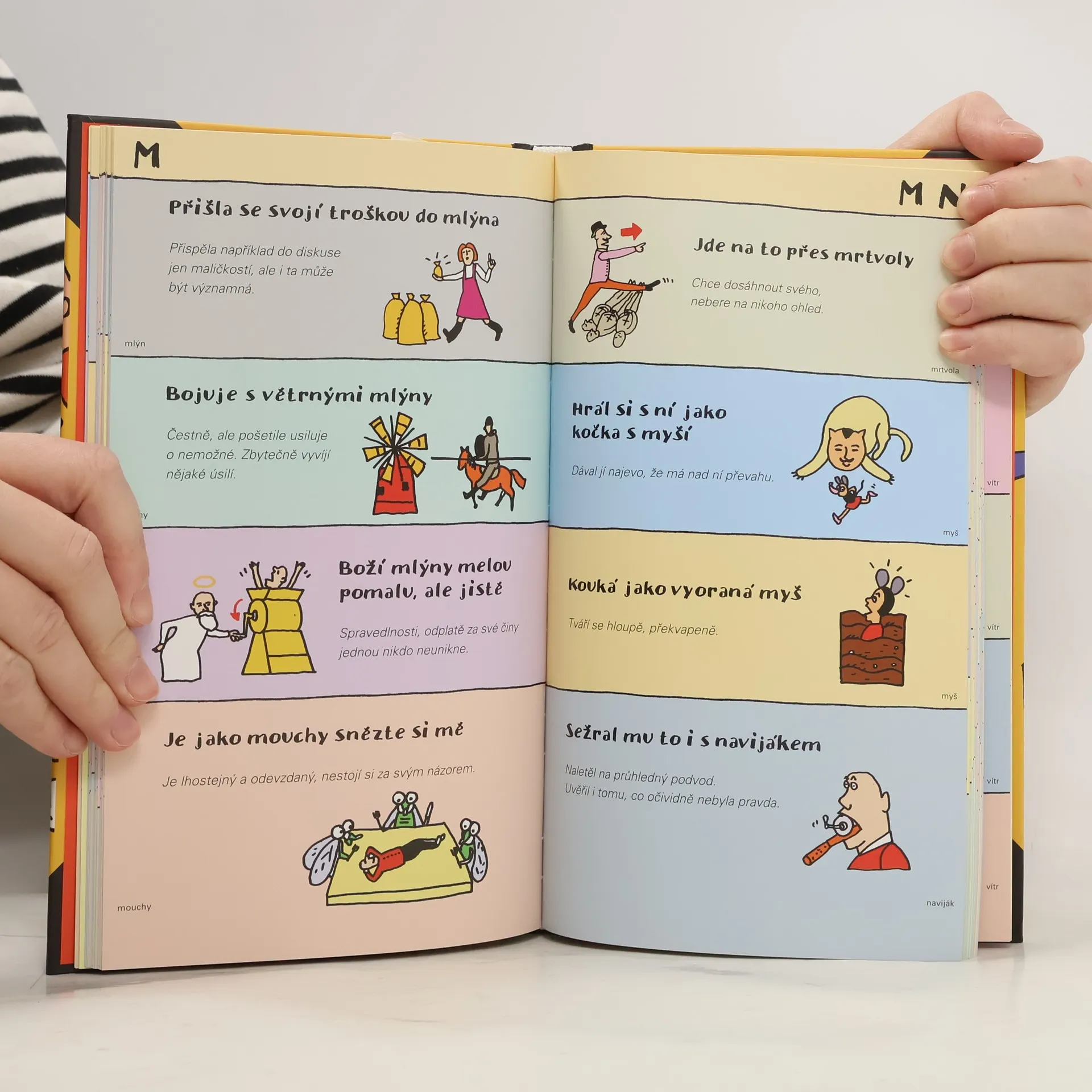 500 hesel. Náš životní styl se natolik změnil, že čistě obsahově jsou pro nás klasická česká přísloví již nesrozumitelná. A tím spíš jsou nesrozumitelná pro děti. Přitom znalost přísloví bývá součástí přijímacích testů na střední školy. Tato půvabná, hravě provedená knížka plná ilustrací, je určená dětem, ale nejen jim. Vždyť přísloví, pořekadla a přirovnání jsou součástí naší kultury. Každé přísloví obsahuje krátký srozumitelný výklad, základní heslo k vyhledání a ilustraci.