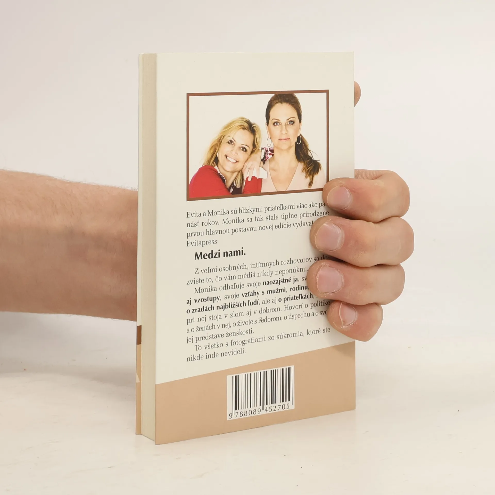 Z veľmi osobných až intímnych rozhovorov s nimi sa dozviete to, čo vám médiá nikdy neponúknu. Dnes, keď pozitívna informácia prestáva byť pre bulvár zaujímavá a čitateľom sa podsúvajú zväčša informácie o ľuďoch, ktorí šokujú svojimi bizarnosťami, a nie tým, že sú úspešní, múdri a chytrí, prichádza Evitapress s realizáciou nápadu predstaviť tieto ženy inak. Z druhej strany. Aké sú matky, priateľky, manželky, milenky. Čo milujú a čo rady nemajú. Aké sú ich slabosti a silné stránky. Nazrieme do ich súkromia aj do trinástych komnát. Ale to len – medzi nami... Prvá z tejto edície má názov Monika a v rozhovore s Evitou Urbaníkovou sa predstaví Monika Flašíková-Beňová. V knihe Monika odhaľuje svoje naozajstné ja, svoje pády aj vzostupy, svoje vzťahy s mužmi, rodinu, hovorí o zradách najbližších ľudí, ale aj o priateľkách, ktoré pri nej stoja v zlom aj v dobrom. Hovorí o tom, ako peniaze dokážu zamávať človekom, o politike a o ženách v nej, o živote s Fedorom, o úspechu a o svojej predstave ženskosti... Nájdete v nej aj fotografie zo súkromia, ktoré ste nikde nevideli. Nápad napísať knihu vznikol pred rokom na spoločnej dovolenke Evity s Flašíkovcami v Chorvátsku, dnes je na svete a je prvou zo série ďalších.