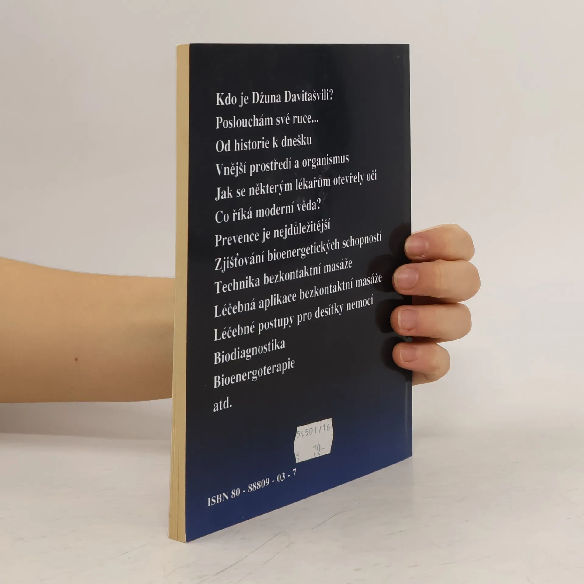 1. vydání Metoda Džuny Davitašvili- Bezkontaktní masáž Publikace zodpovídá na otázky působení člověka na druhého člověka pomocí své bioenergie, kdo je Džuna Davitašviliová - léčitelka schopná mnoha neuvěřitelných věcí pomocí své bioenergie, co je to "lidské biopole" a uvádí příklady bezkontaktní léčby.