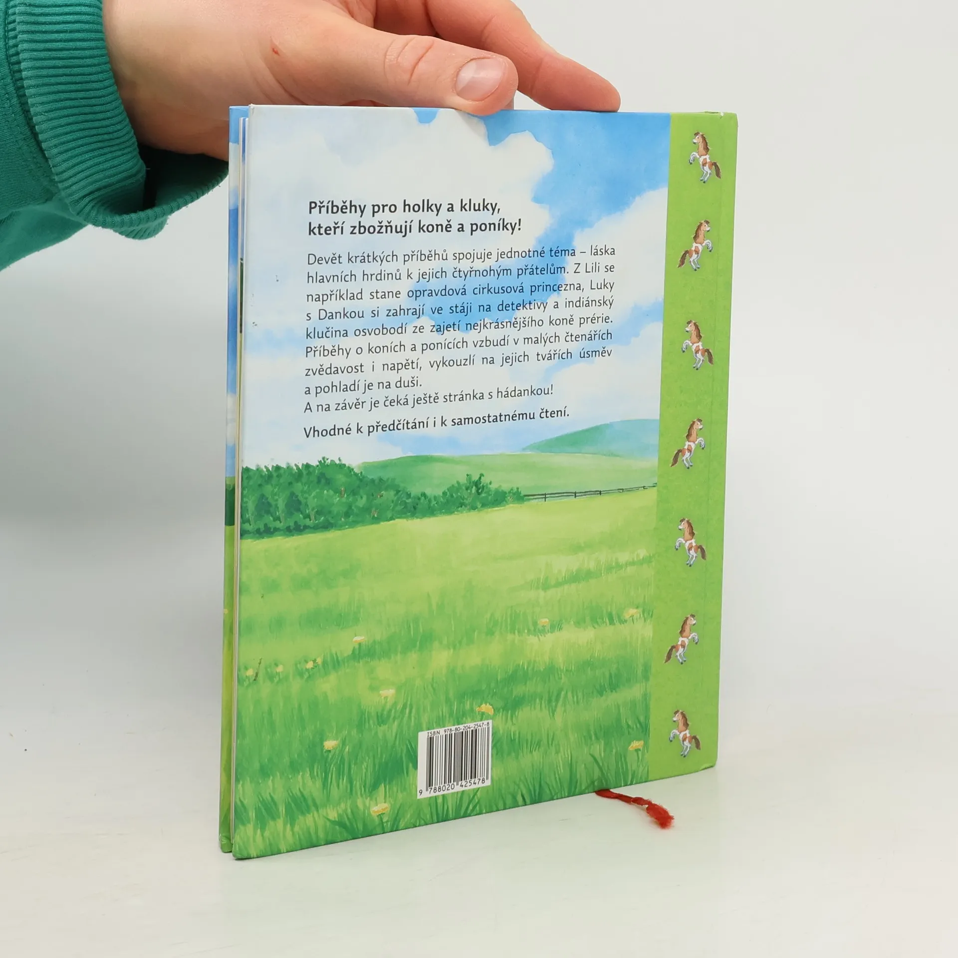 Každé vyprávění se odehrává v jiném prostředí, nechybí mu dobrodružná zápletka, napětí a samozřejmě šťastný konec. Tak je tu holčička z rodiny cirkusových umělců, které tatínek nechce dovolit akrobacii na koni; kluk, kterému se kluci smějí, že jeho největší láskou není fotbal, ale koně; ošklivé hříbátko; malý indián, který zachrání divokého koně před zloději, a další malí hrdinové. Milé příběhy jsou doprovázeny krásnými barevnými ilustracemi a na konci knihy čeká děti ještě malý úkol!