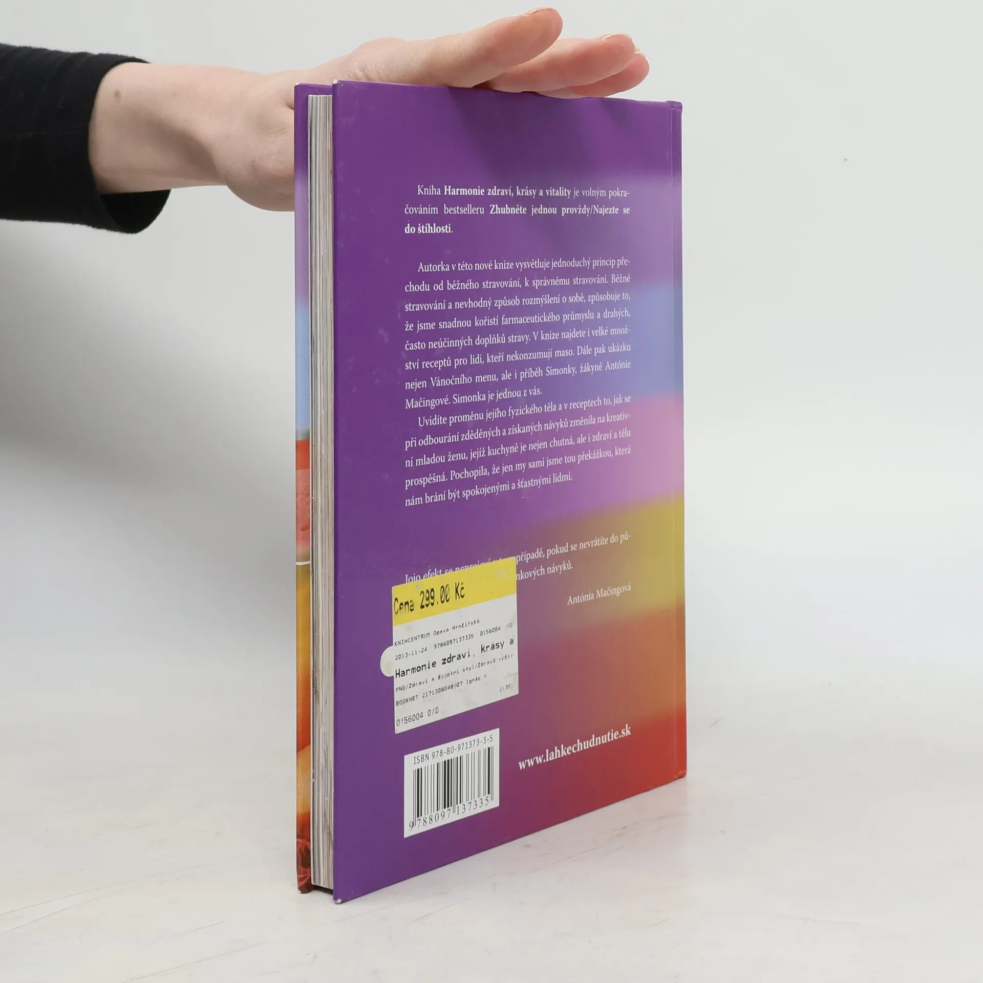 Autorka v této nové knize vysvětluje jednoduchý princip přechodu od běžného stravování, k správnému stravování. Běžné stravování a nevhodný způsob rozmýšlení o sobě, způsobuje to, že jsme snadnou kořistí farmaceutického průmyslu a drahých, často neúčinných doplňků stravy. V knize najdete i velké množství receptů pro lidi, kteří nekonzumují maso. Dále pak ukázku nejen Vánočního menu, ale i příběh Simonky, žákyně Antónie Mačingové. Simonka je jednou z vás. Uvidíte proměnu jejího fyzického těla a v receptech to, jak se při odbourání zděděných a získaných návyků změnila na kreativní mladou ženu, jejíž kuchyně je nejen chutná, ale i zdraví a tělu prospěšná. Pochopila, že jen my sami jsme tou překážkou, která nám brání být spokojenými a šťastnými lidmi. Jojo efekt se neprojeví v tom případě, pokud se nevrátíte do původních stravovacích návyků. Antónia Mačingová