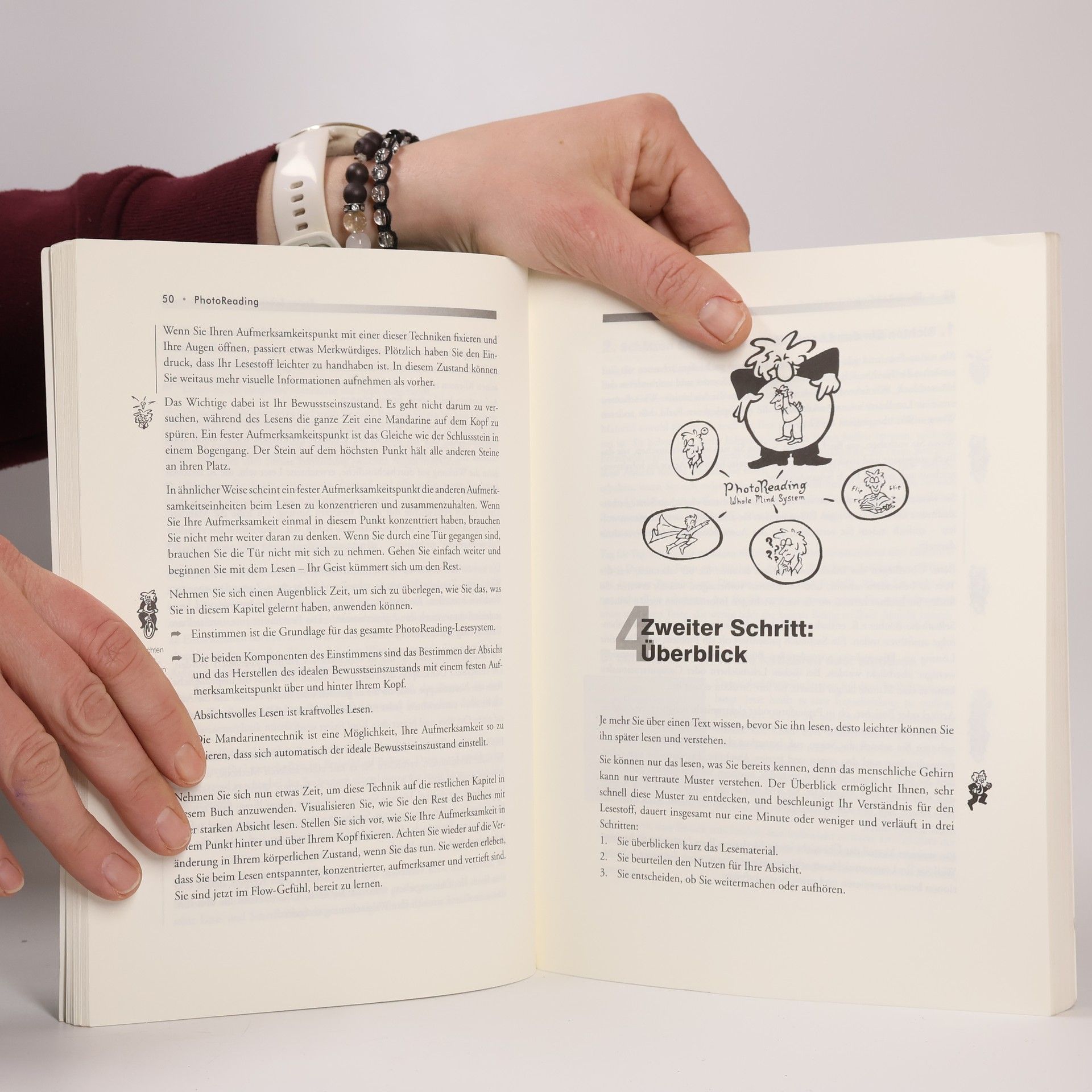Das Kernstück des „PhotoReading Whole Mind System“ bildet eine Technik, durch die Texte mit einer Geschwindigkeit von 25.000 Worten pro Minute „mental fotografiert“ werden können. Anders als beim herkömmlichen Lesen schaut man dabei mit „PhotoFokus“ auf die Druckseite. Das auf diese Weise aufgenommene Material kann dann auf verschiedenen Wegen aktiviert, d. h. ins Bewusstsein gebracht werden. Die PhotoReading-Technik führt in Verbindung mit einer Reihe anderer fortgeschrittener Lesetechniken zu einer bemerkenswerten Beschleunigung und Steigerung des Verständnisses von gelesenem Material, zu einer Verbesserung der Behaltensleistung und zu leichterem Zugang auf bereits bestehendes Vorwissen.