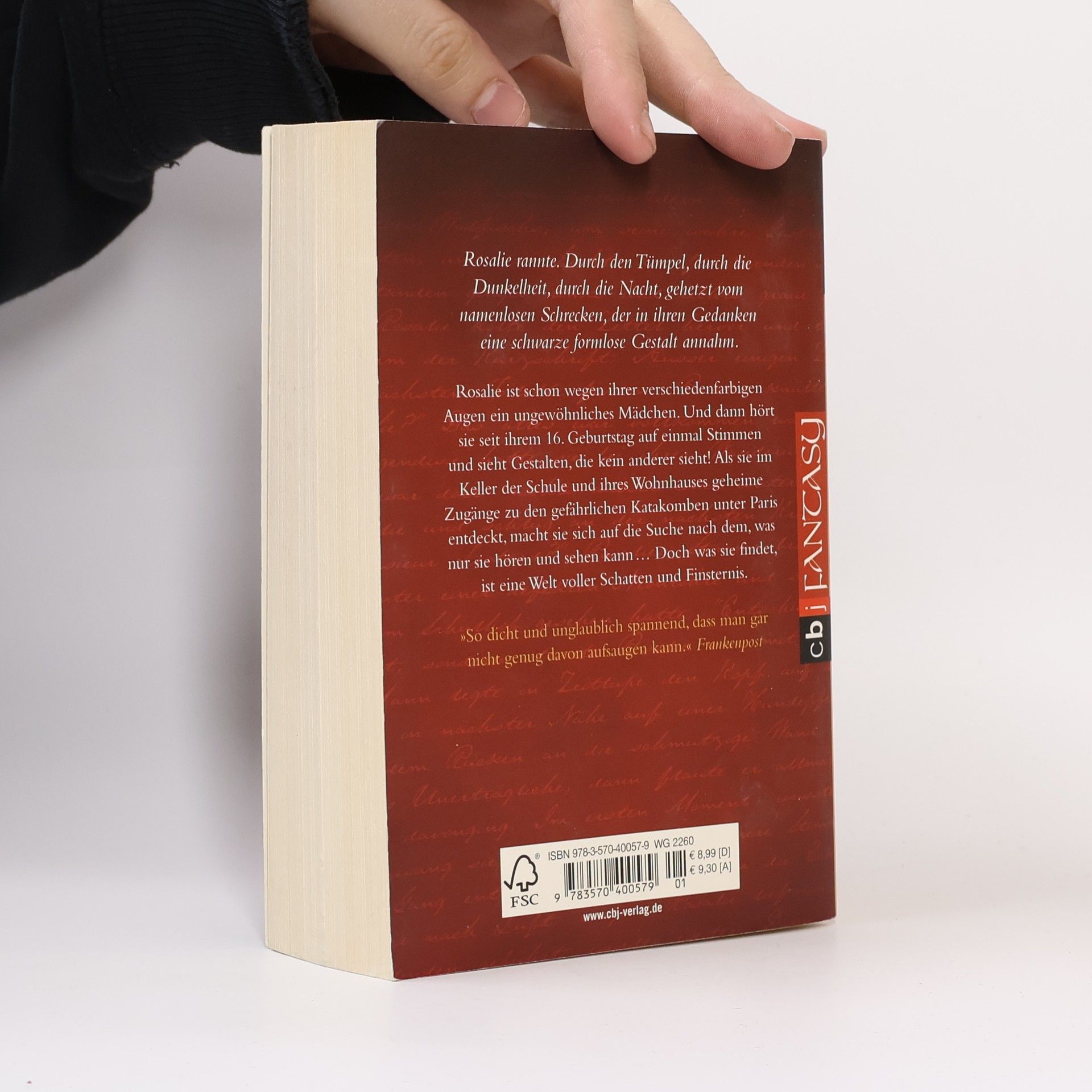 Eine geheimnisvolle Reise in die Schattenwelt unter den Straßen von Paris Rosalie ist schon wegen ihrer verschiedenfarbigen Augen ein ungewöhnliches Mädchen. Und dann hört sie seit ihrem 16. Geburtstag auf einmal Stimmen! In der Schule und zu Hause. Und sie sieht Gestalten, die kein anderer sieht. Als sie im Keller der Schule und ihres Wohnhauses geheime Zugänge zu den gefährlichen Katakomben unter Paris entdeckt, macht sie sich auf die Suche nach dem, das nur sie hören und sehen kann …