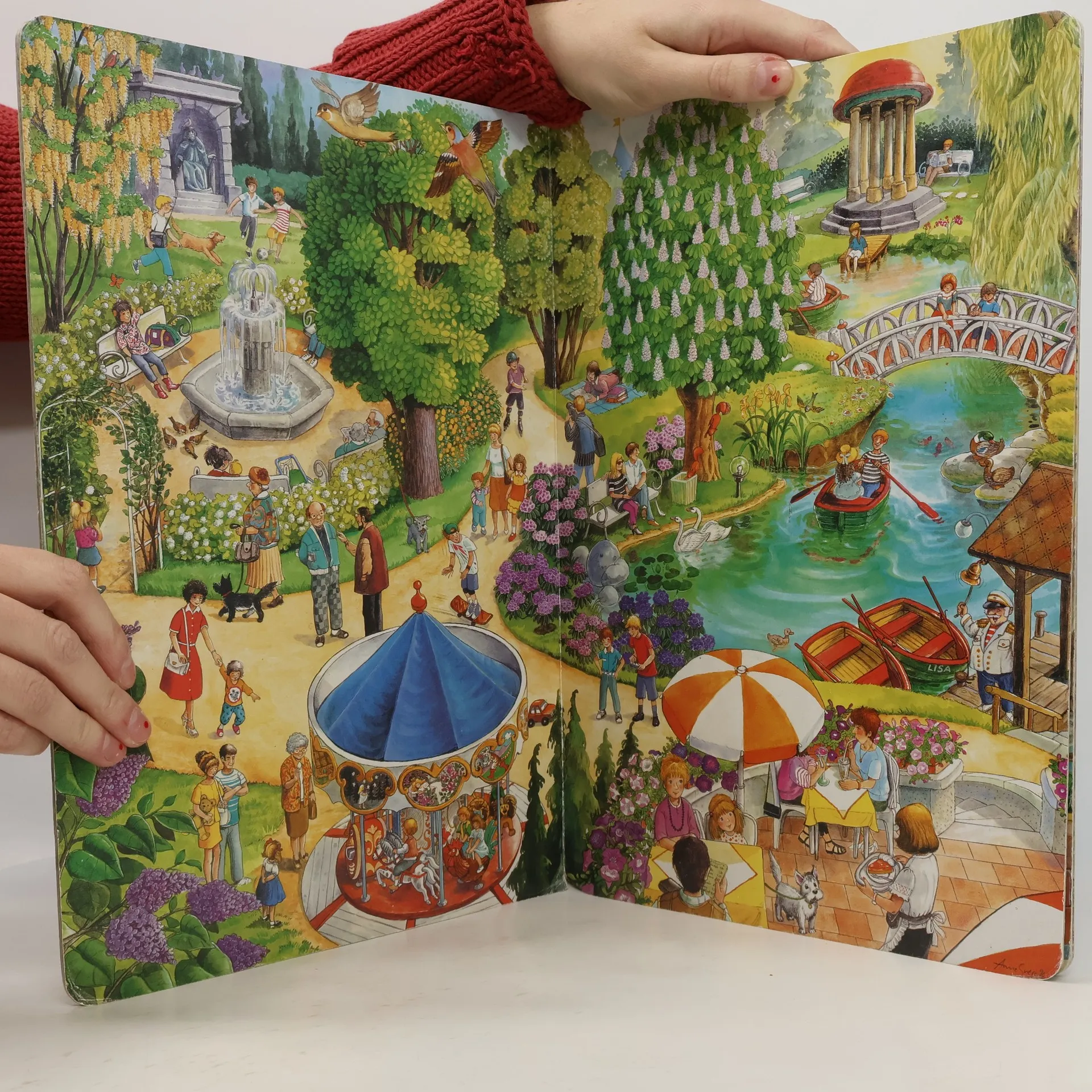 Celoobrázková publikace s velkým množstvím detailů dětem představí oblíbený kolotoč v parku, krmení tučňáků v zoo, výlet do lesa a spoustu dalších činností a věcí.