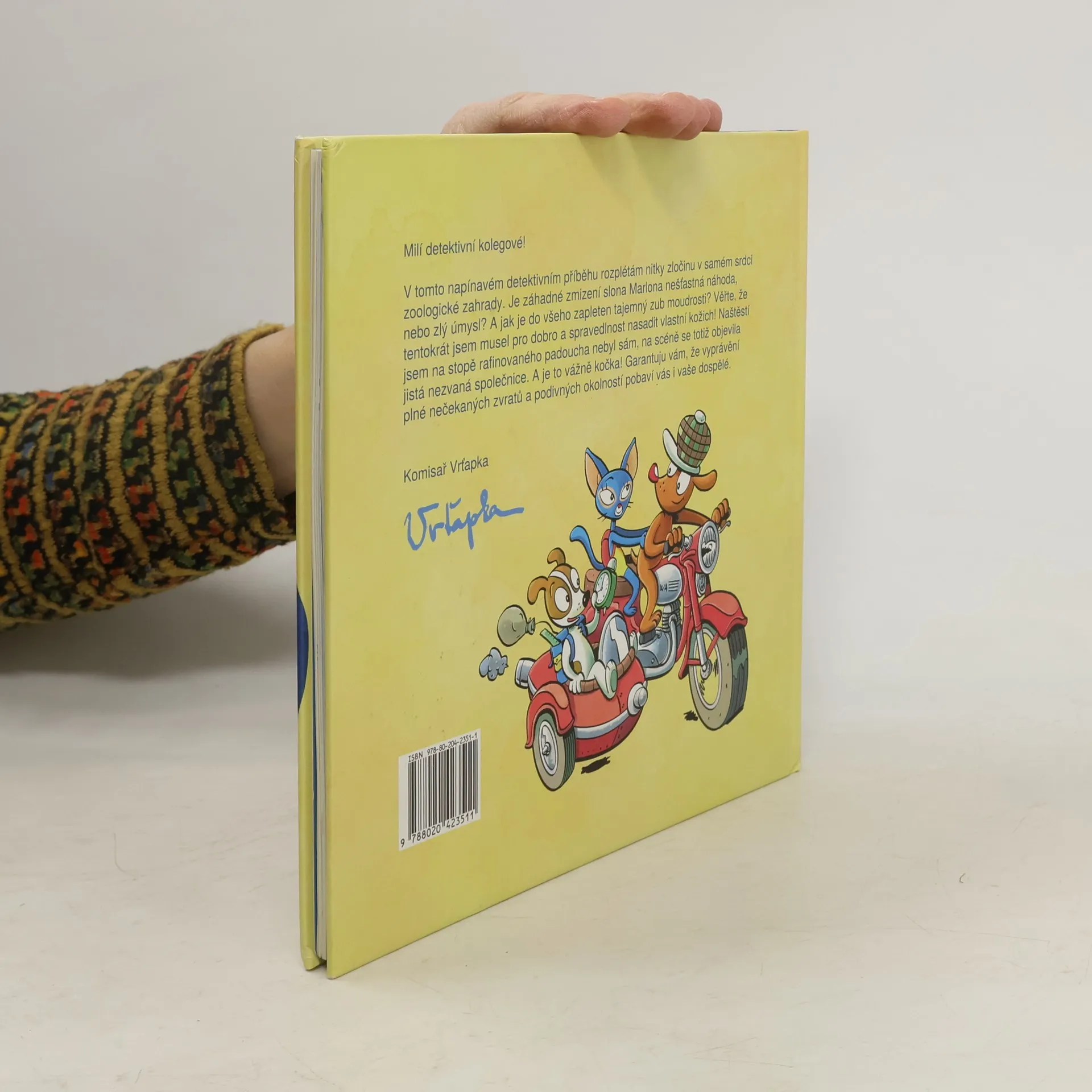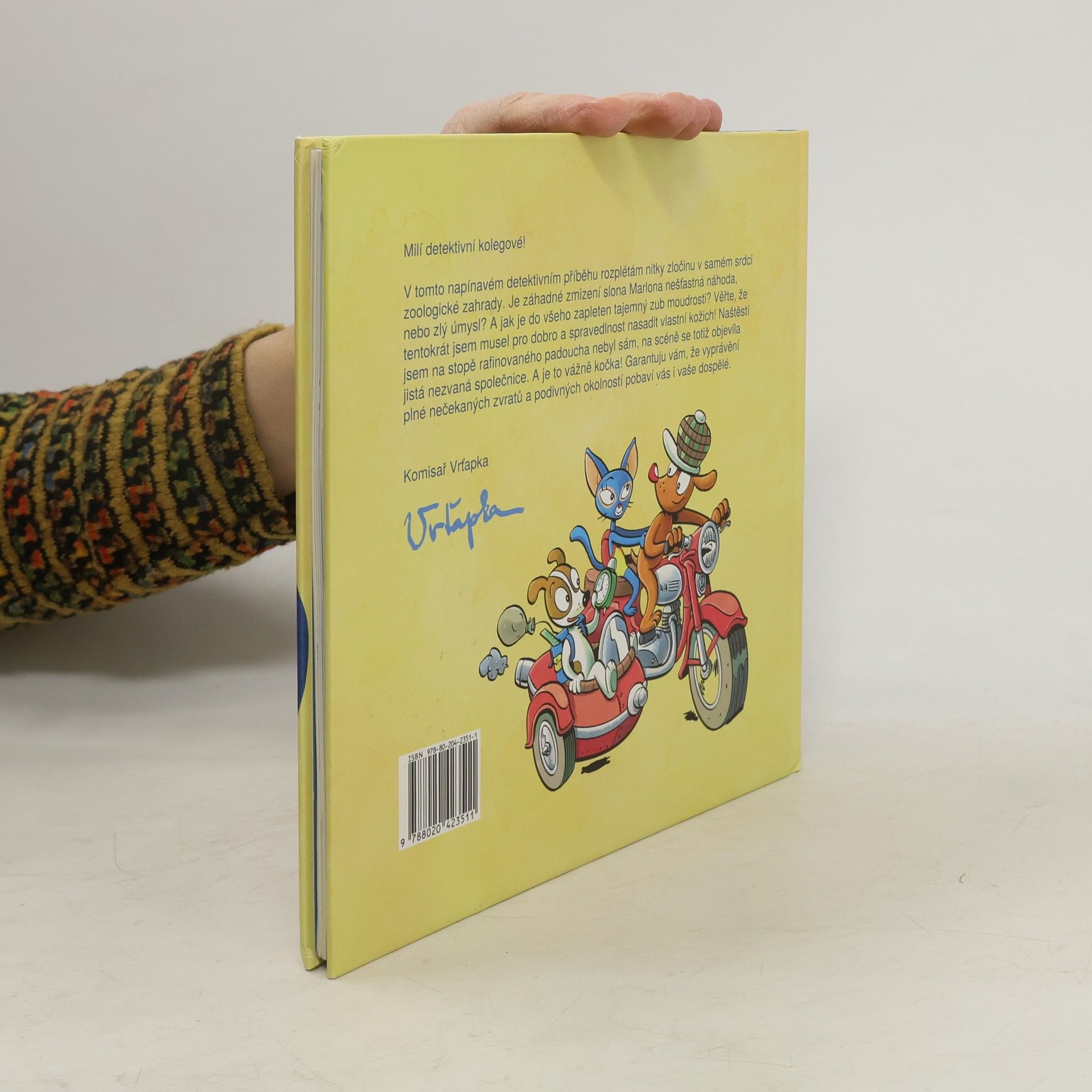 Slavný hrdina tentokrát přichází s něčím opravdu nevídaným! První dobrodružný příběh komisaře Vrťapky v podobě dětské detektivky s komiksovými ilustracemi. V napínavém příběhu Vrťapka rozplétá nitky zločinu v samém srdci zoologické zahrady. Je záhadné zmizení slona Marlona nešťastná náhoda, nebo zlý úmysl? A jak je do všeho zapleten tajemný zub moudrosti? Mějte na paměti, že komisař Vrťapka tentokrát pro dobro a spravedlnost nasazuje vlastní kožich. Naštěstí není věhlasný detektiv na stopě rafinovaného padoucha sám, v patách má nezvanou společnici. A je to vážně kočka! Příběh plný nečekaných zvratů a podivných okolností pobaví malé i velké čtenáře. Tak vzhůru za případy, ať nám nevychladne stopa!