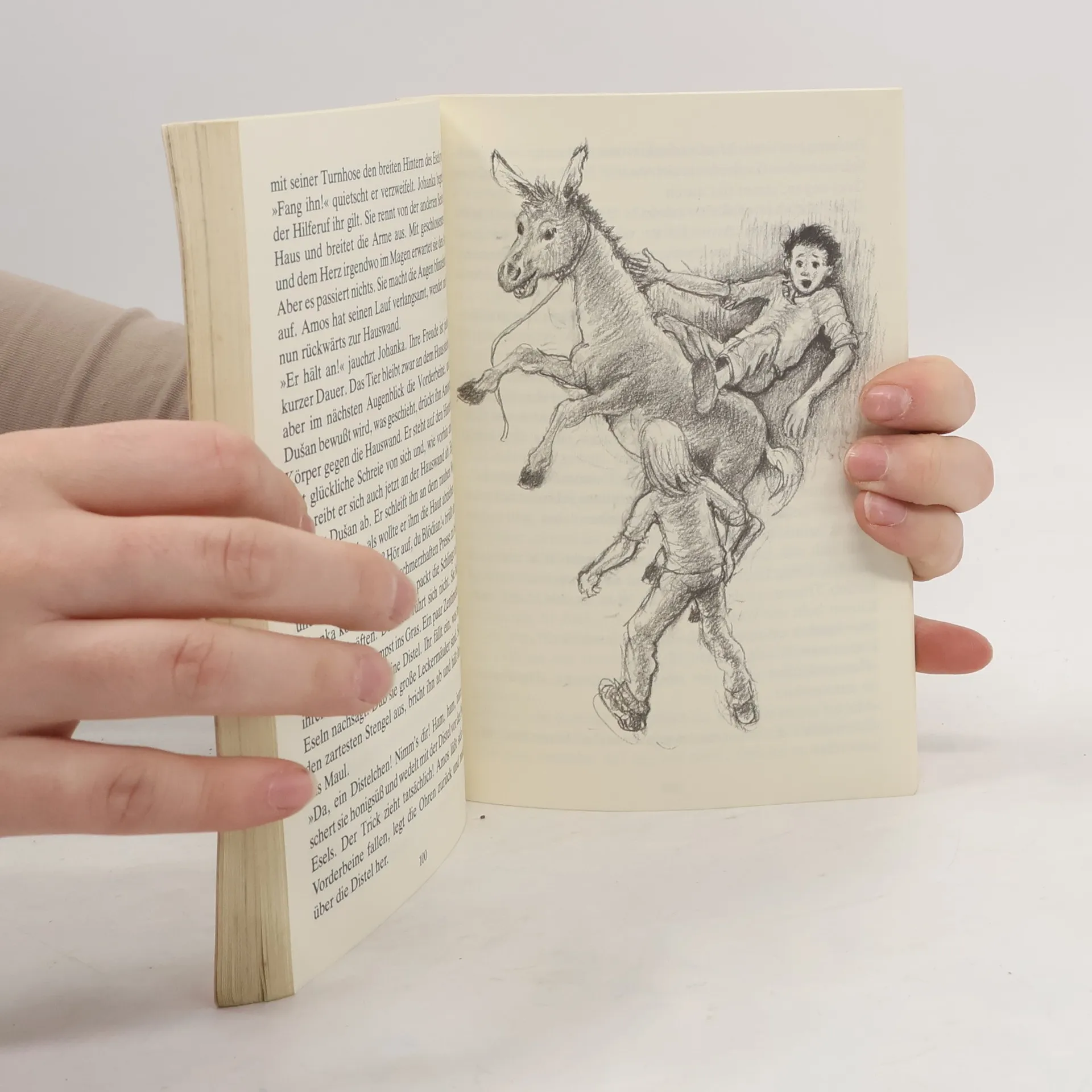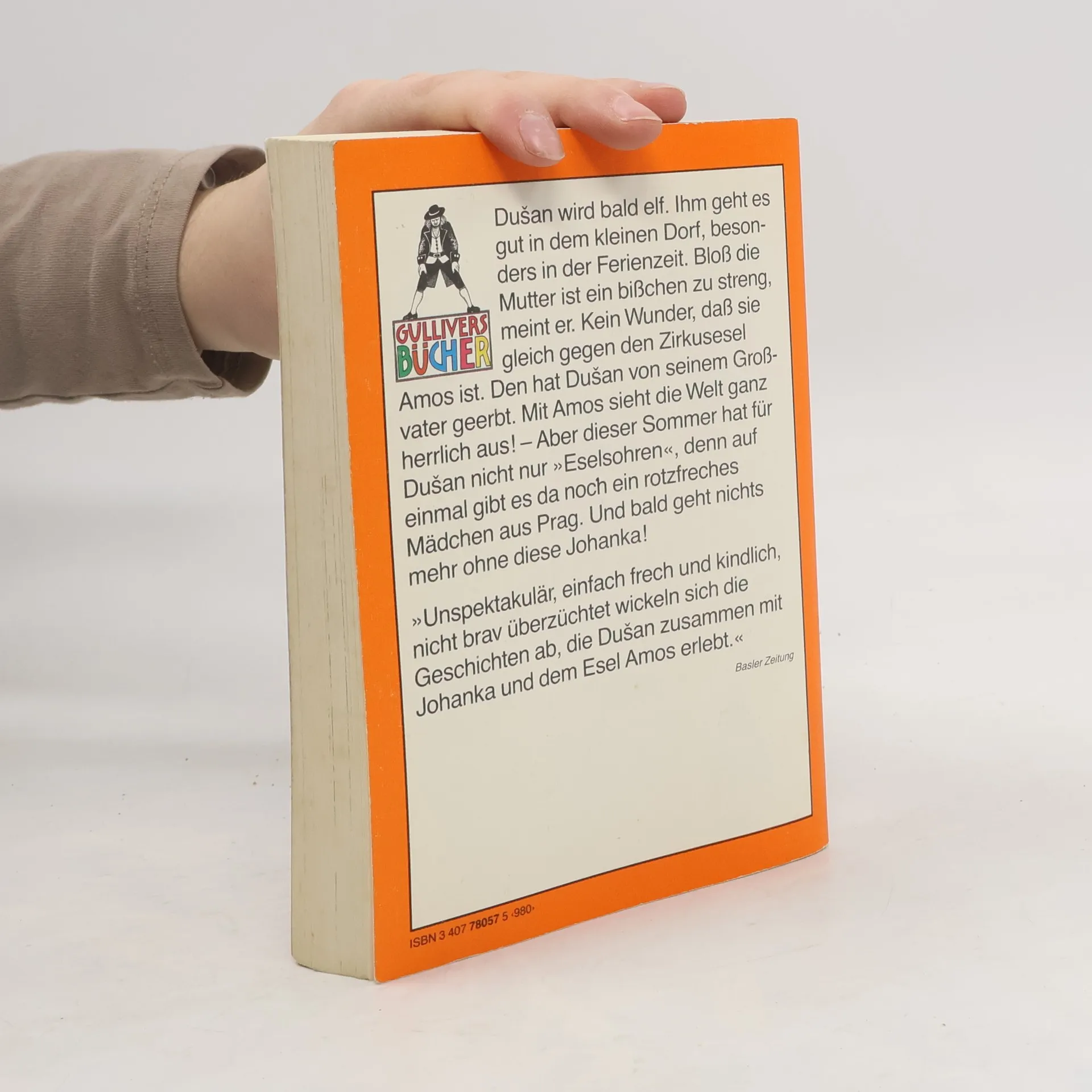 Eine tschechische Kindersommergeschichte. Dusan wird bald elf. Ihm geht es gut in dem kleinen Dorf, besonders in der Ferienzeit. Bloß die Mutter ist ein bißchen zu streng, meint er. Kein Wunder, daß sie gleich gegen den Zirkusesel Amos ist. Den hat Dusan von seinem Großvater geerbt. Mit Amos sieht die Welt ganz herrlich aus! - Aber dieser Sommer hat für Dusan nicht nur „Eselsohren“, denn auf einmal gibt es da noch ein rotzfreches Mädchen aus Prag. Und bald geht nichts mehr ohne diese Johanka!