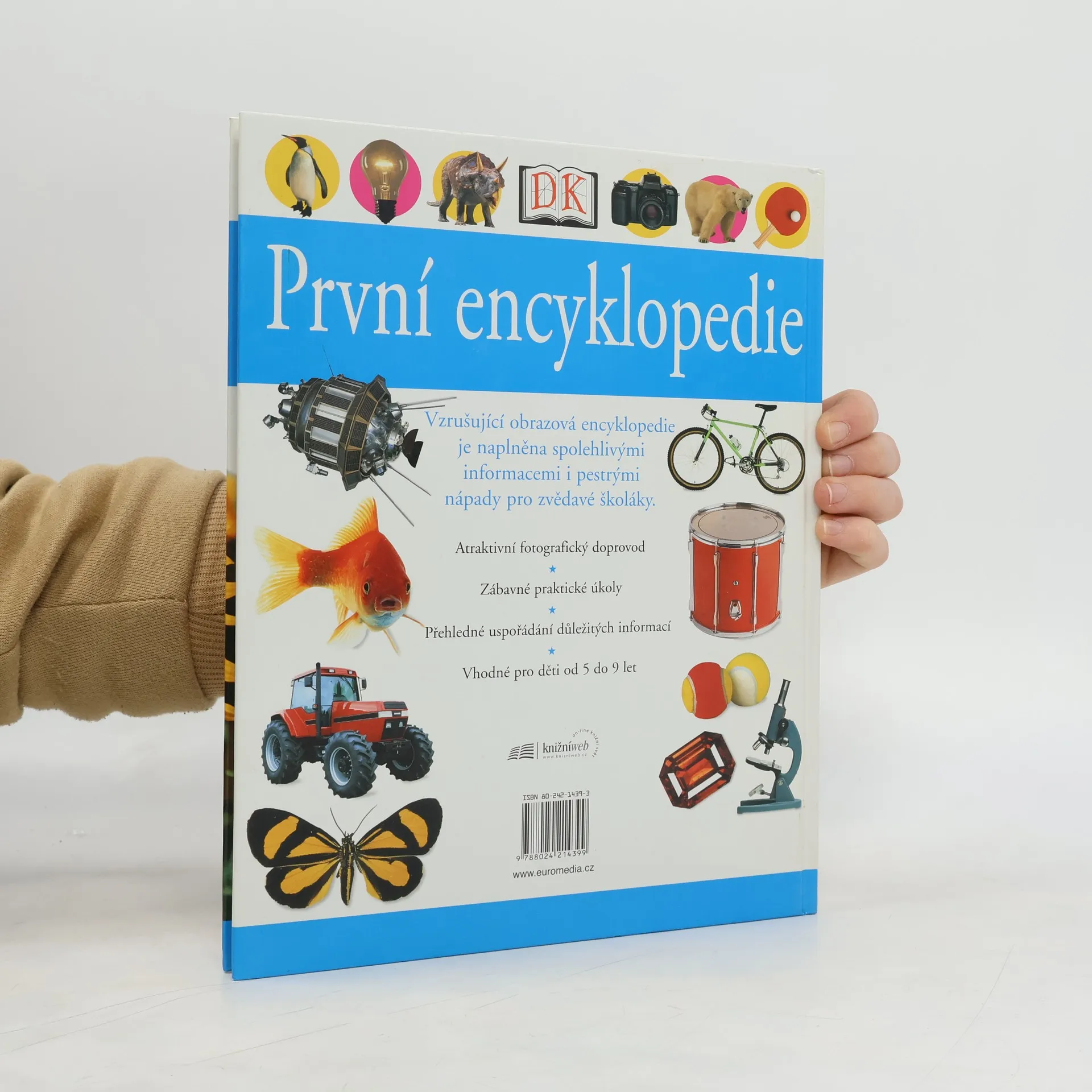 První encyklopedie seznamuje malé čtenáře s mnoha zajímavými fakty ze všech oblastí. Předkládá informace moderním způsobem, díky němuž dítě snadno najde, co potřebuje. Každá dvojstránka je zábavná, pestrá a přehledná. Výborné fotografie rozvíjejí znalosti ze všech oborů od zeměpisu a přírodopisu k dávné historii, světovým náboženstvím či moderním technologiím. Kapitoly doplňují zábavné praktické úkoly, které prohlubují zájem dětí o dané téma. Kniha je vhodná pro děti od 5 do 9 let.